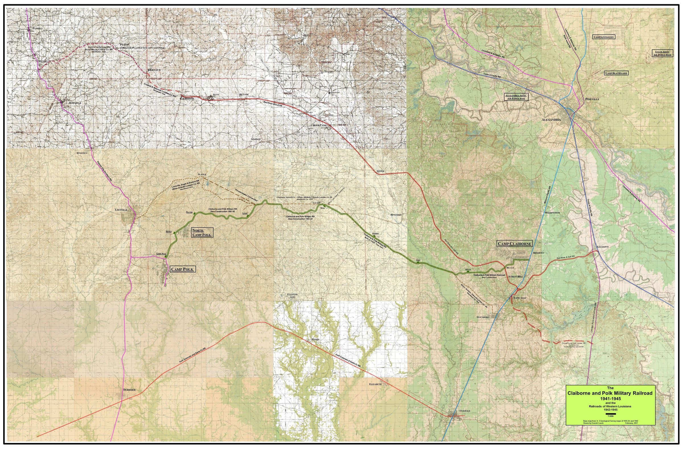 railroad map of the Claiborne and Polk Military railroad and the railroads of Western LA; showing the three routes from Camp Claiborne to Camp PolkContext