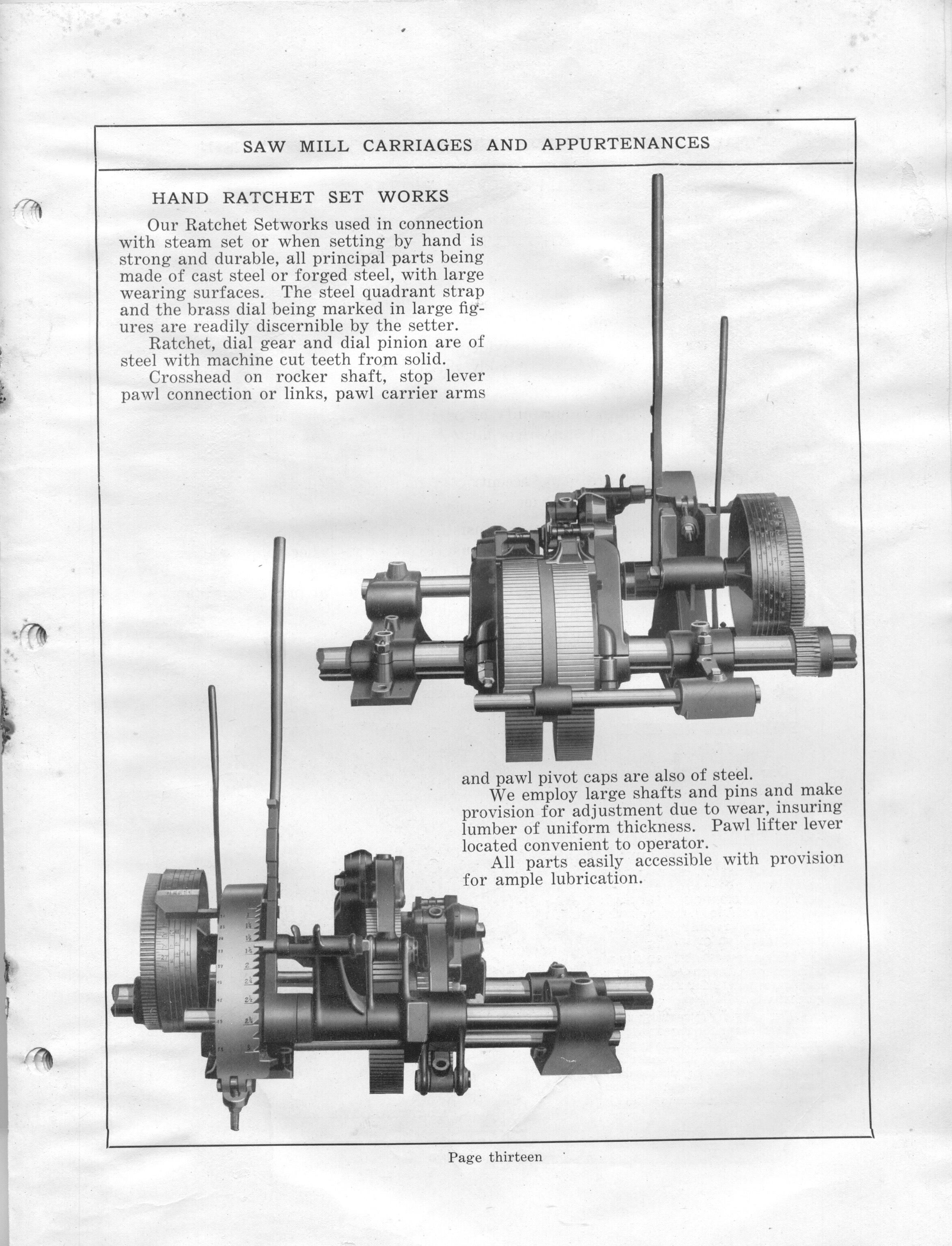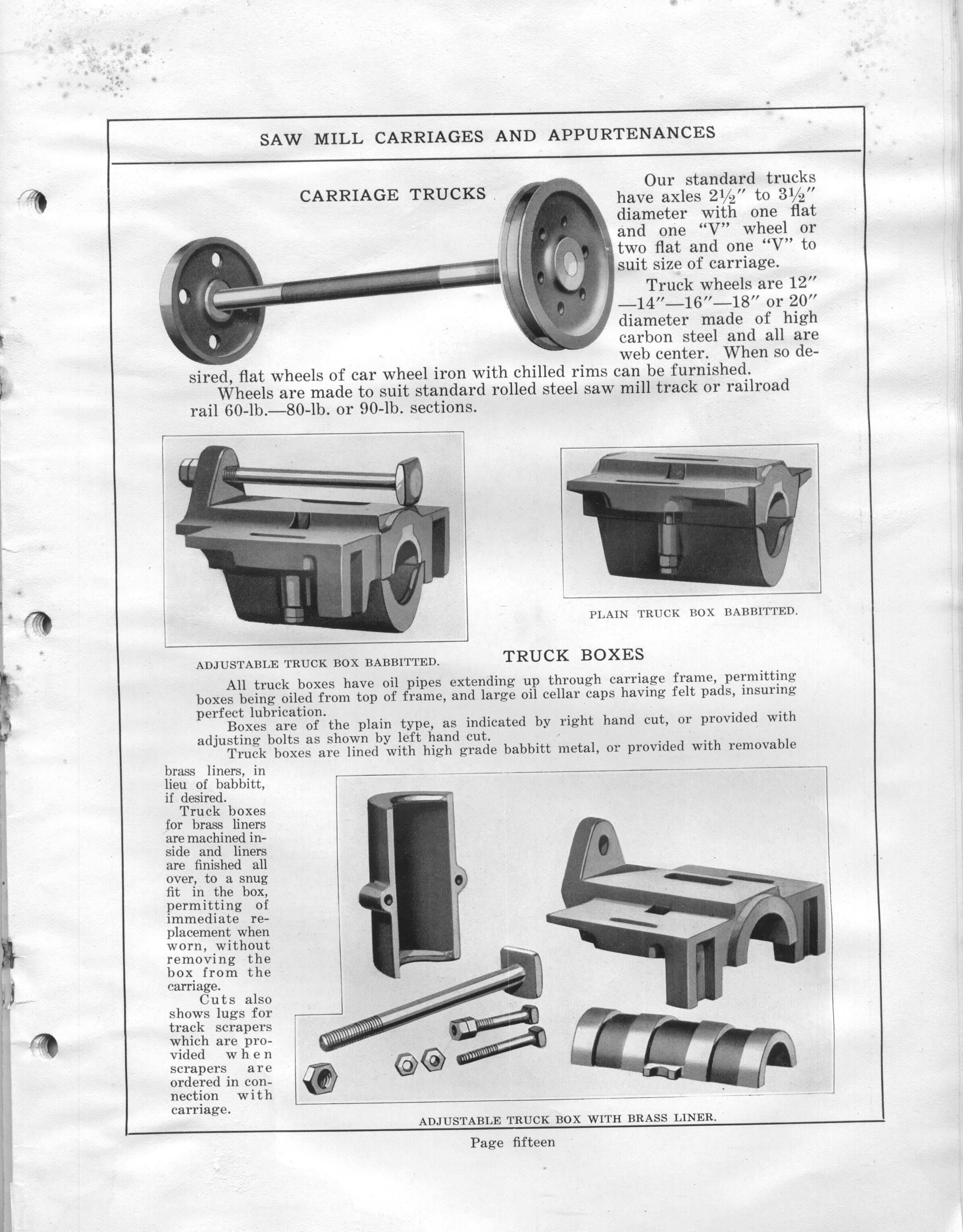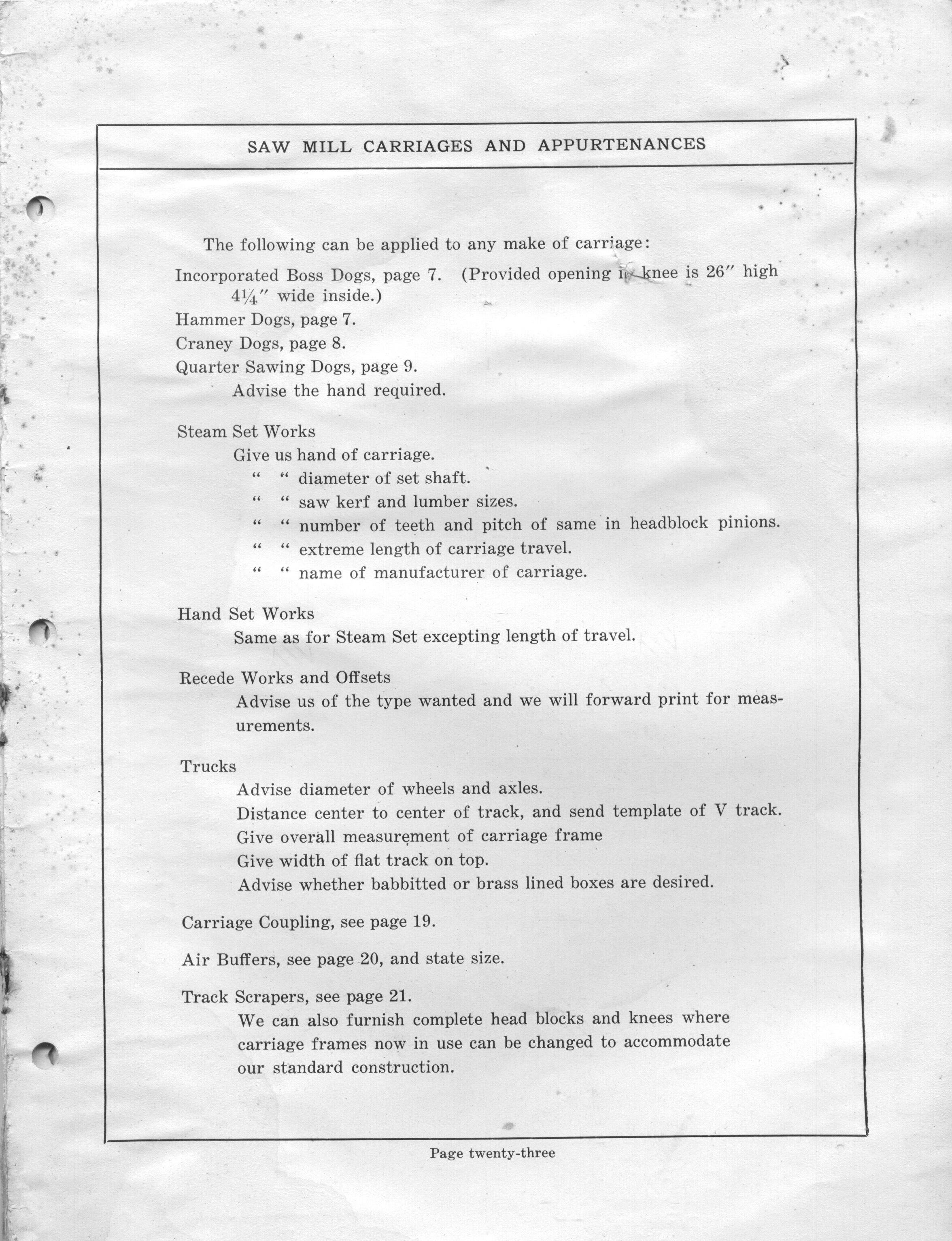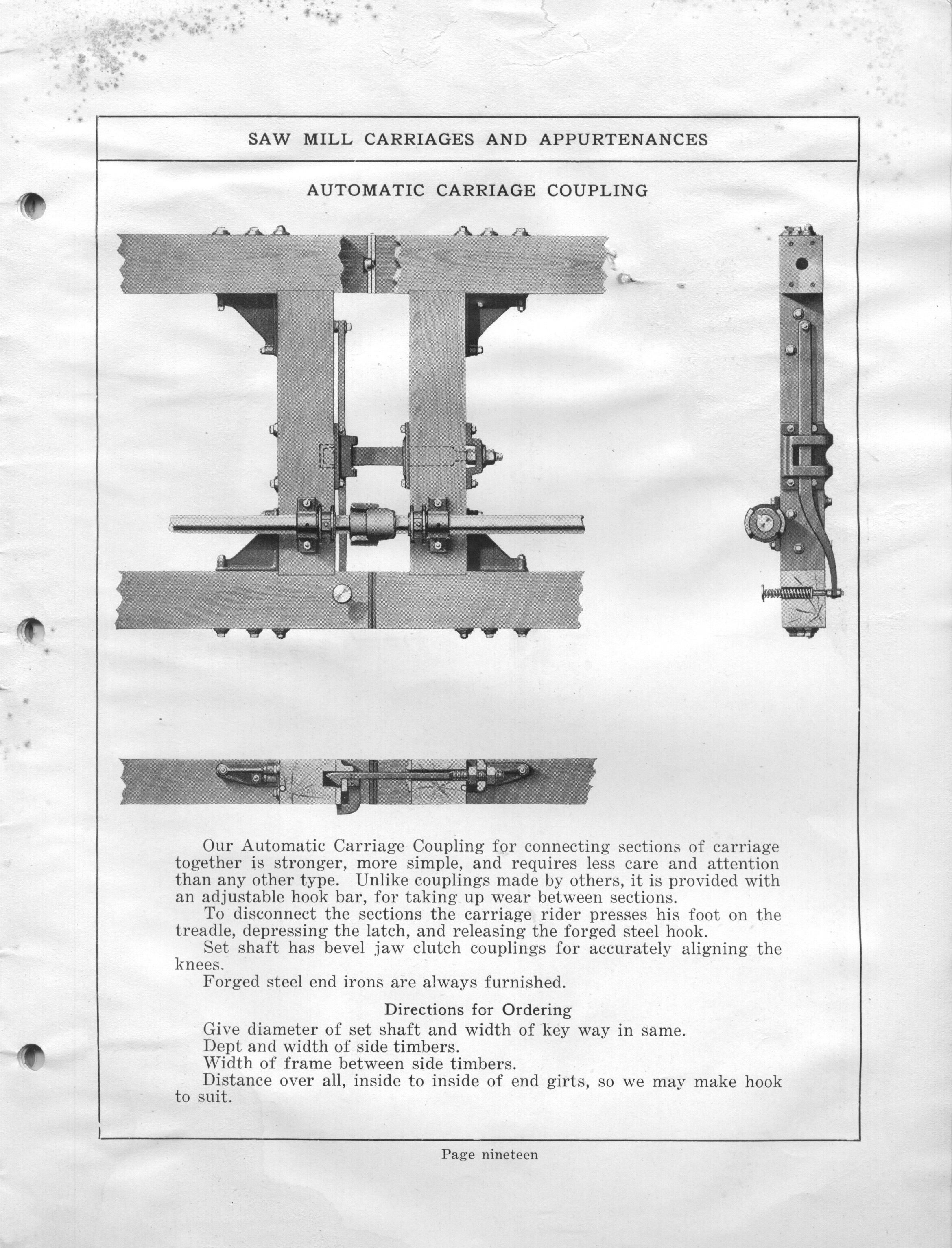 features: Saw mill carriage, Carriage frames, Headblocks and knees, Headblock, knee improved dog and fender bar, Short nose block and knee lip, Cross section through knee incorporated dog, rear end of head black and taper attachment, Boss dog, Hammer dog, Special quarter sawing dog, Steam and ratchet set works, Hand ratchet set works, Steam recede works, Friction recede works, Carriage trucks, Truck boxes, Latest improved automatic offset, Track offset, Automatic carriage coupling, Carriage buffers, Track scrapers, Carriage trackContext