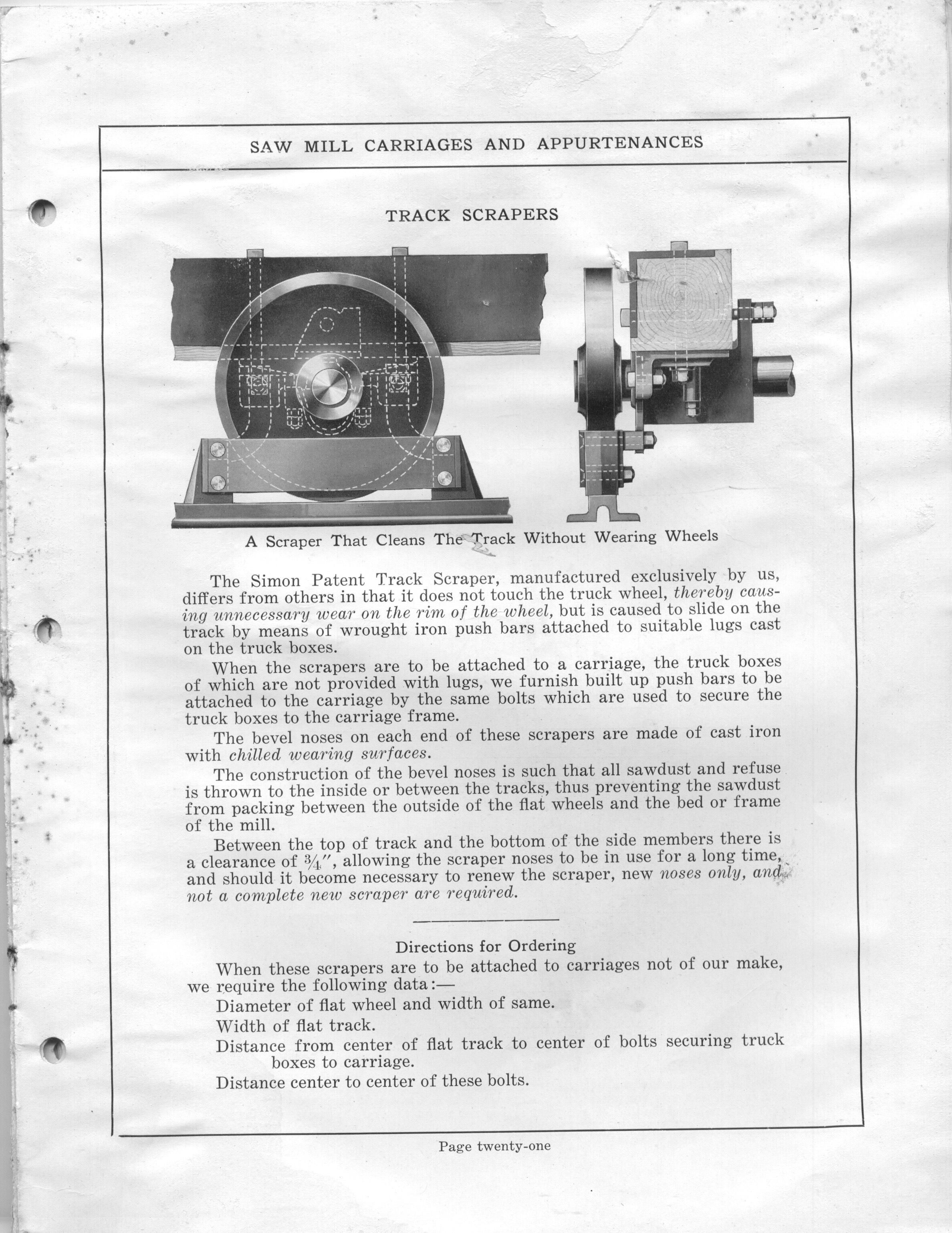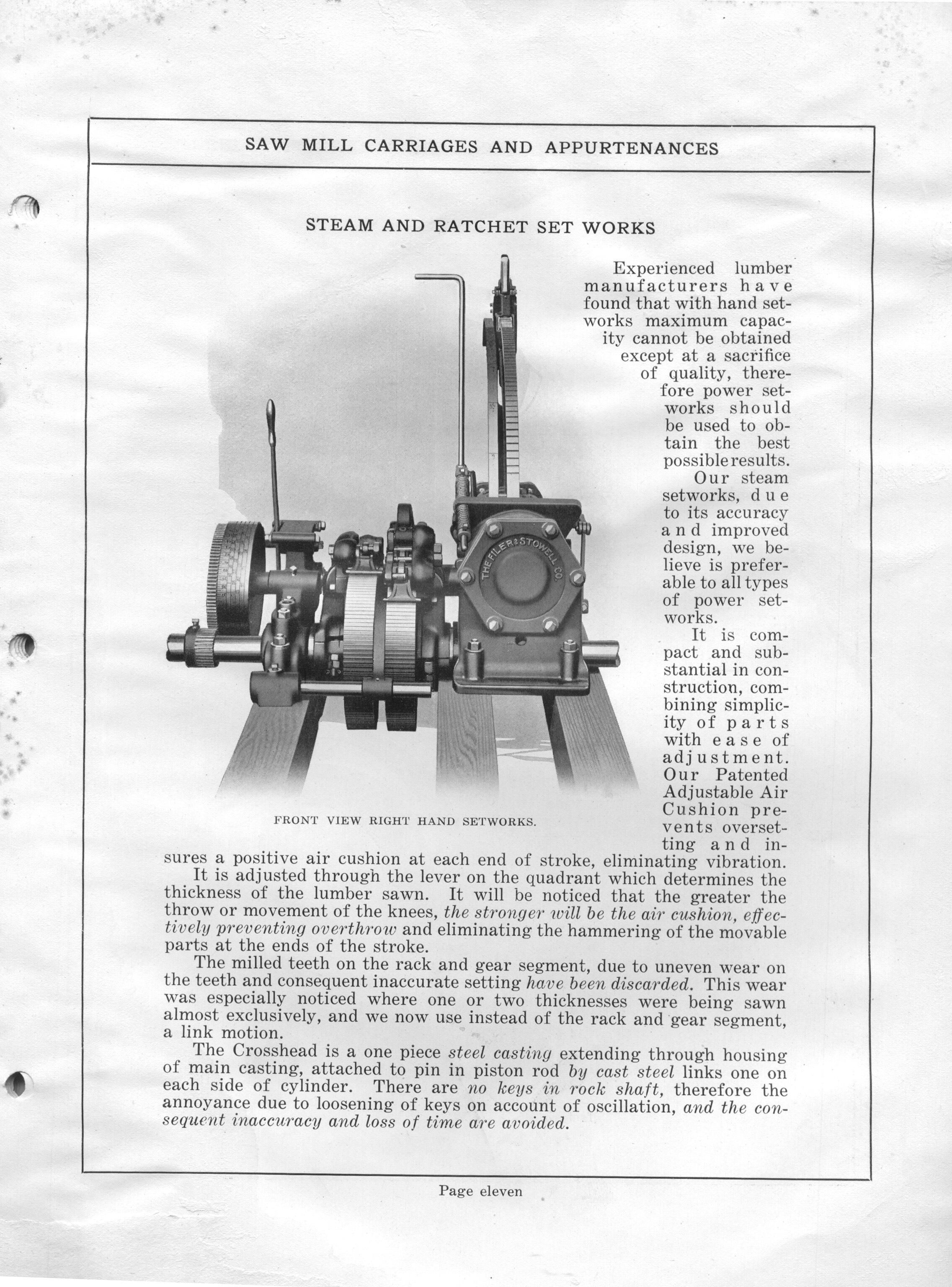 builders of saw mill machinery: Band mills, Band resaws, Circular mills, Gang mills, Cunningham twin engine steam feeds, Direct acting shot gun steam feeds, carriages, Steam set works, Offsets, Boss dogs, Log jackers, Centre decks, Log turners, Steam niggers, Gang edgers, trimmers, Slab slashers, Lath machinery, Conveyor chains, Gearing, Shafting, Pulleys, Boxes, Frictions, Circular saw guides, and Heavy saw mill engines