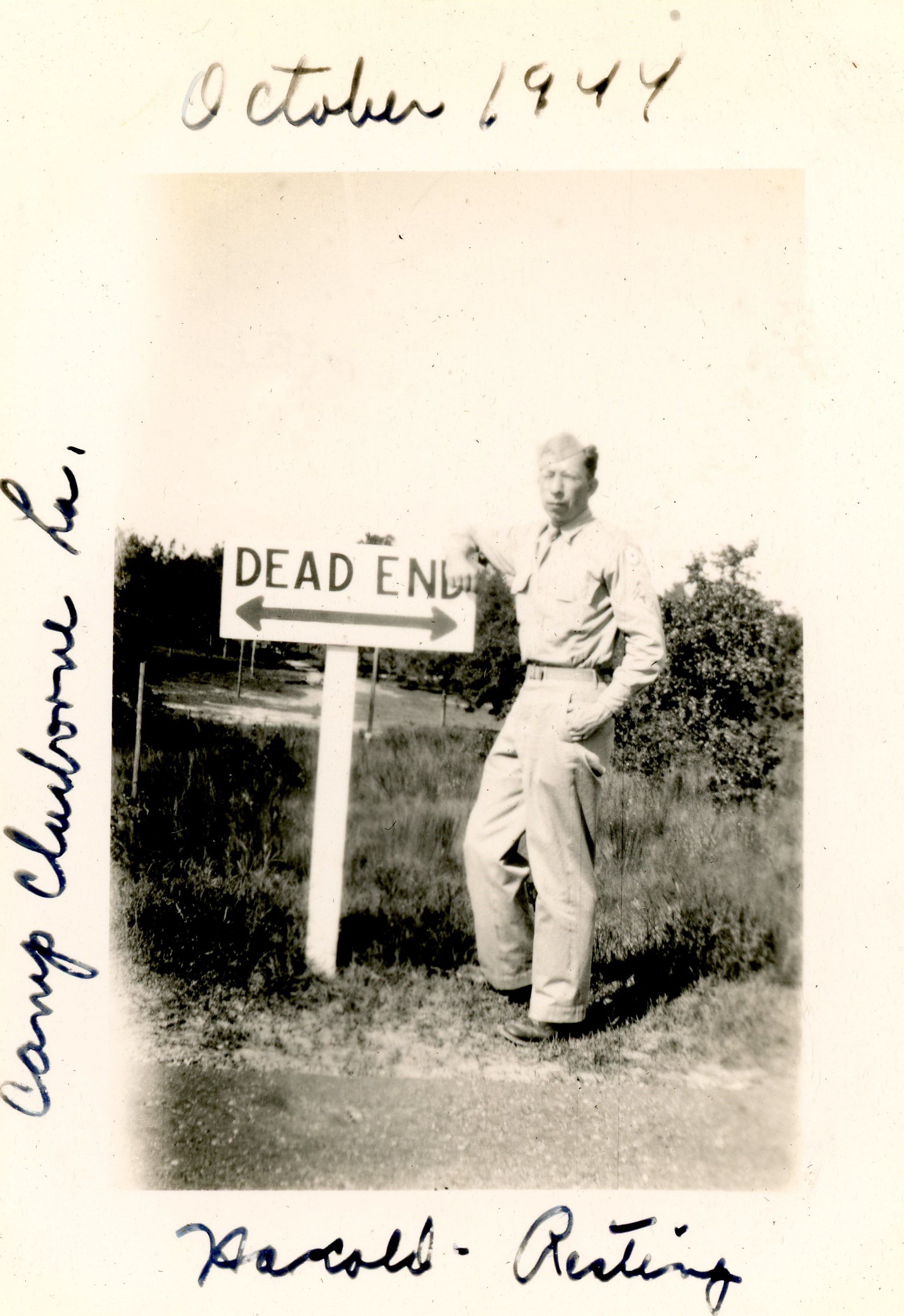 Photo of Harold Brock standing next to a sign reading "DEAD END" at Camp Claiborne Louisiana, October 1944.Photograph Details