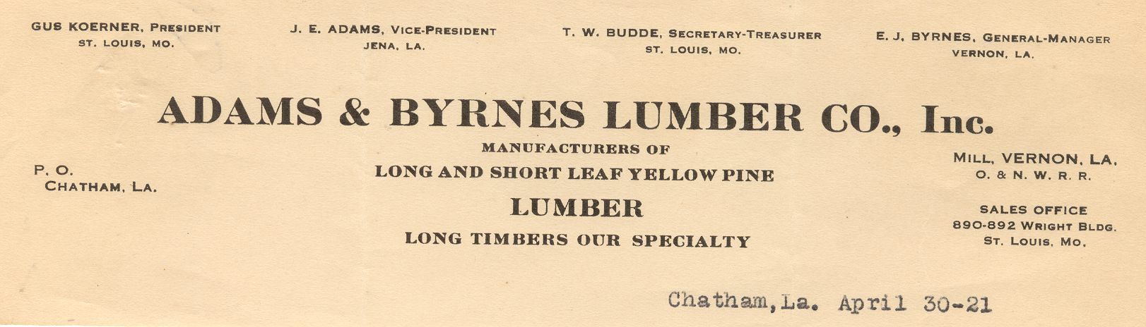 Adams & Byrnes Lumber Company began operations in Chatham, Louisiana. The company focused on developing Yellow Pine Lumber and Timber. However, the company was forced to shut down due to resources drying up in the local area.Collection