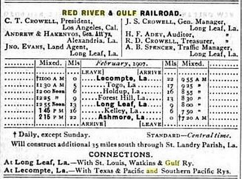 the officials in 1907 were C. T. Crowell president in Los Angles, Andrew & Hakenyos general attorneys in Alexandria, John Evans land agent in Long Leaf, J. S. Crowell general manager in Long Leaf, H. F. Adev auditor in Long Leaf, R. D. Crowell treasurer in Long Leaf, and A. B. Spencer traffic manager in Long Leaf;