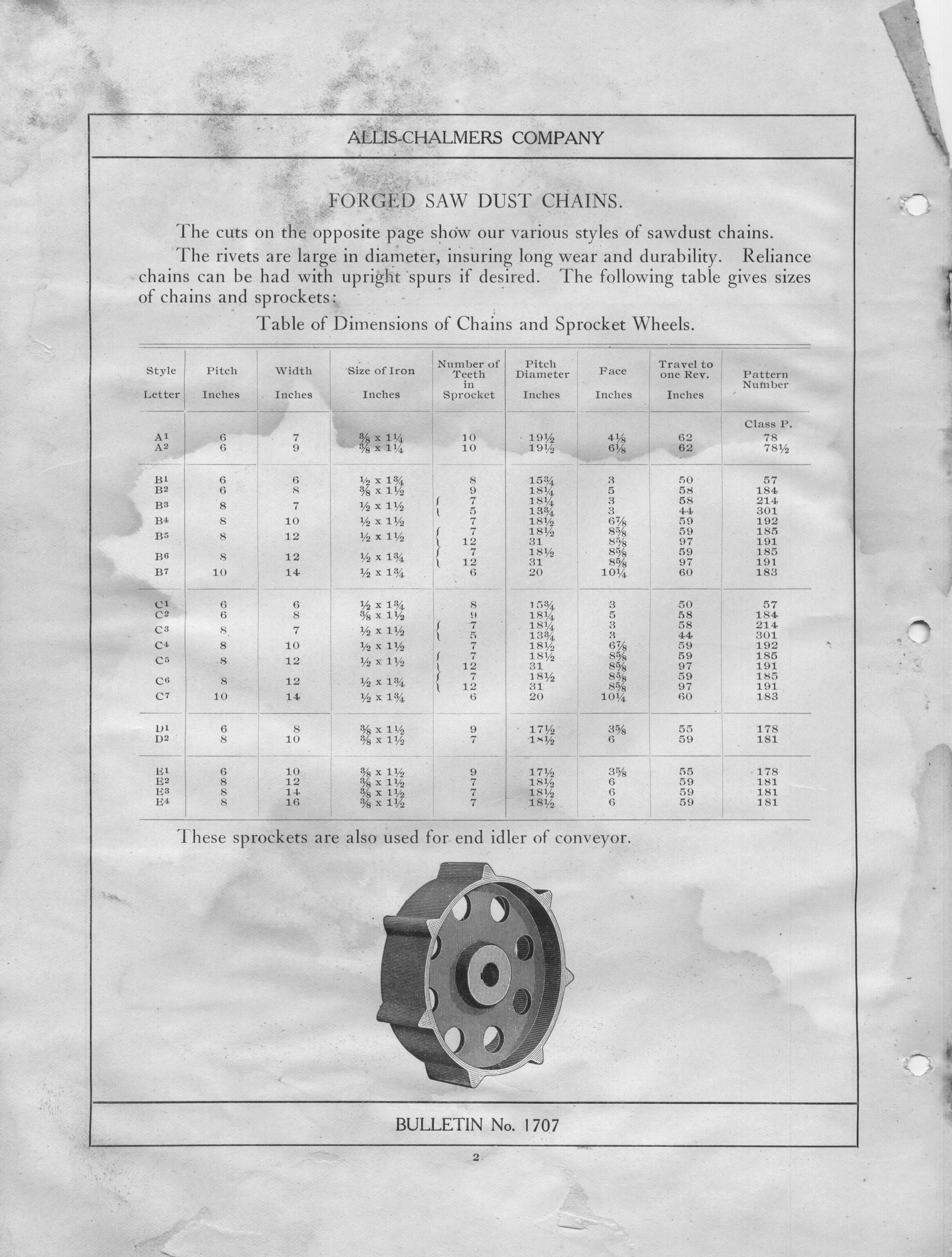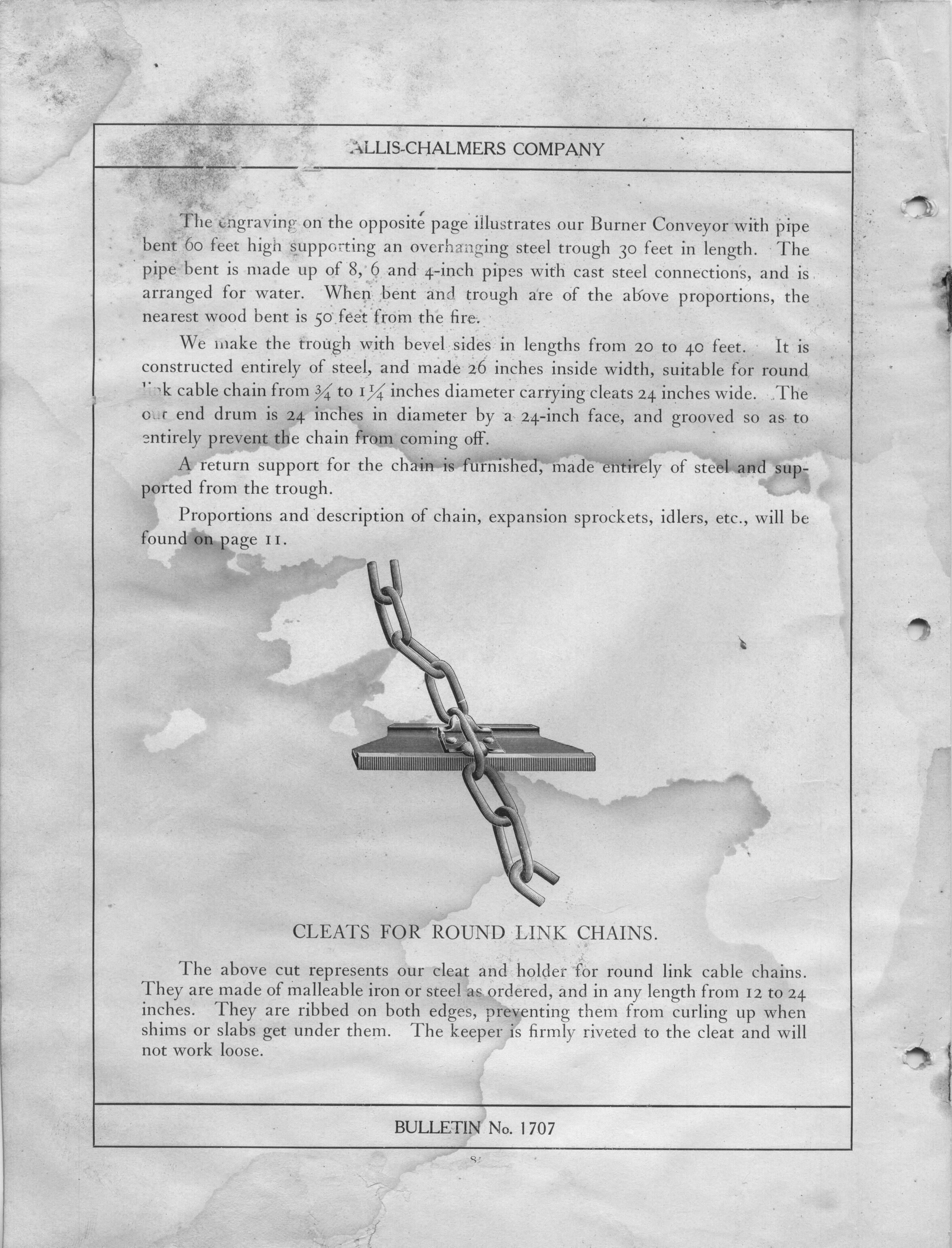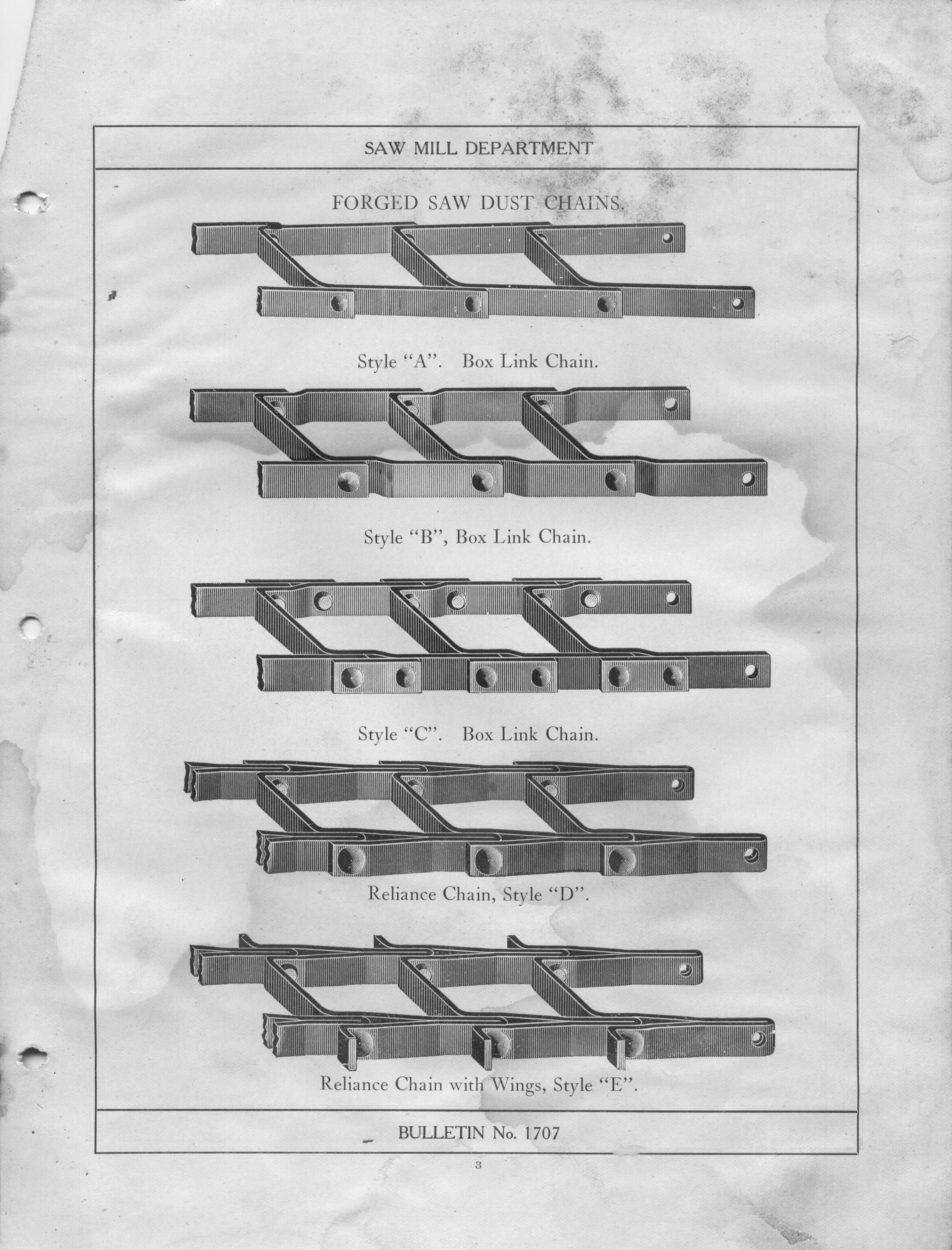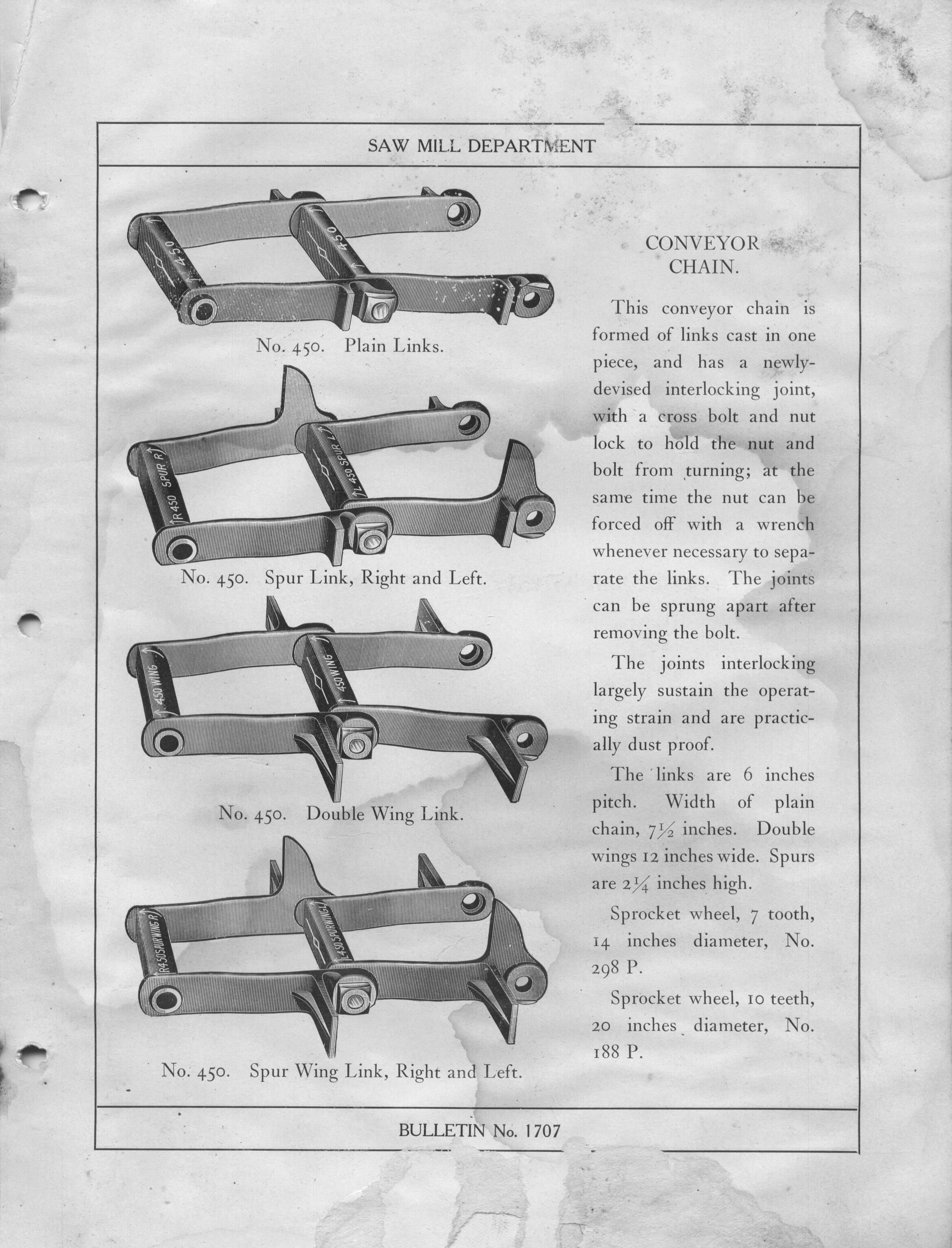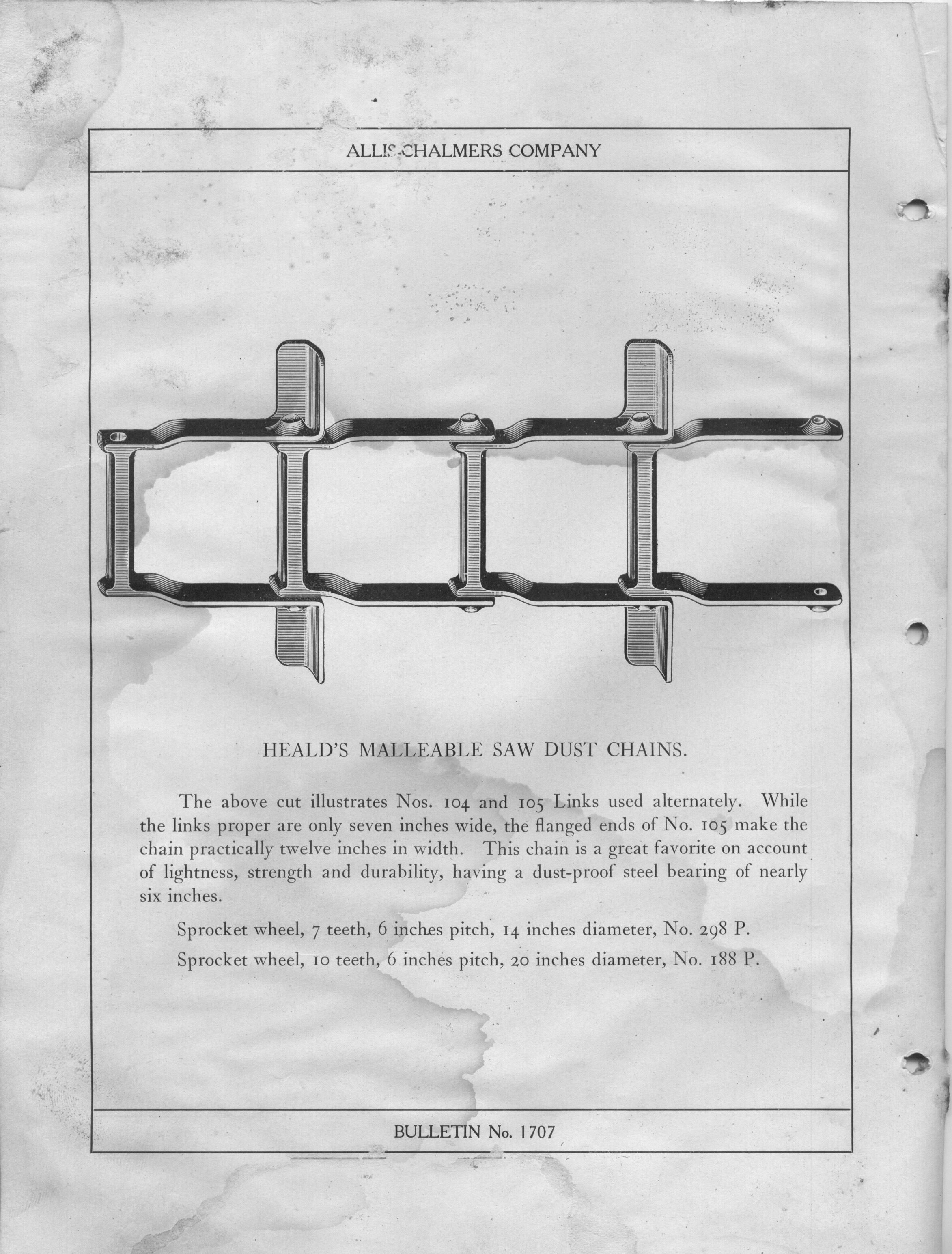 Out of New Orleans District company; features: Forged saw dust chains: sprockets, style "A-E" box link chain, Heald's malleable saw dust chains, Conveyor chain: No. 450-plain links, spur links, double wing links, and spur wing links, No. 550 detachable saw dust chain and sprocket wheels, No. 500 transfer chain, Automatic saw dust or fuel feeder to boiler furnaces, Cleats for round link chains, Refuse and slab conveyor to burner or fire pit, Expansion sprocket, Idler drum for round link chains; last two pages ripped badlyContext