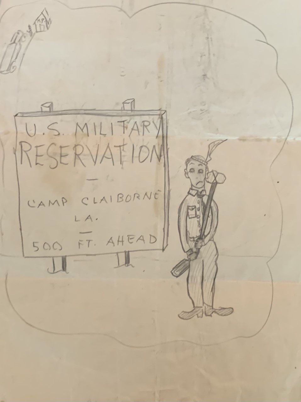 This hand-drawn representation of a U.S. Military Reservation at Camp Claiborne, LA sign shows how a soldier or worker at Camp Claiborne, or a soldier or worker's family drawing the sign.Context