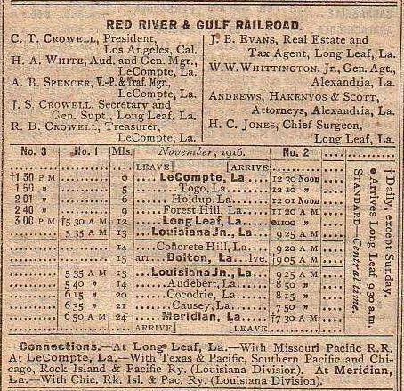 the officials in 1916 were C. T. Crowell president in Los Angeles, H. A. White auditor and general manager in Lecompte, A. B. Spencer vice president and traffic manager in Lecompte, J. S. Crowell secretary and general superintendent in Long Leaf, R. D. Crowell treasurer in Lecompte, J. B. Evans real estate and tax agent in Long Leaf, W. W. Whittington jr. general agent in Alexandria, Andrews, Hakenyos & Scott attorneys in Alexandria, and H. C. Jones chief surgeon in Long Leaf;