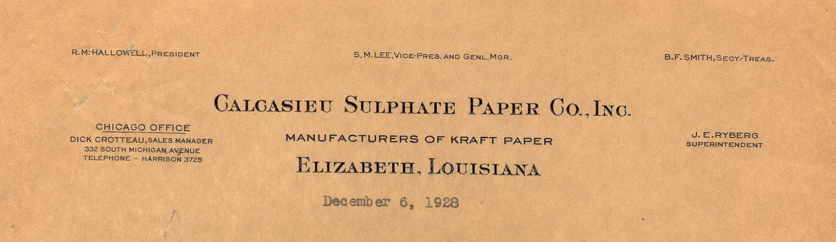 Letterhead from Calgasieu Sulphate Paper Co., Inc. Dec 6, 1928Context