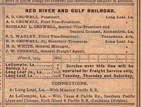 the officials in 1954 were R. D. Crowell president in Long Leaf, H. A. White general manager in Long Leaf, A. C. Crowell first vice president in Long Leaf, Richard L. Crowell second vice president and general counsel in Alexandria, S. L. Wadley third vice president in Texarkana, R. D. Crowell Jr. secretary-treasurer in Long Leaf and J. W. Terrell general freight agent in Long Leaf;