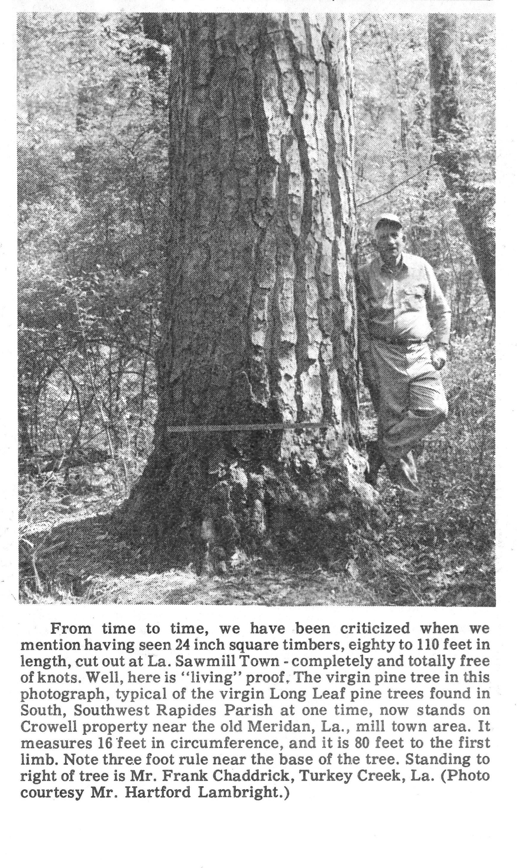 another photo of Frank Chaddrick (courtesy of Hartford Lambright) next to a virgin Long Leaf pine where the Meridian Lumber Co. lands wereContext