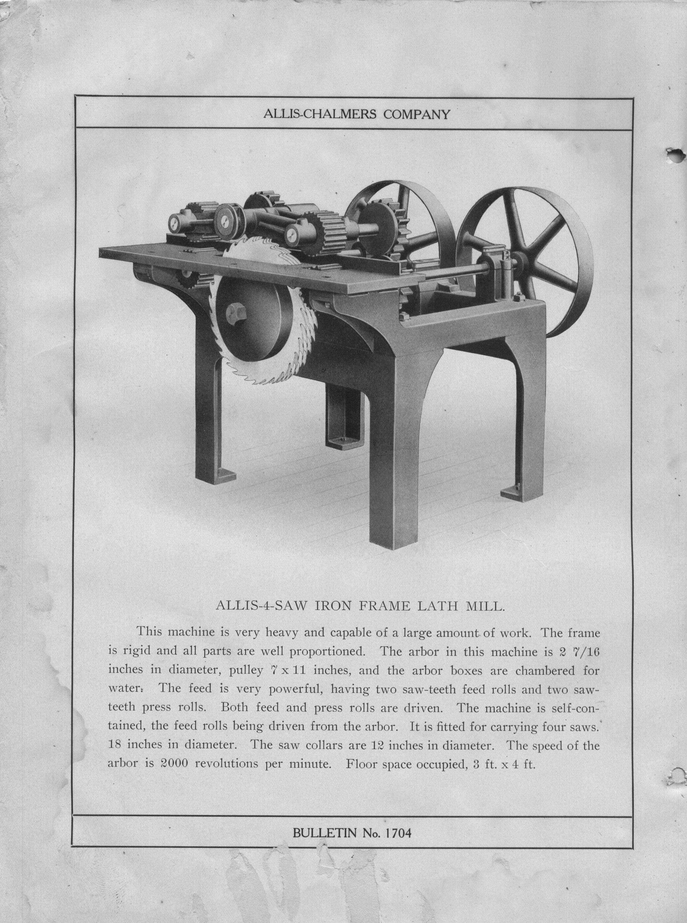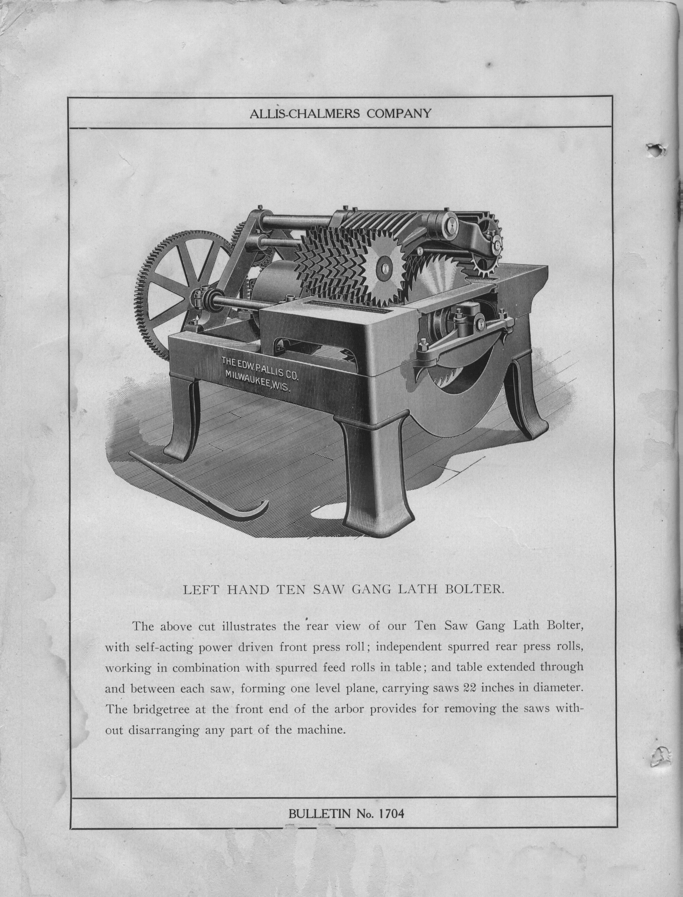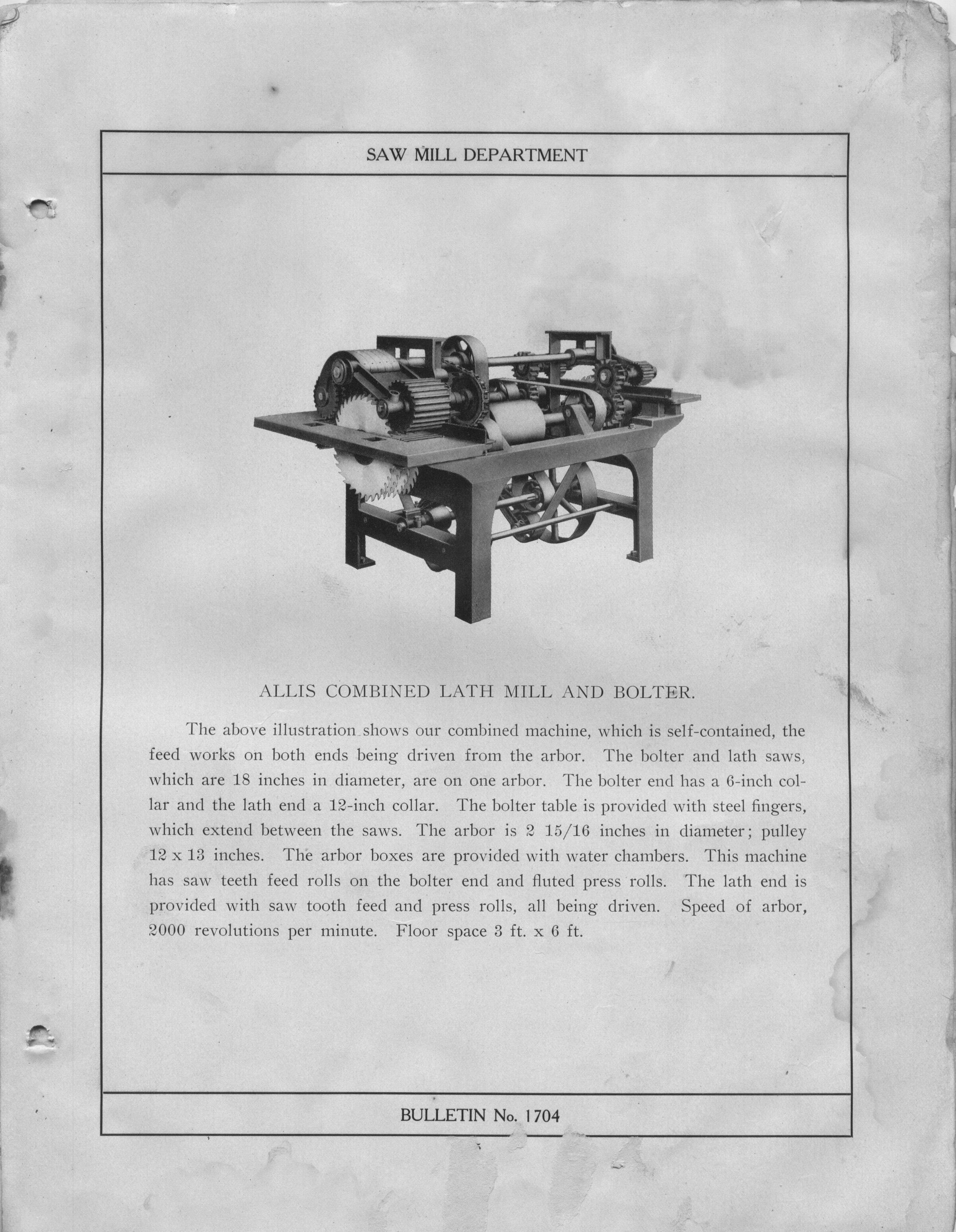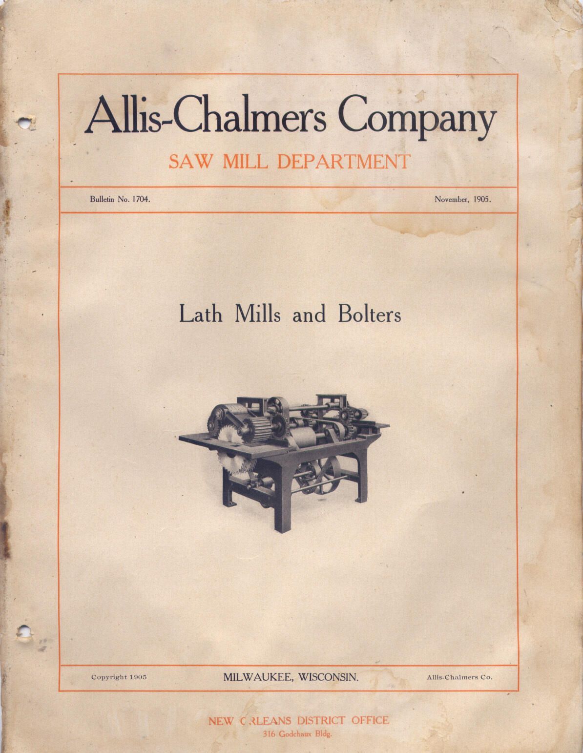 Out of the New Orleans District company; features: Four saw lath mill with improved press and feed rollers, "Reliance" four saw left hand gang lath mill, Allis-4-saw iron frame lath mill, Allis combined lath mill and bolter, Left hand ten saw gang lath bolter, New right hand Allis three saw bolter, and Left hand single saw self feed picket machine; back page of photos of Allis-Chalmers company's work of a electrical dept., Crushing and Cement Machinery, Mining Machinery, Sugar Machinery, Flour Mill and Saw Mill and Power transmission machinery, and West Allis WorksContext