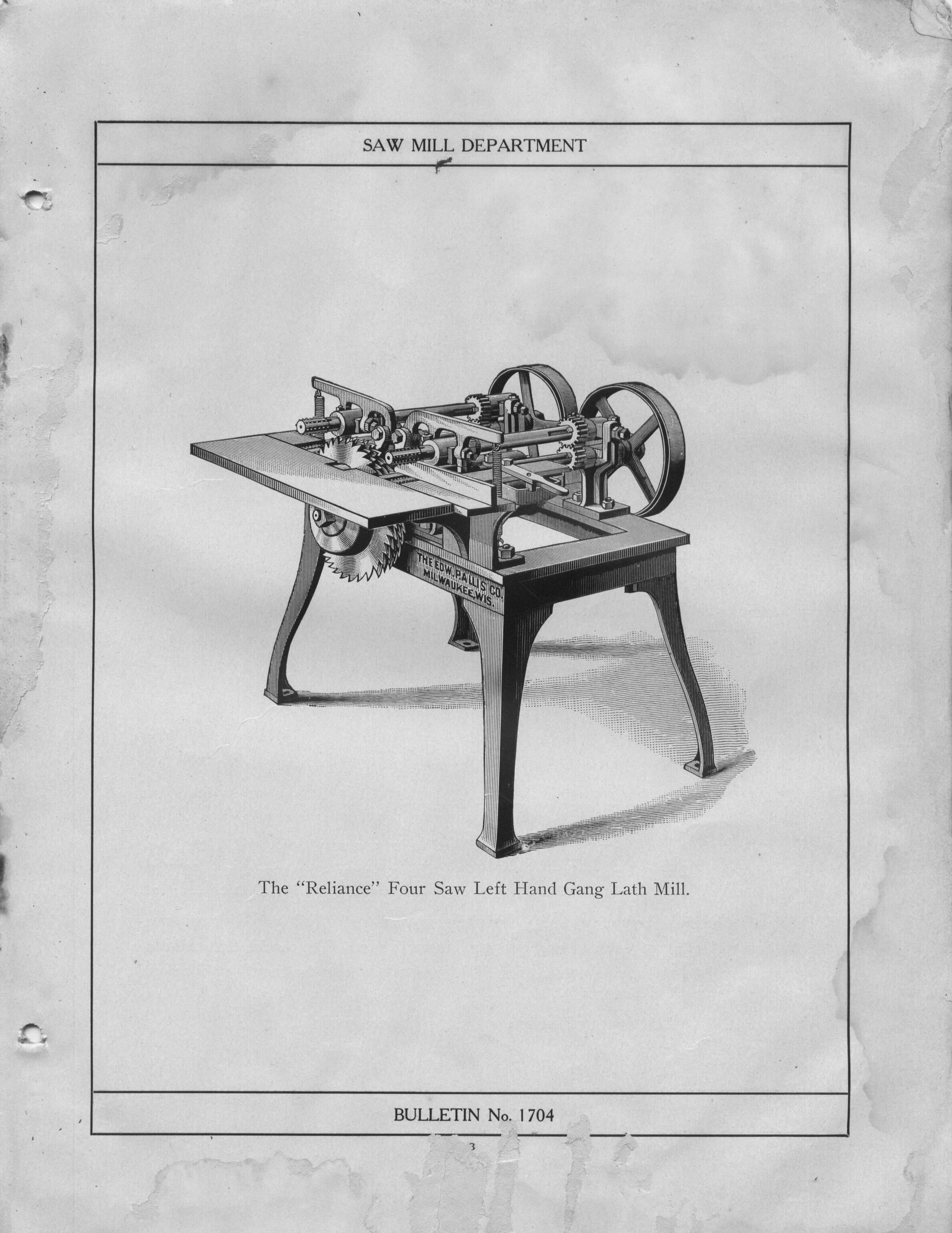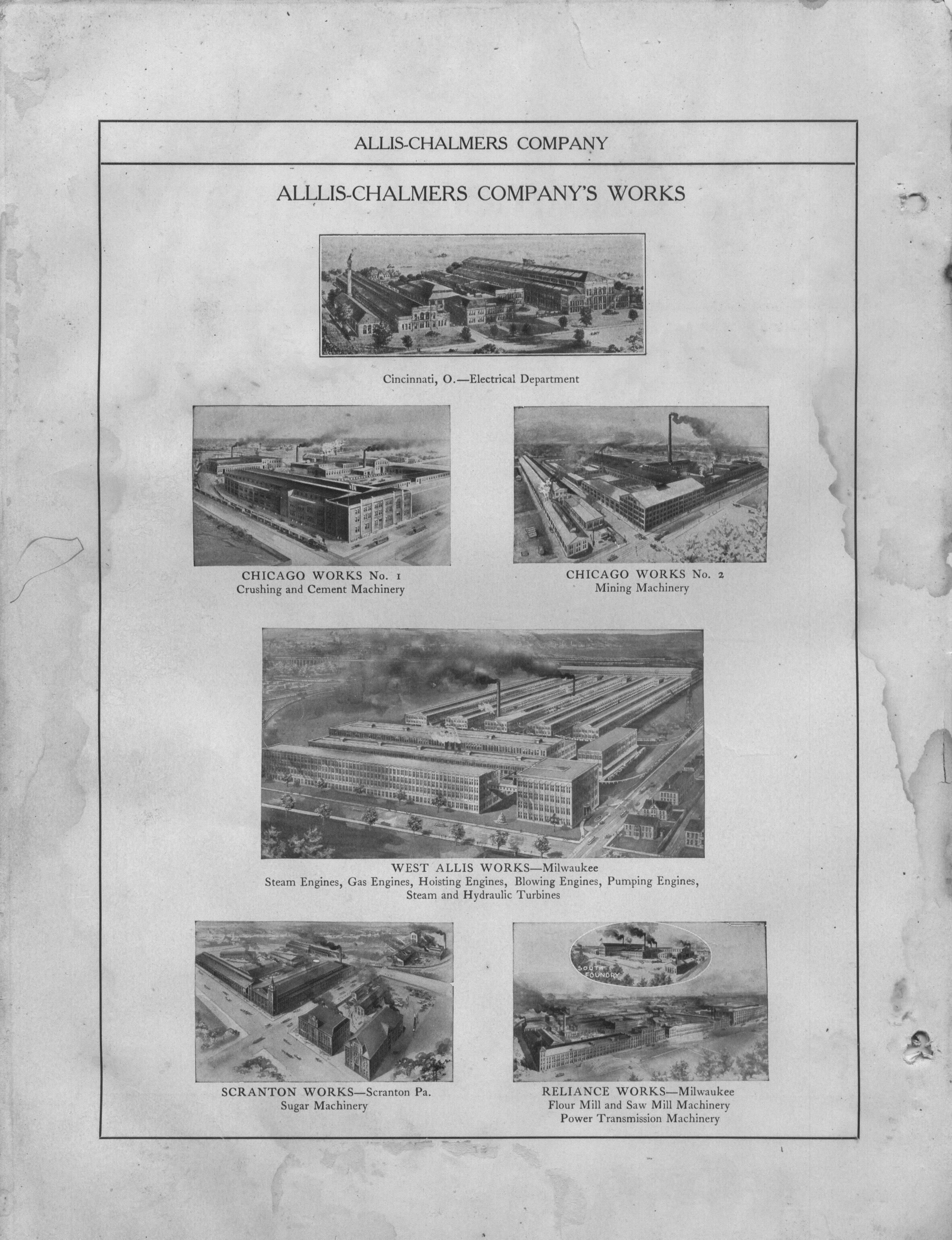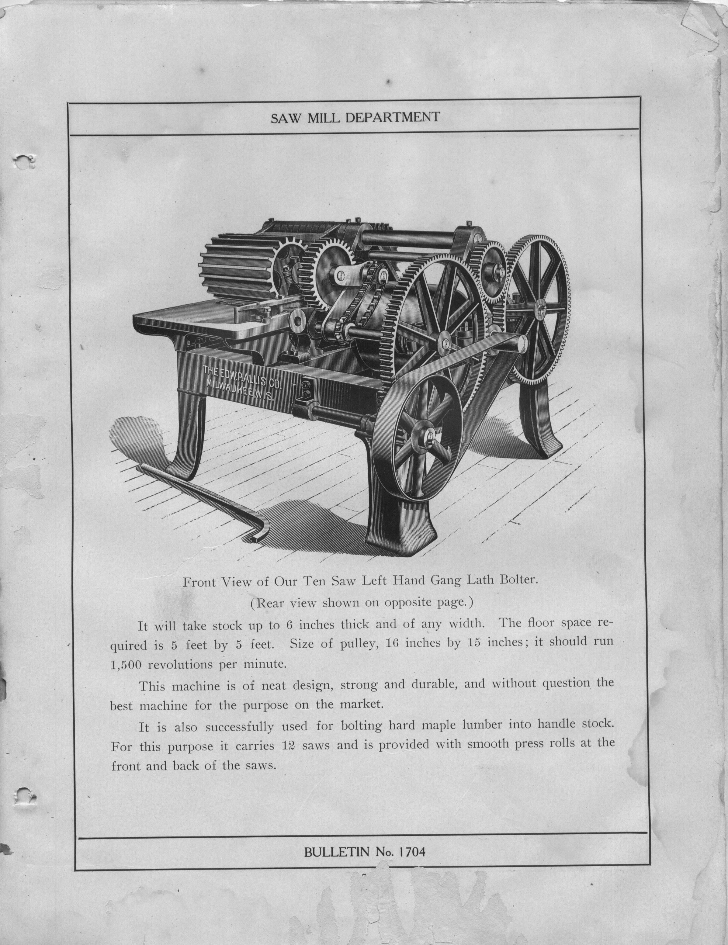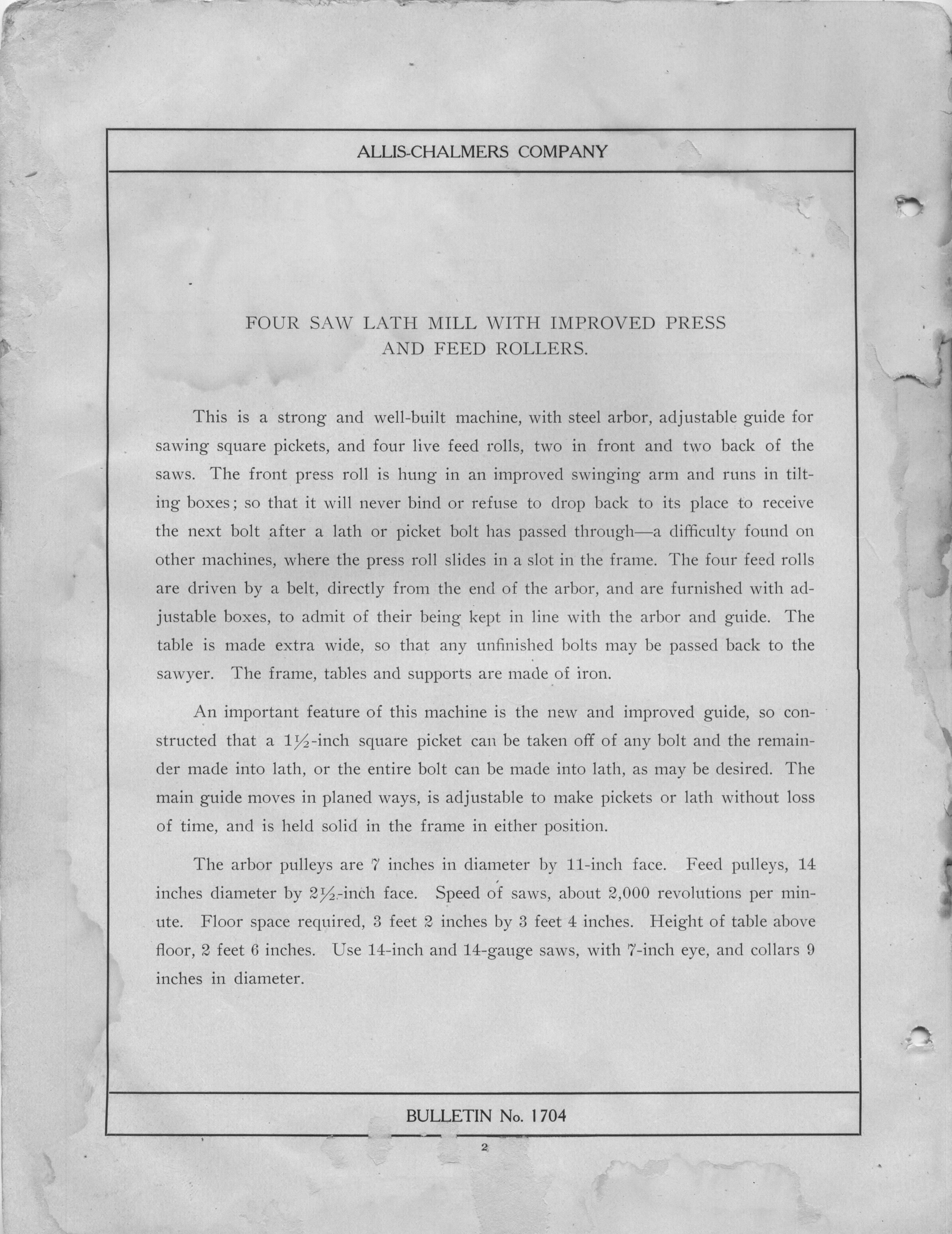Out of the New Orleans District company; features: Four saw lath mill with improved press and feed rollers, "Reliance" four saw left hand gang lath mill, Allis-4-saw iron frame lath mill, Allis combined lath mill and bolter, Left hand ten saw gang lath bolter, New right hand Allis three saw bolter, and Left hand single saw self feed picket machine; back page of photos of Allis-Chalmers company's work of a electrical dept., Crushing and Cement Machinery, Mining Machinery, Sugar Machinery, Flour Mill and Saw Mill and Power transmission machinery, and West Allis WorksContext