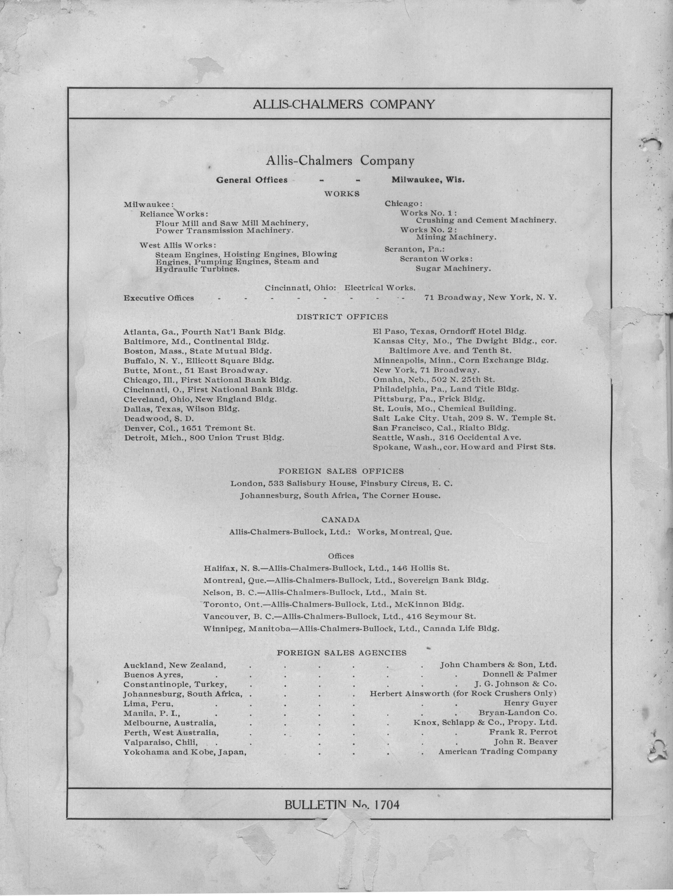 Has equipment of air brakes, air compressors, blowing engines, cement machinery, chilled rolls, coal mining machinery, condensers, Corliss engines, crushing machinery, dredges, engines, electrical apparatus (alternating current, direct current, and switchboards for generators and motors), flour mill machinery, gas engines, hoisting engines, hydraulic machinery, mining machinery, perforated metals, power transmission machinery, pumping machinery, rolling mill engines, sugar machinery, sawmill machinery, steam shovels, timber preserving machinery, turbines-steam, and turbines-water
