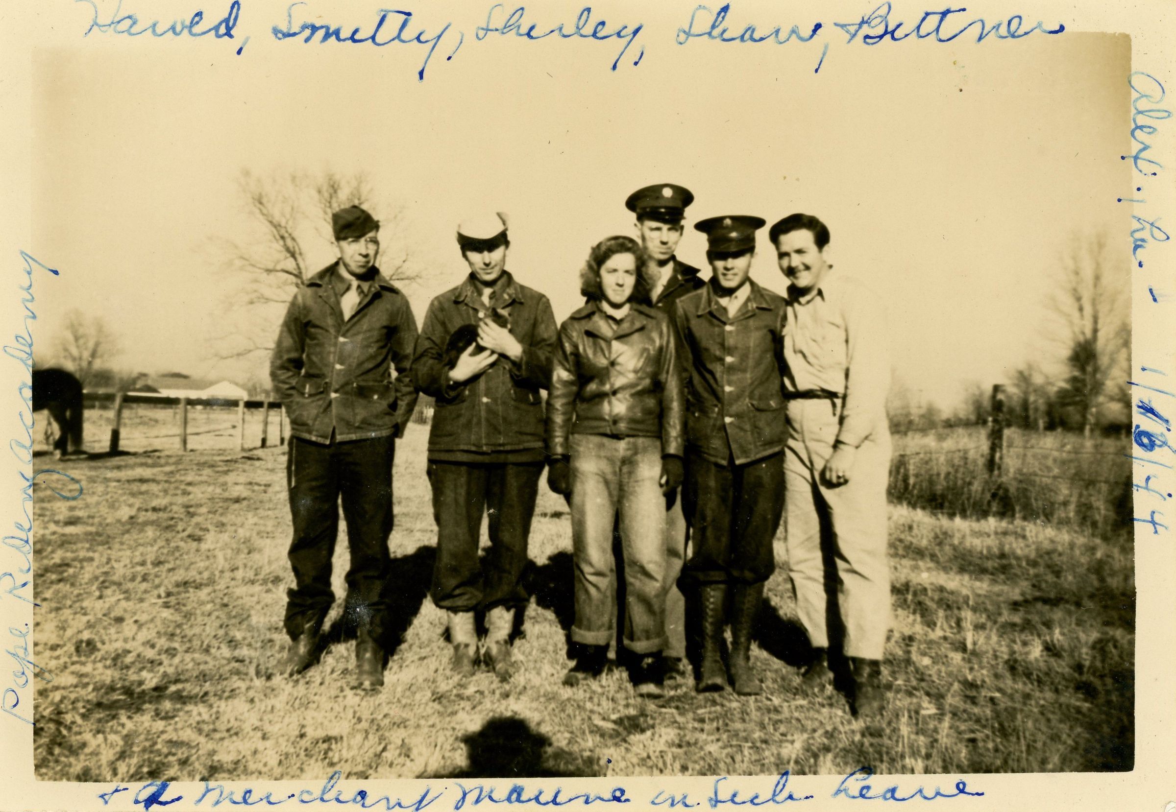 Harold, Smitty, Shirley, Shaw, +Bittner; Pope Riding Academy; Alex., La. - 1/16/44; + A Merchant Maune on [indecipherable] leaveMaterial/Technique