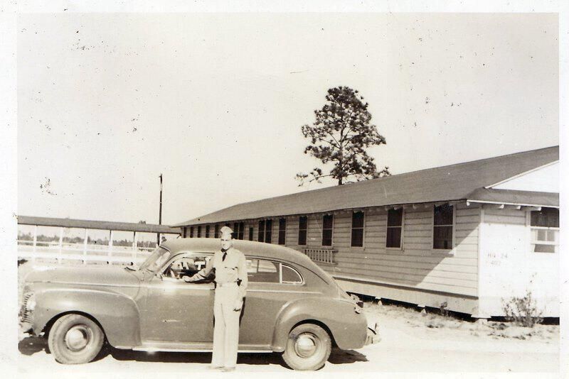 Shows a scene of something quite regular at Camp Claiborne, a man with his car parked outside a building.