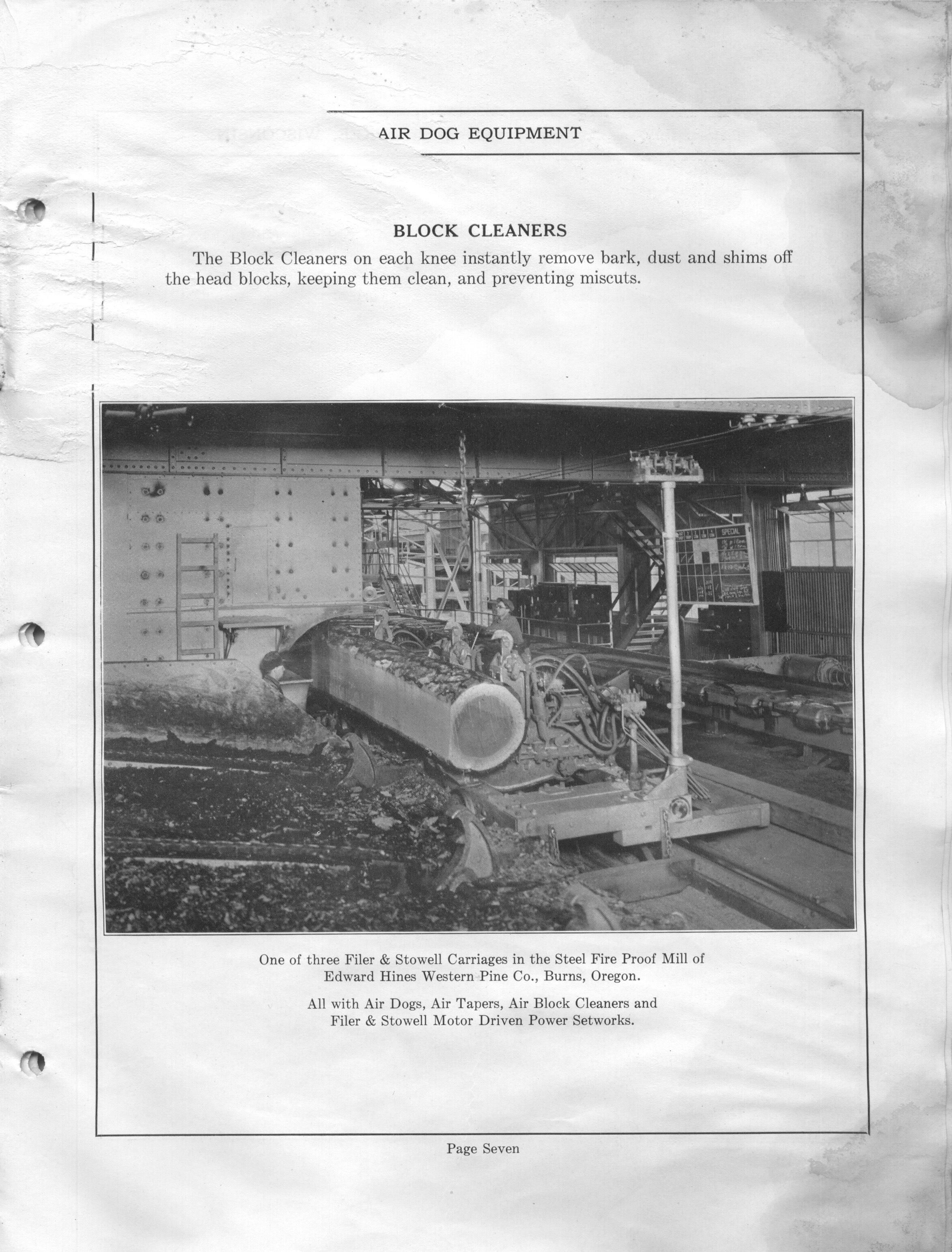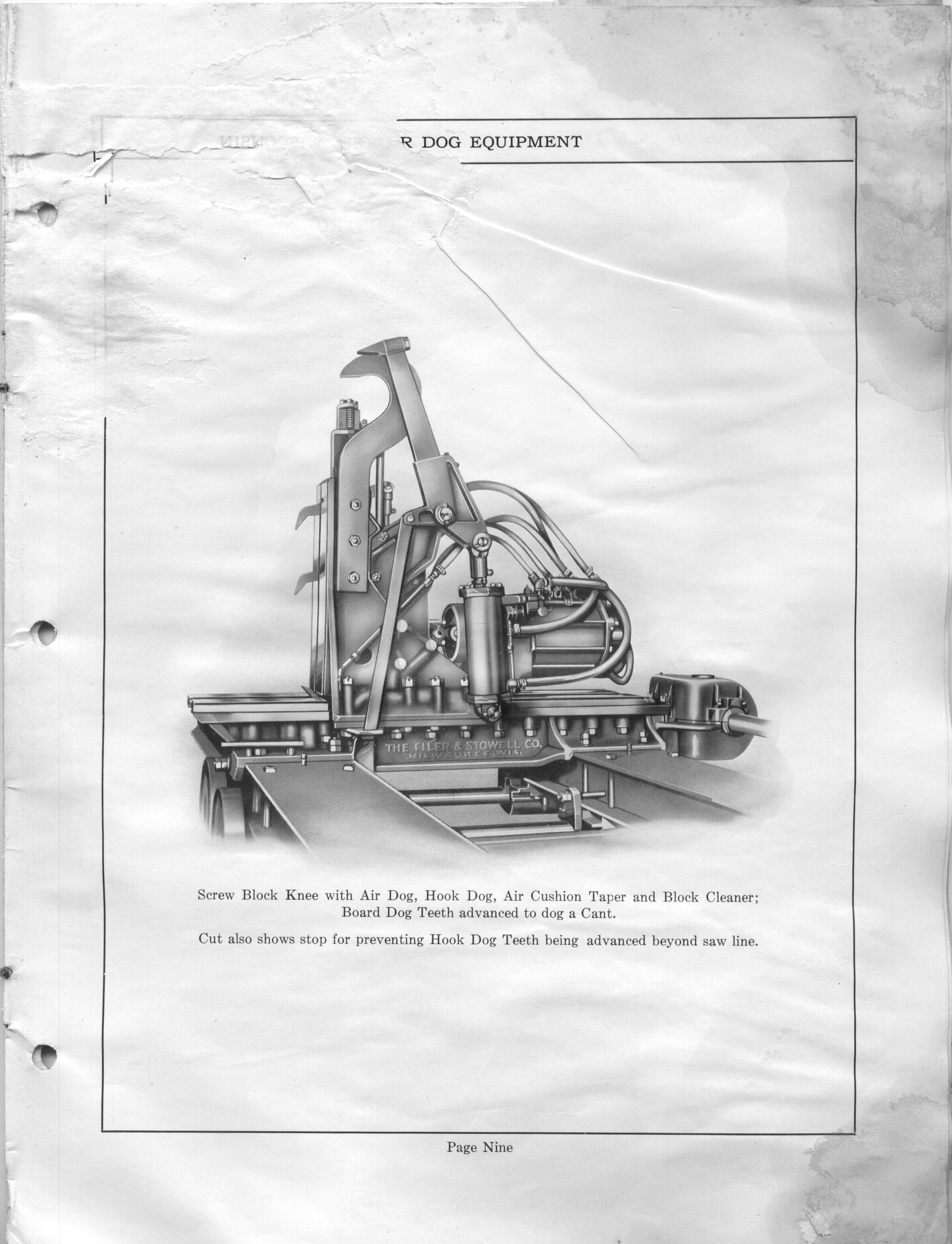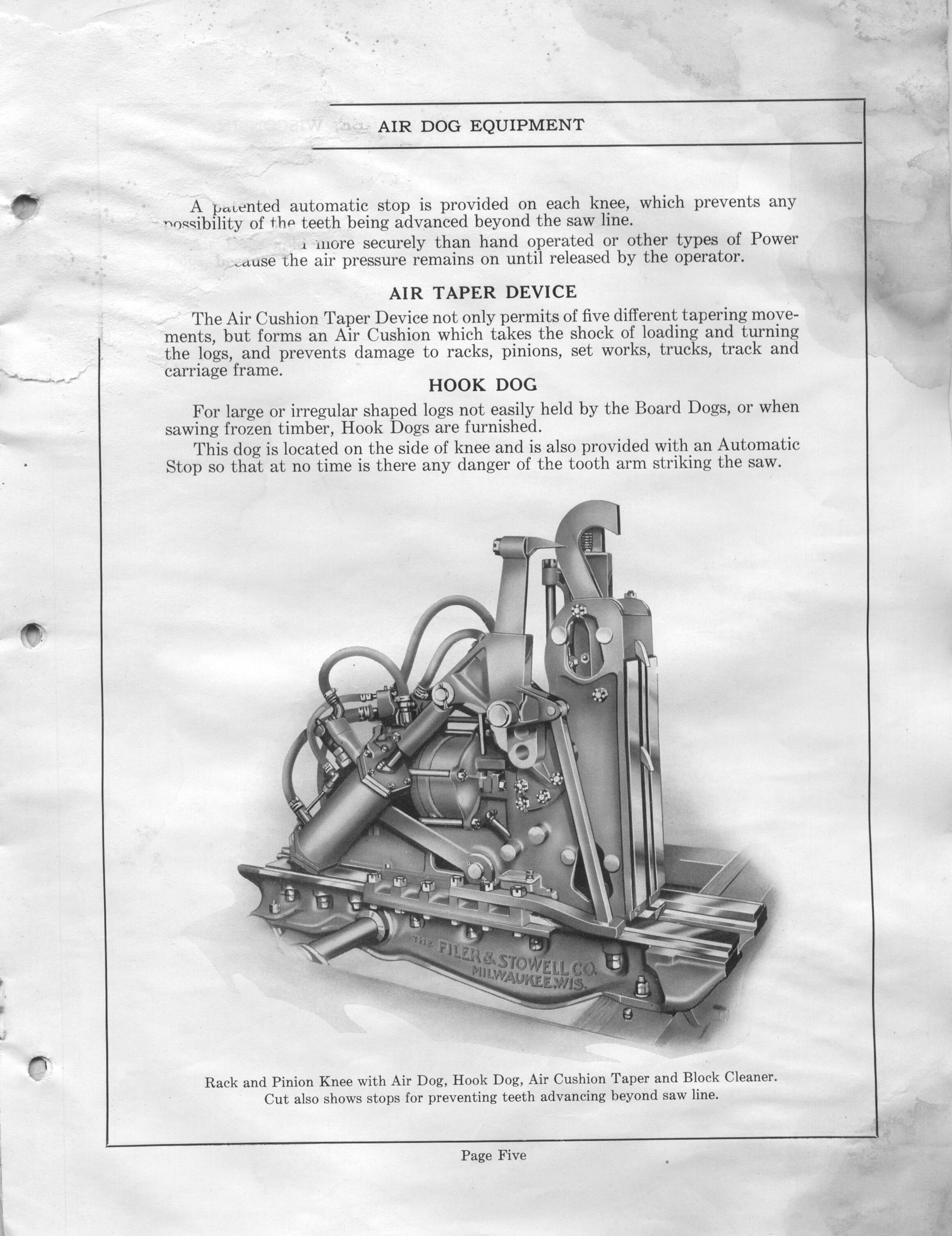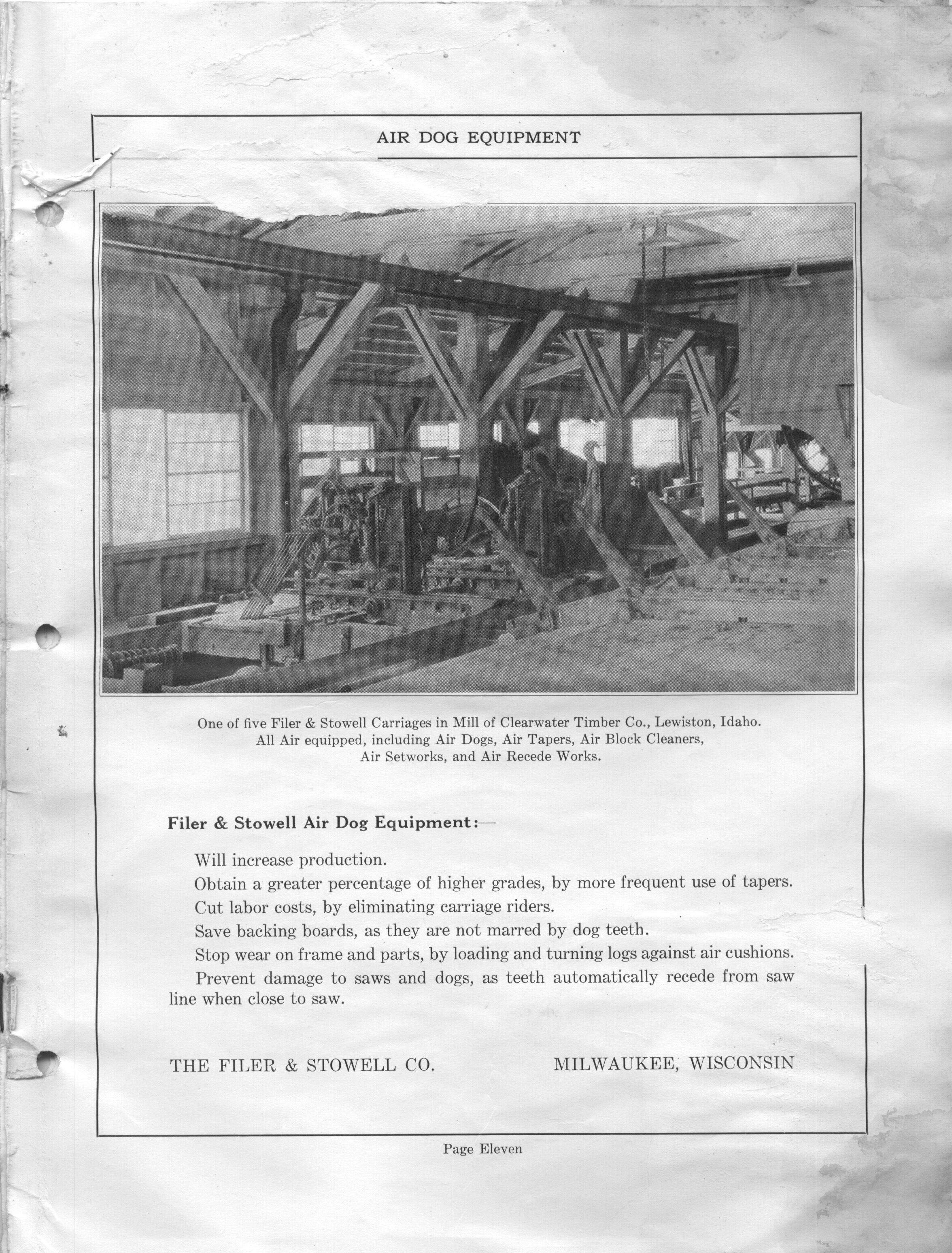 features: Filer & Stowell carriage, Rack and pinion carriage, Air taper device, Hook dog, Chain dogs, Block cleaners, Screw block carriage, Selective poppet valve control; gives the pro of using Filer & Stowell air equipment; partial list of users of air dog equipmentContext