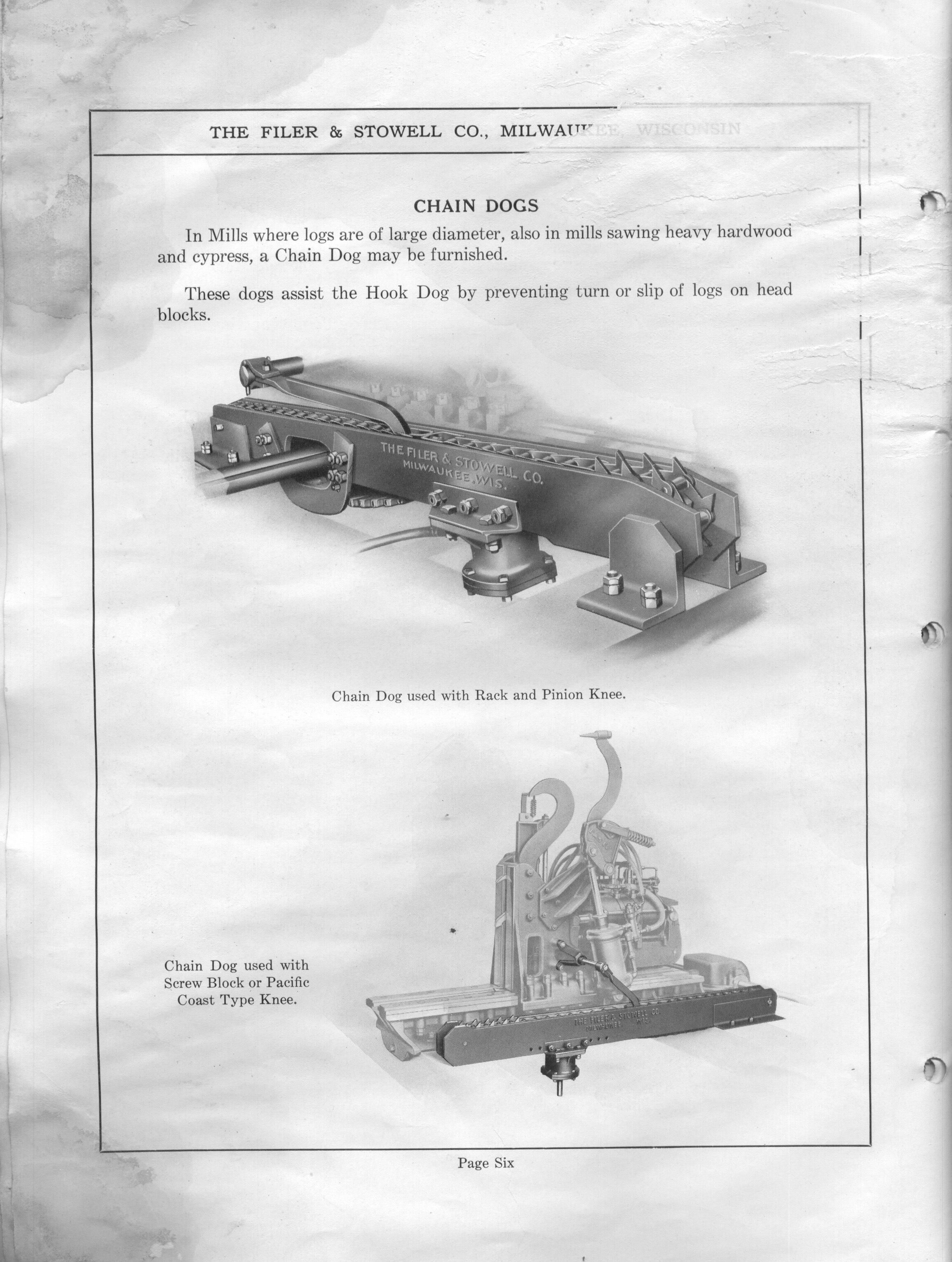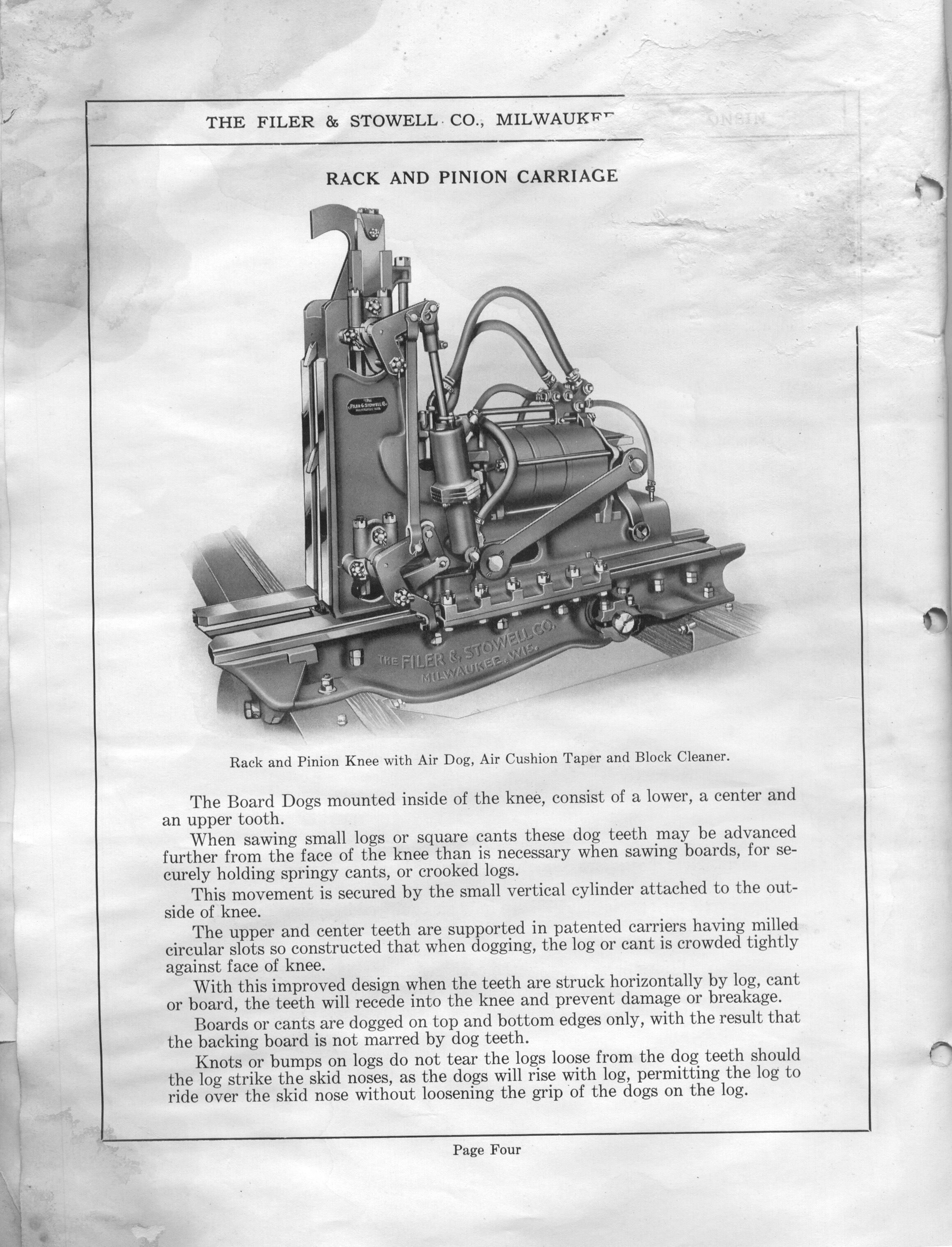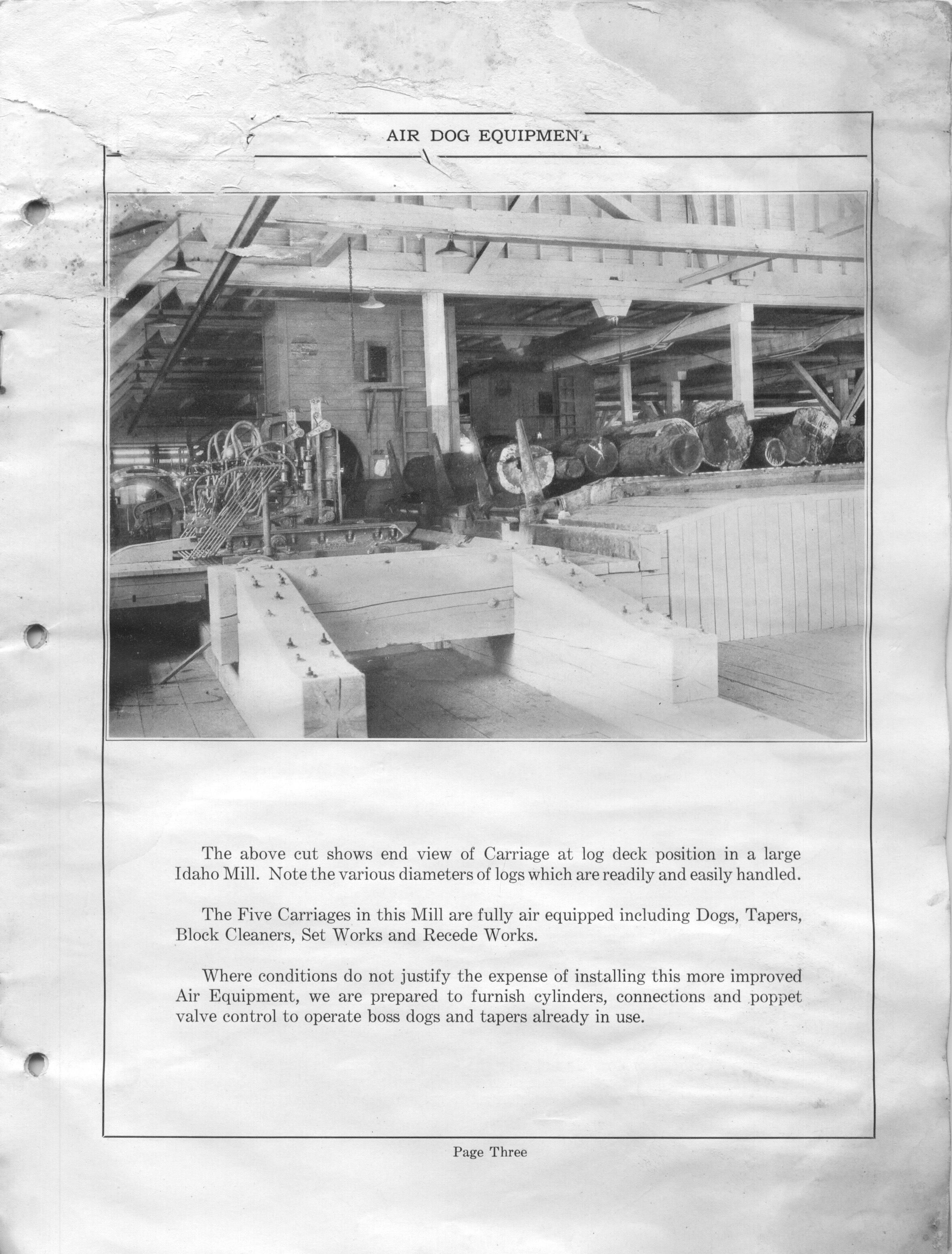features: Filer & Stowell carriage, Rack and pinion carriage, Air taper device, Hook dog, Chain dogs, Block cleaners, Screw block carriage, Selective poppet valve control; gives the pro of using Filer & Stowell air equipment; partial list of users of air dog equipmentContext