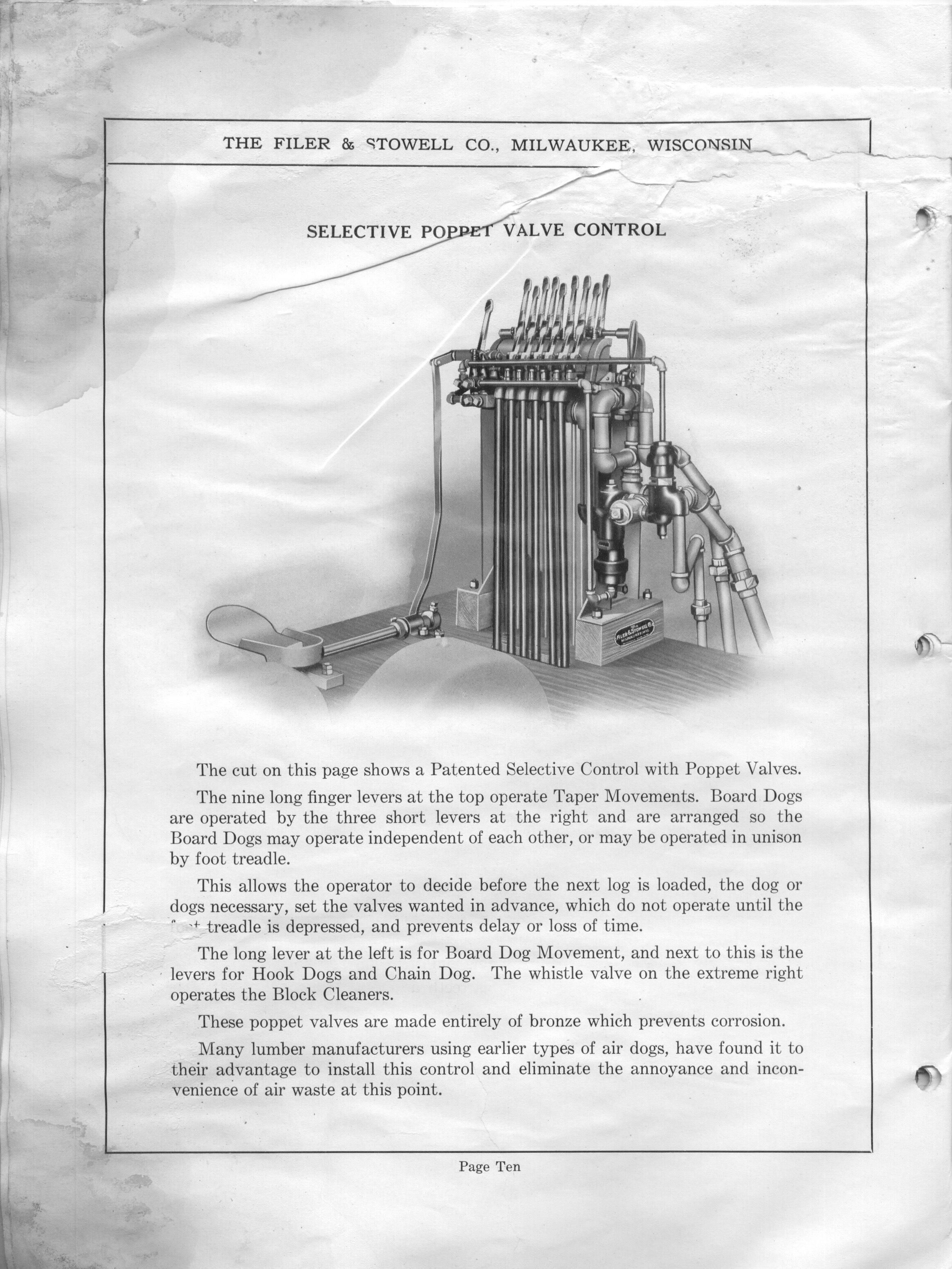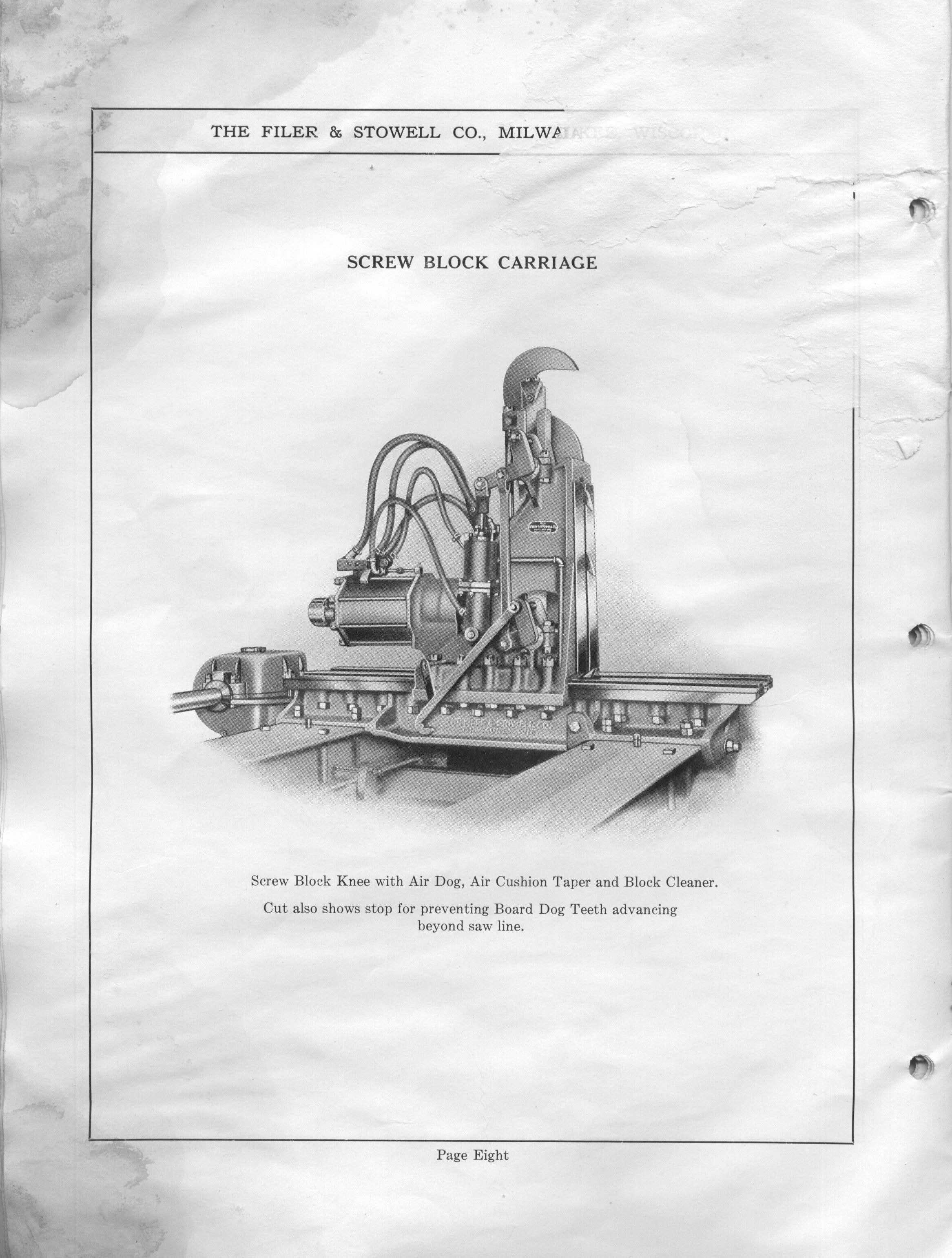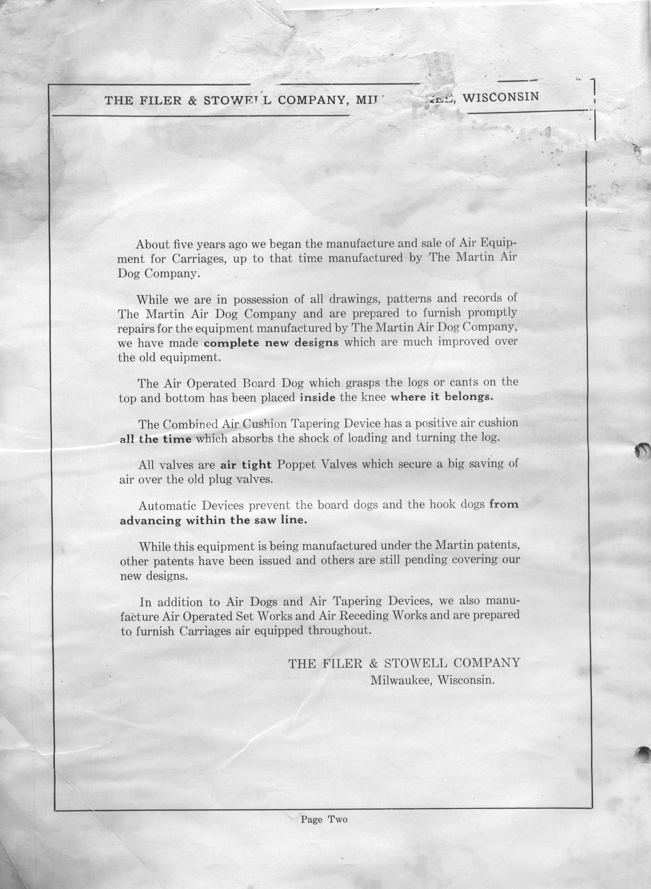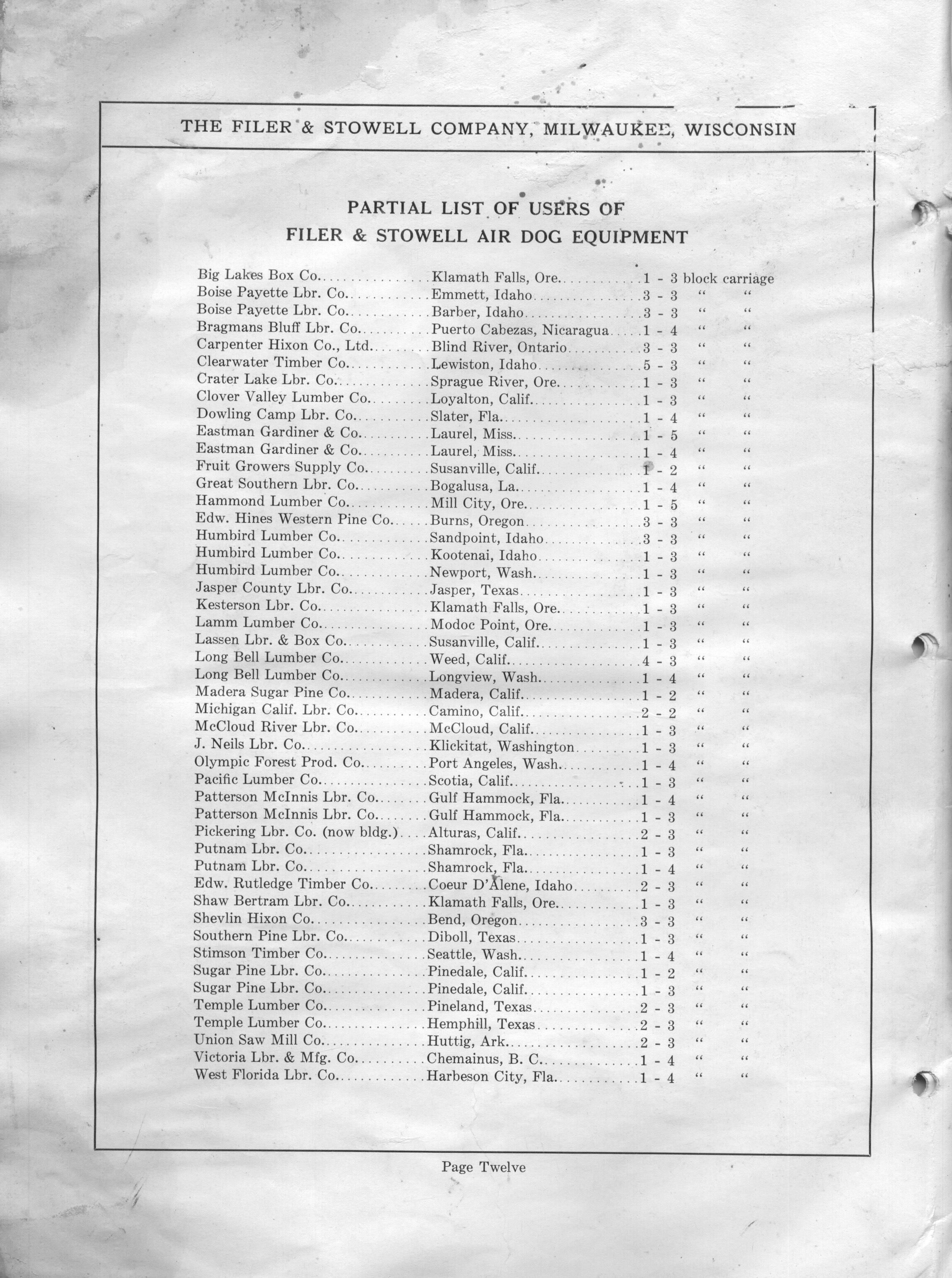 features: Filer & Stowell carriage, Rack and pinion carriage, Air taper device, Hook dog, Chain dogs, Block cleaners, Screw block carriage, Selective poppet valve control; gives the pro of using Filer & Stowell air equipment; partial list of users of air dog equipmentContext