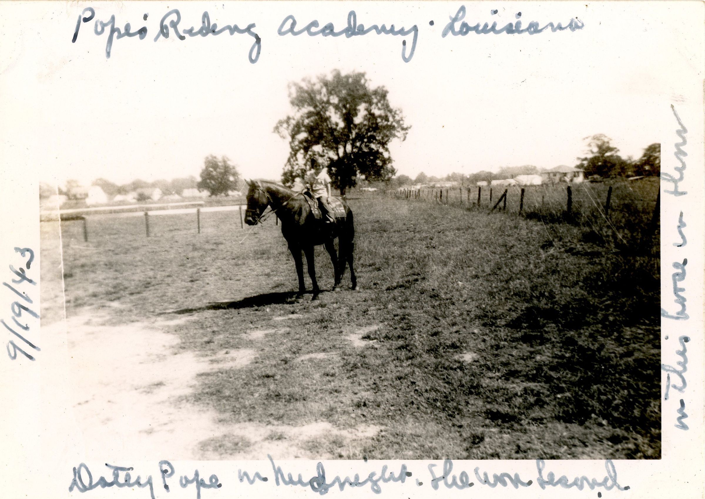 Pope's Riding Academy - Louisiana; 9/19/43; [right margin indecipherable]; Dotty Pope on Midnight .She won [indecipherable]Material/Technique