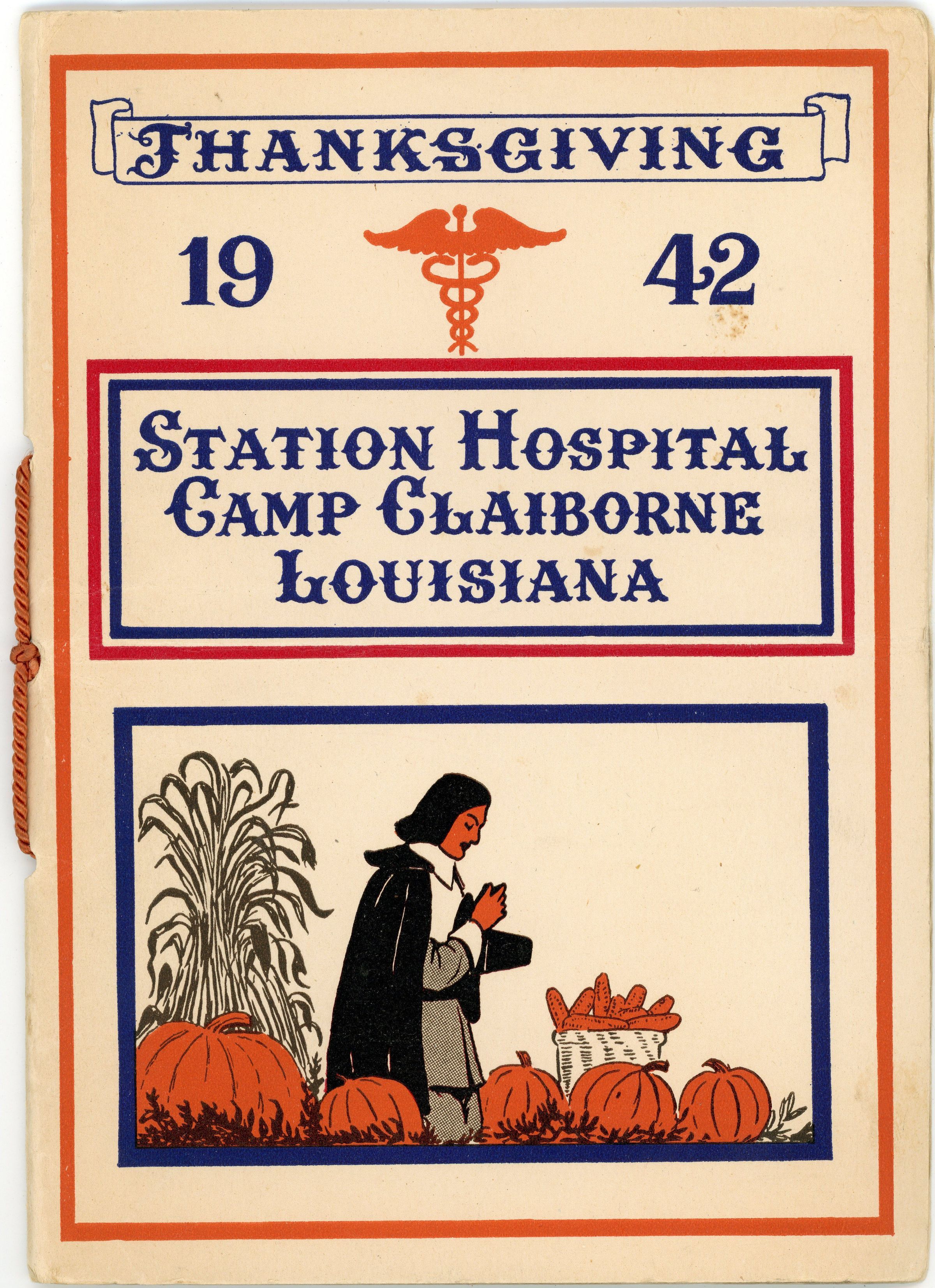 Descriptive booklet describing the menu, festivities, and individuals involved for Camp Claiborne's Station Hospital Thanksgiving celebration.Context