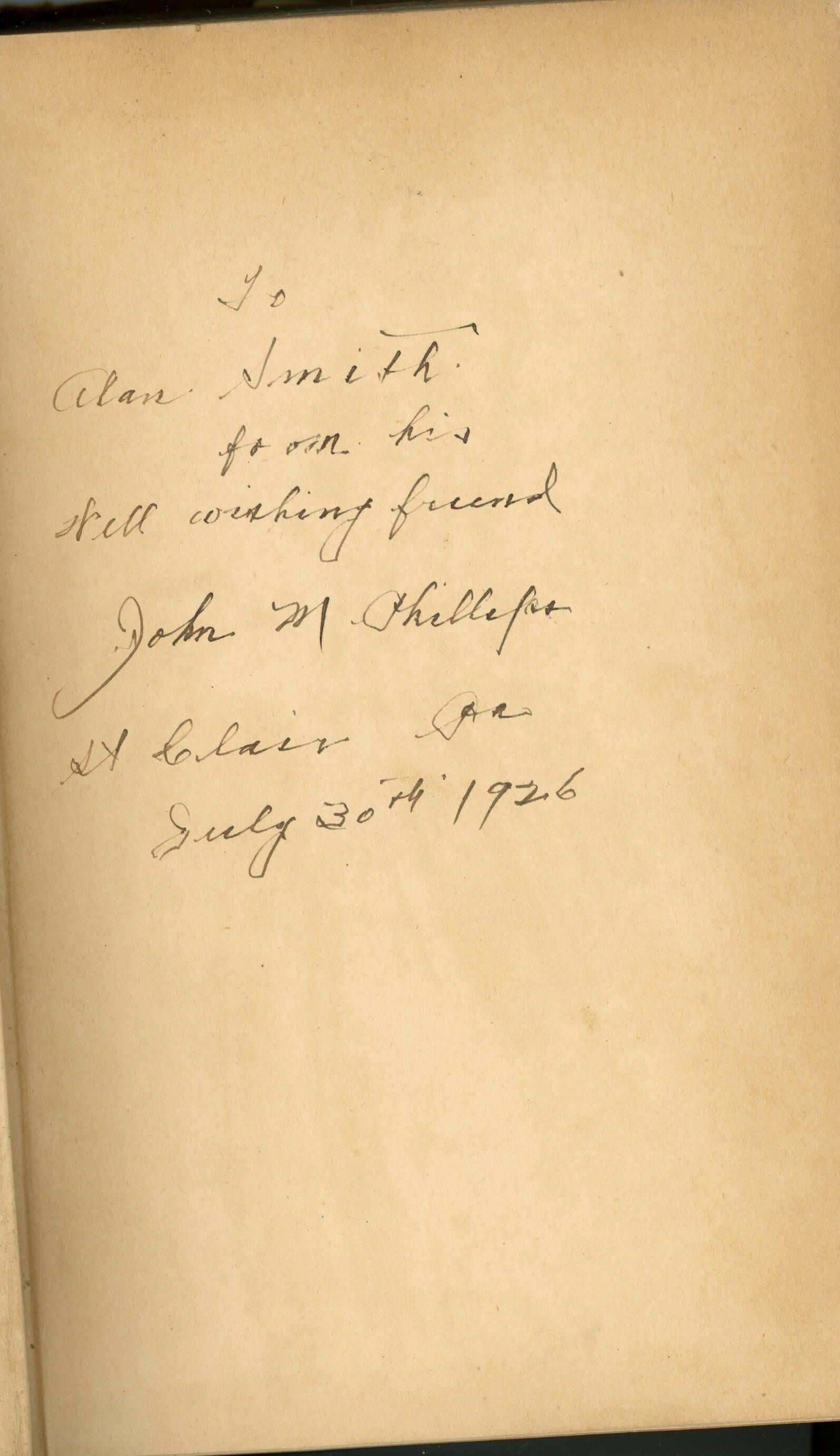 To Alan Smith from his well wishing friend John M. [undecipherable name] St. [undecipherable town and state] July 30th 1926Material/Technique