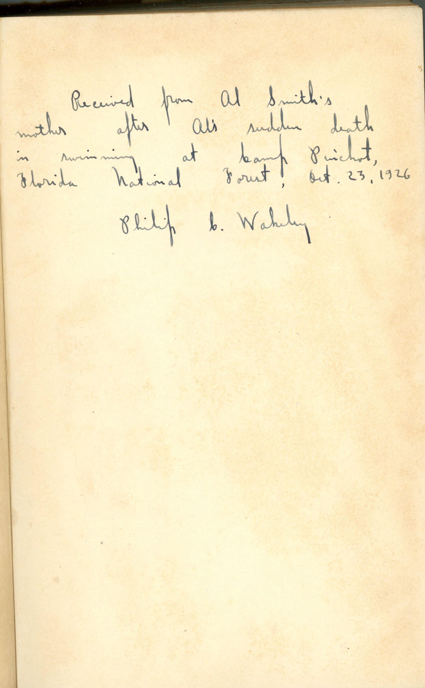 Received from Al Smith's mother after Al's sudden death in [undecipherable word] at [undecipherable words], Florida National Forest, Oct 23 1926 Philip C. WakeleyMaterial/Technique