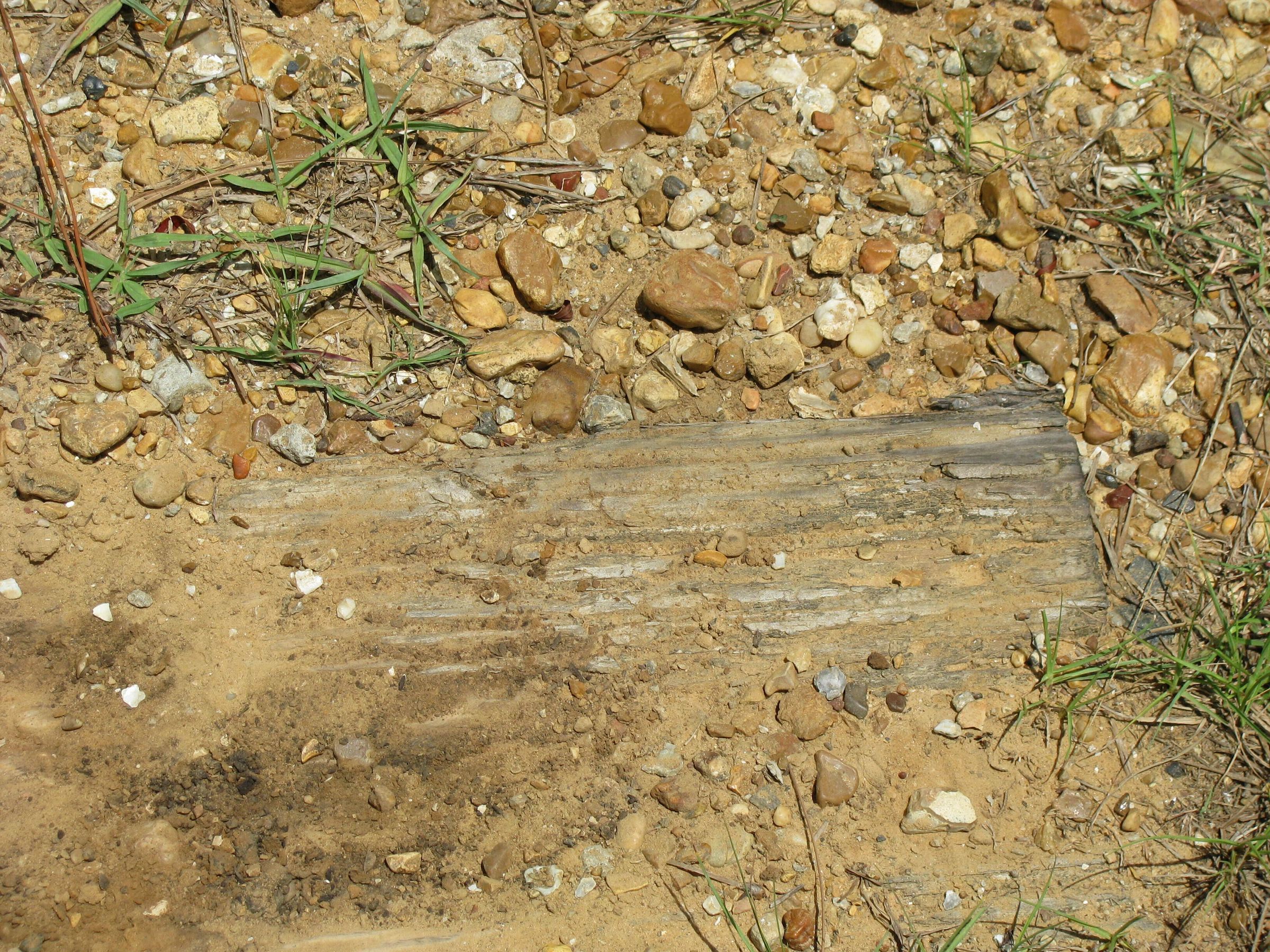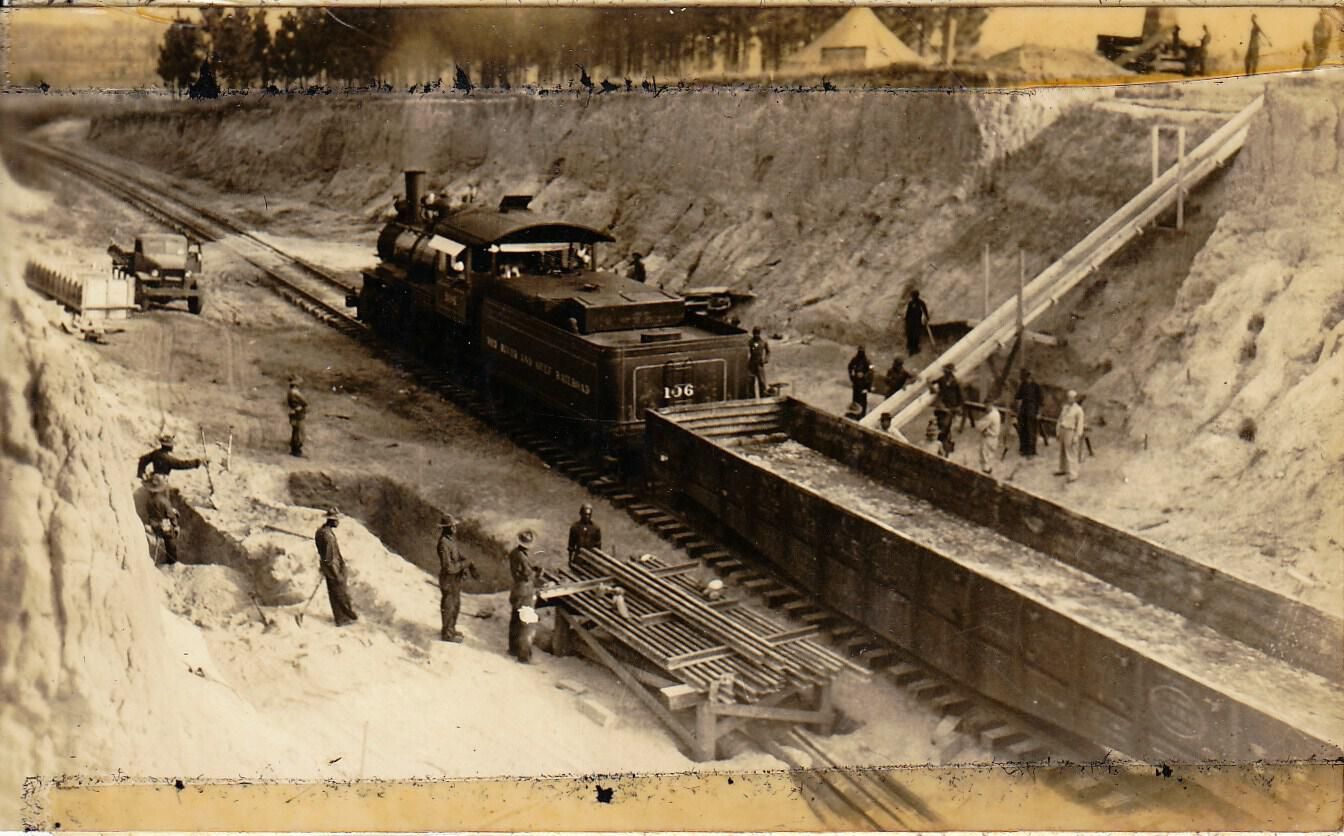 photos of the train and railway/tramway on the military railroad track from Camp Claiborne to Camp Polk (Fort Polk); remains of the military railroad track; railroad spike and cross tie; a loading dockPhotograph Details