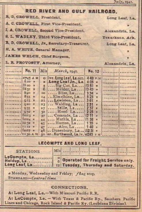 the officials in 1941 were R. D. Crowell president in Long Leaf, H. A. White general manager in Long Leaf, I. A. Crowell second vice president in Alexandria, A. C. Crowell first vice president in Long Leaf, S. L. Wadley third vice president in Texarkana, R. D. Crowell Jr. secretary-treasurer in Long Leaf, L. R. Provosty attorney in Alexandria, and James Welch chief surgeon in Long Leaf;