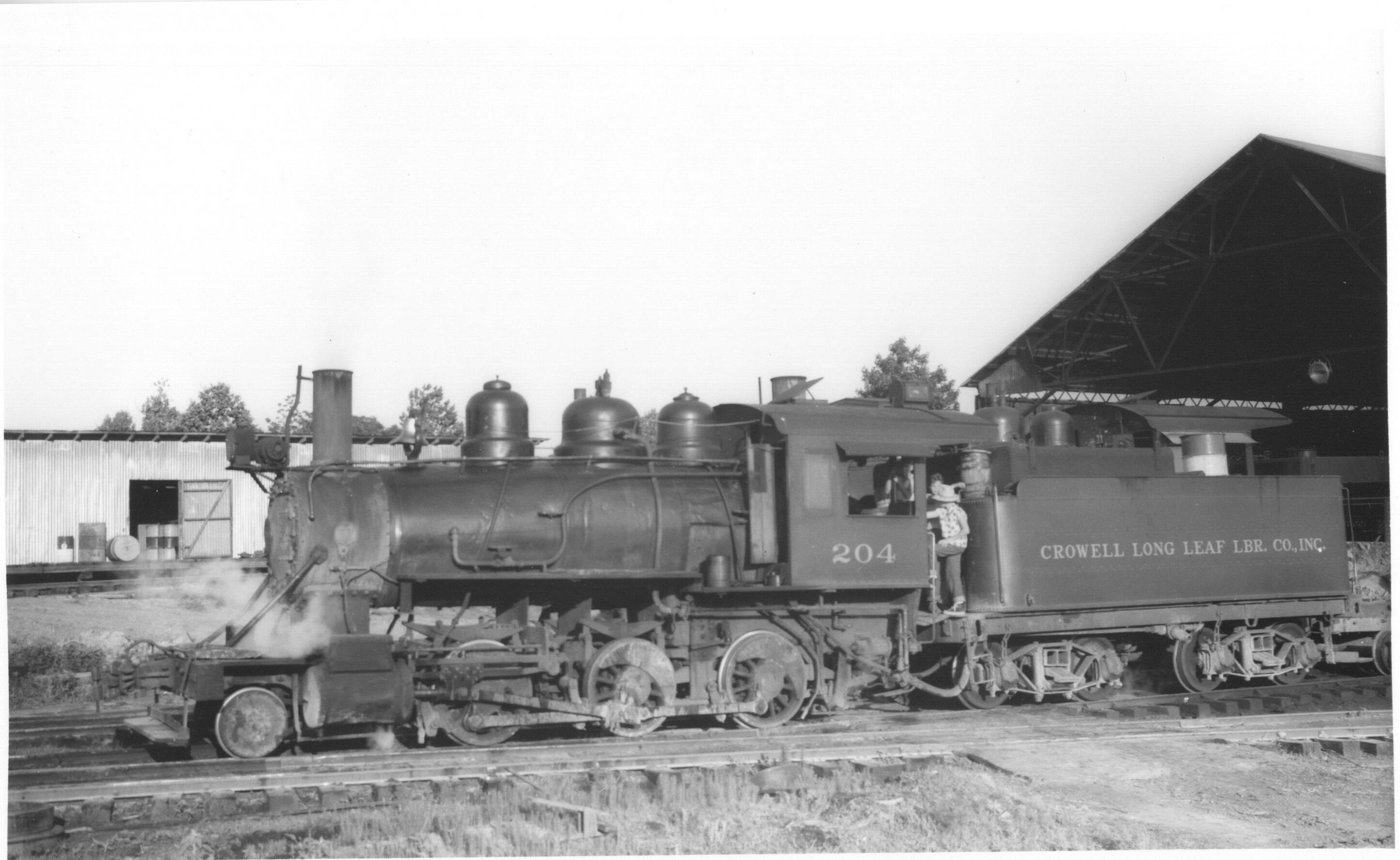 Crowell Long Leaf Lumber Co. #204, a Baldwin 2-6-0 at the Long Leaf, LA engine house. It is painted with a black boiler, green cab and tender and yellow lettering. Built for Meridian Lumber Co.Photograph Details