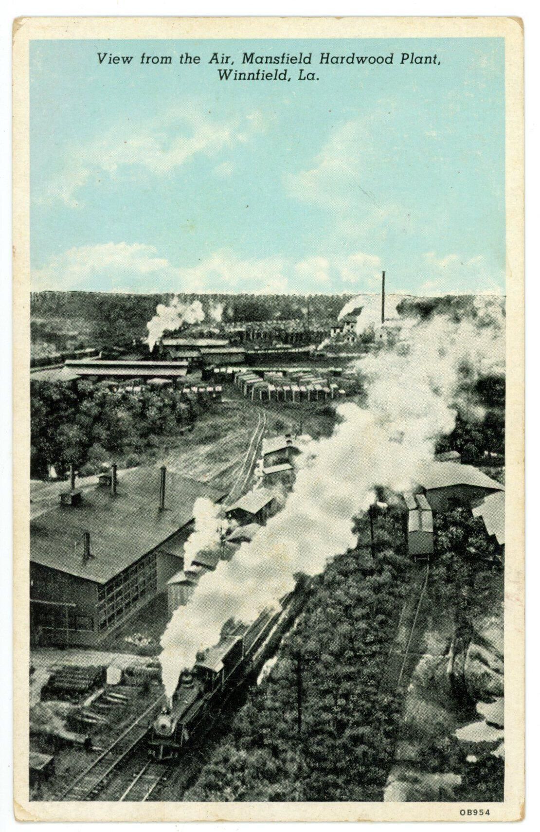 black and white with a blue sky and white clouds, aerial snapshot of the Mansfield Hardwood Plant in Winnfield (Winn's parish seat), LA; blank backCollection
