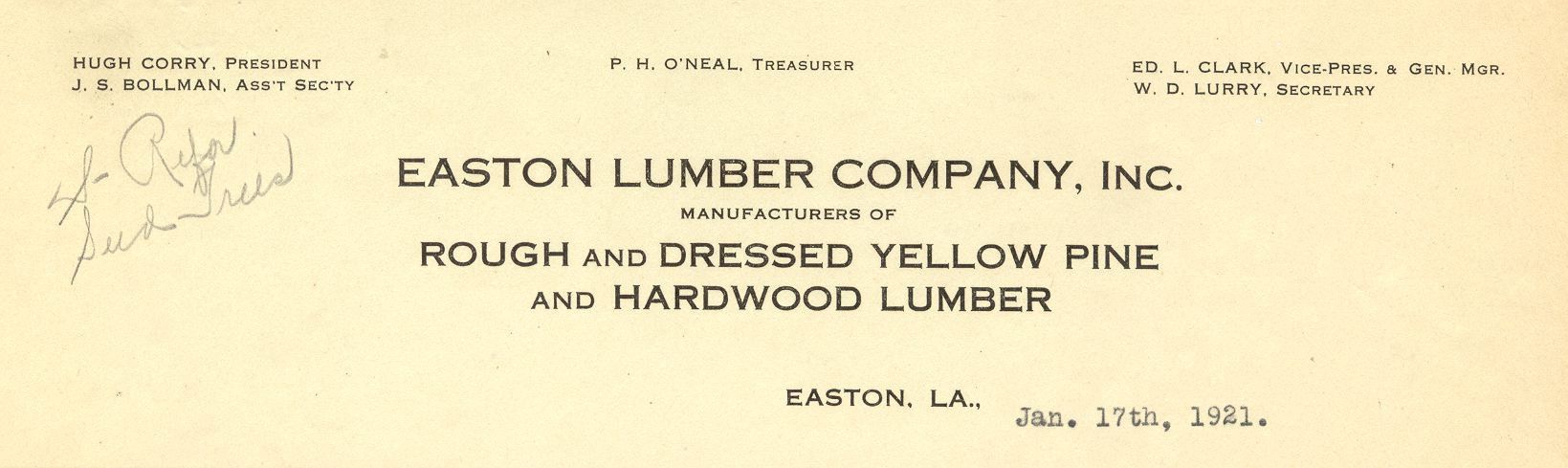 Easton Lumber Company began operations in Easton, Louisiana. The company specialized in the manufacturing of yellow pine and hardwood lumber. However, the company was forced to close due to the local resources drying.Collection