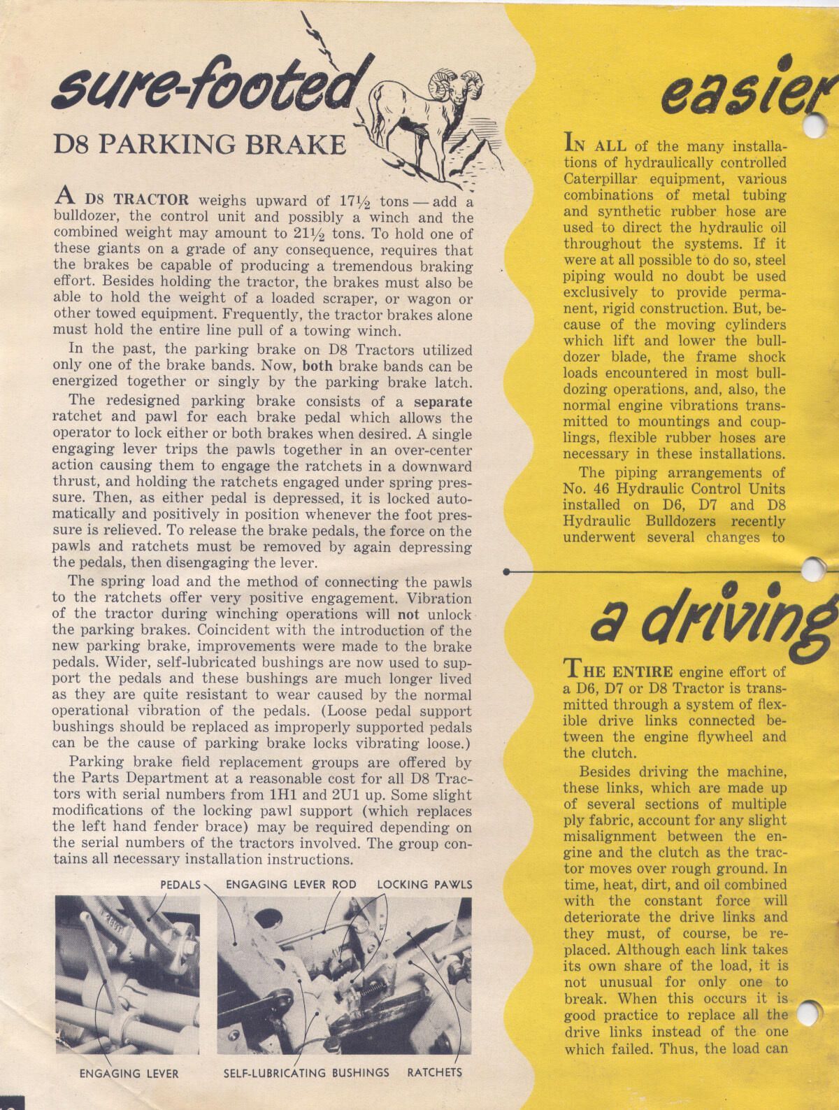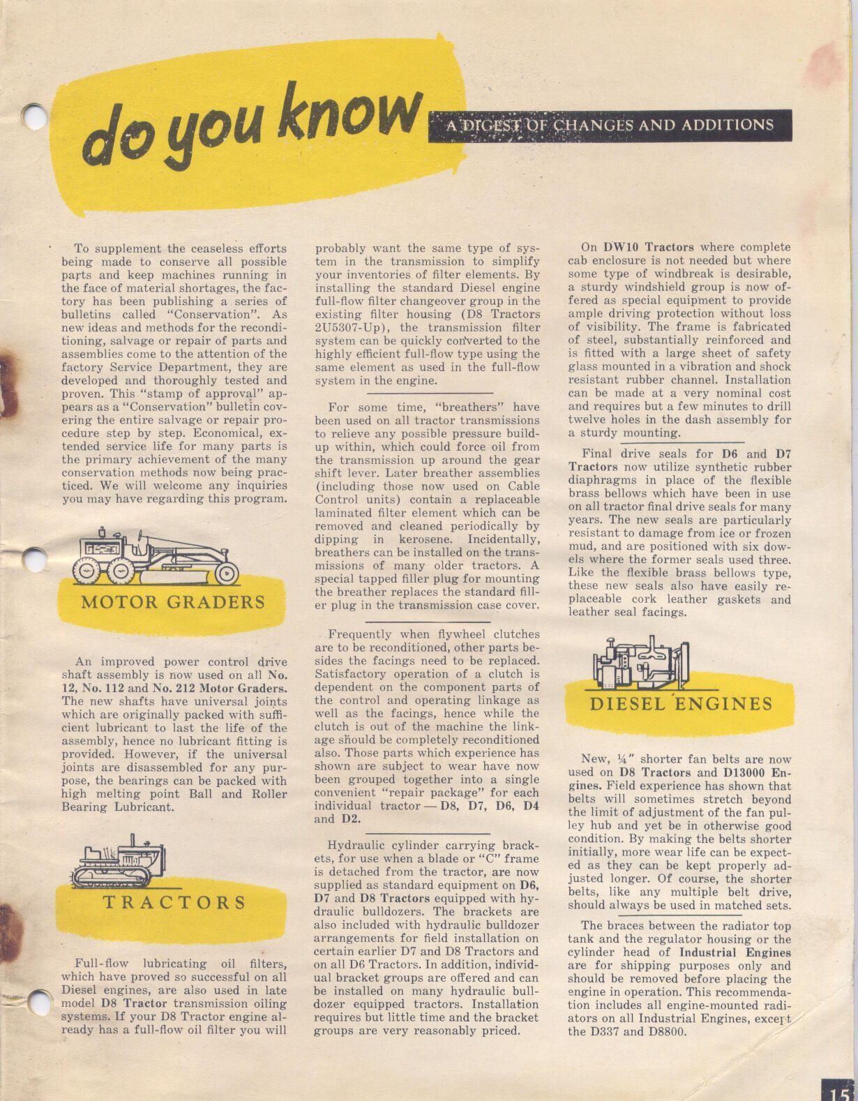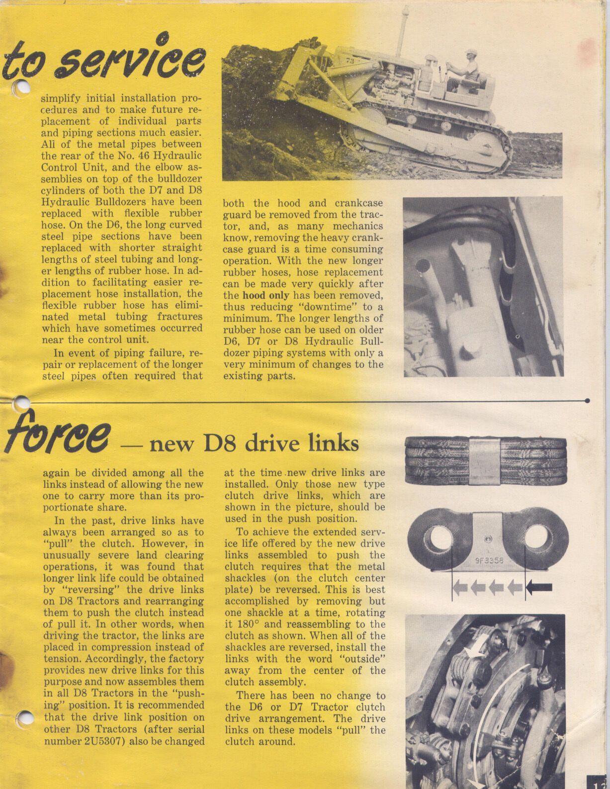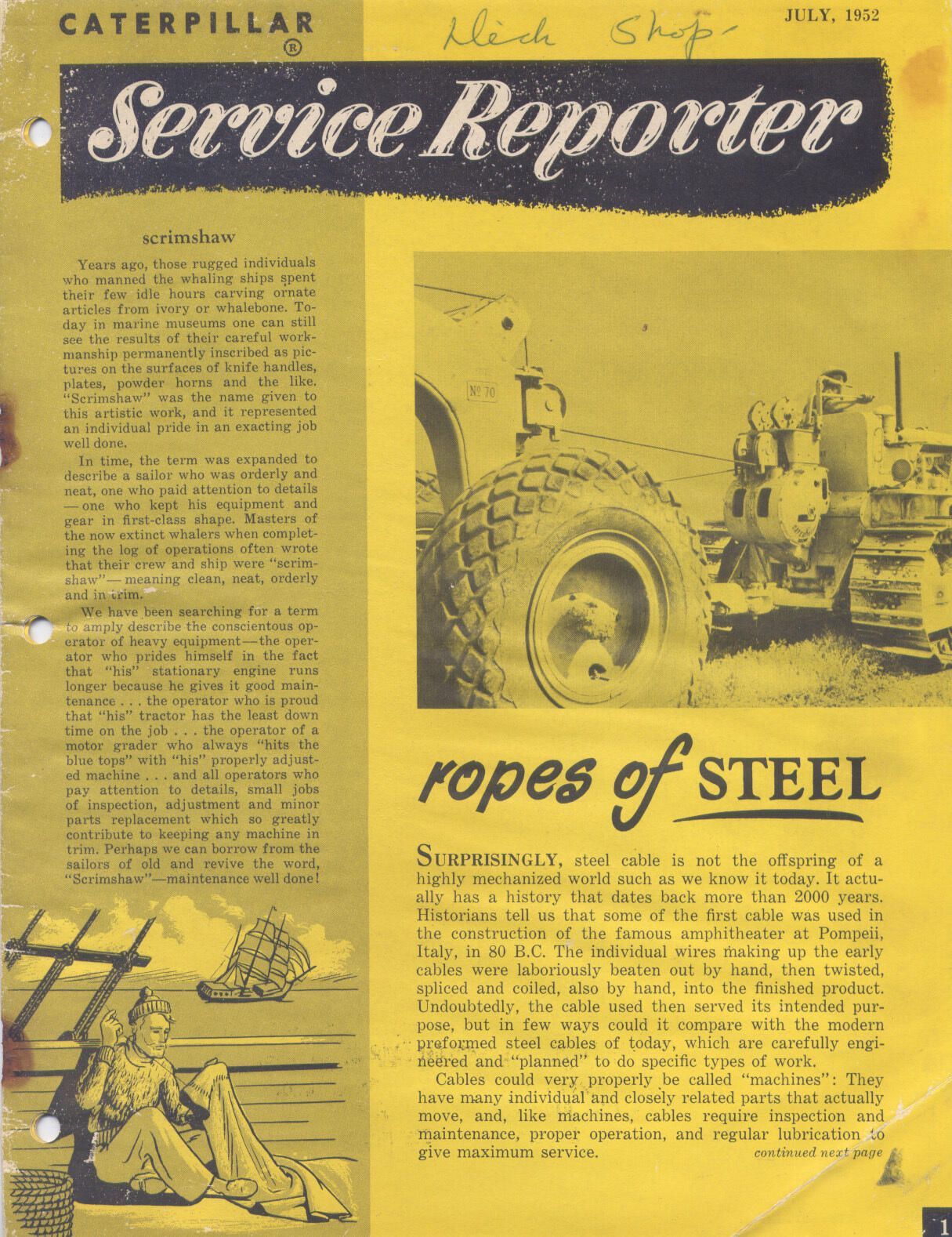 the Caterpillar Service Reporter (Caterpillar Tractor Co. Peoria, Il) features: Scrimshaw, Ropes of steel (steel cables), info on steel cables, Six improvements to the heavy baffles, 10 gallons fuel tank, two-piece transmission, clutch discs, flywheel drive gears and drawbar pull, Cooling systems dos and don'ts, DS tractor parking brake, D8 drive links, and Bellows seals; Conservation methods for salvage or repair of parts and assemblies like: motor graders, tractors, and diesel engines, with exceptionsContext