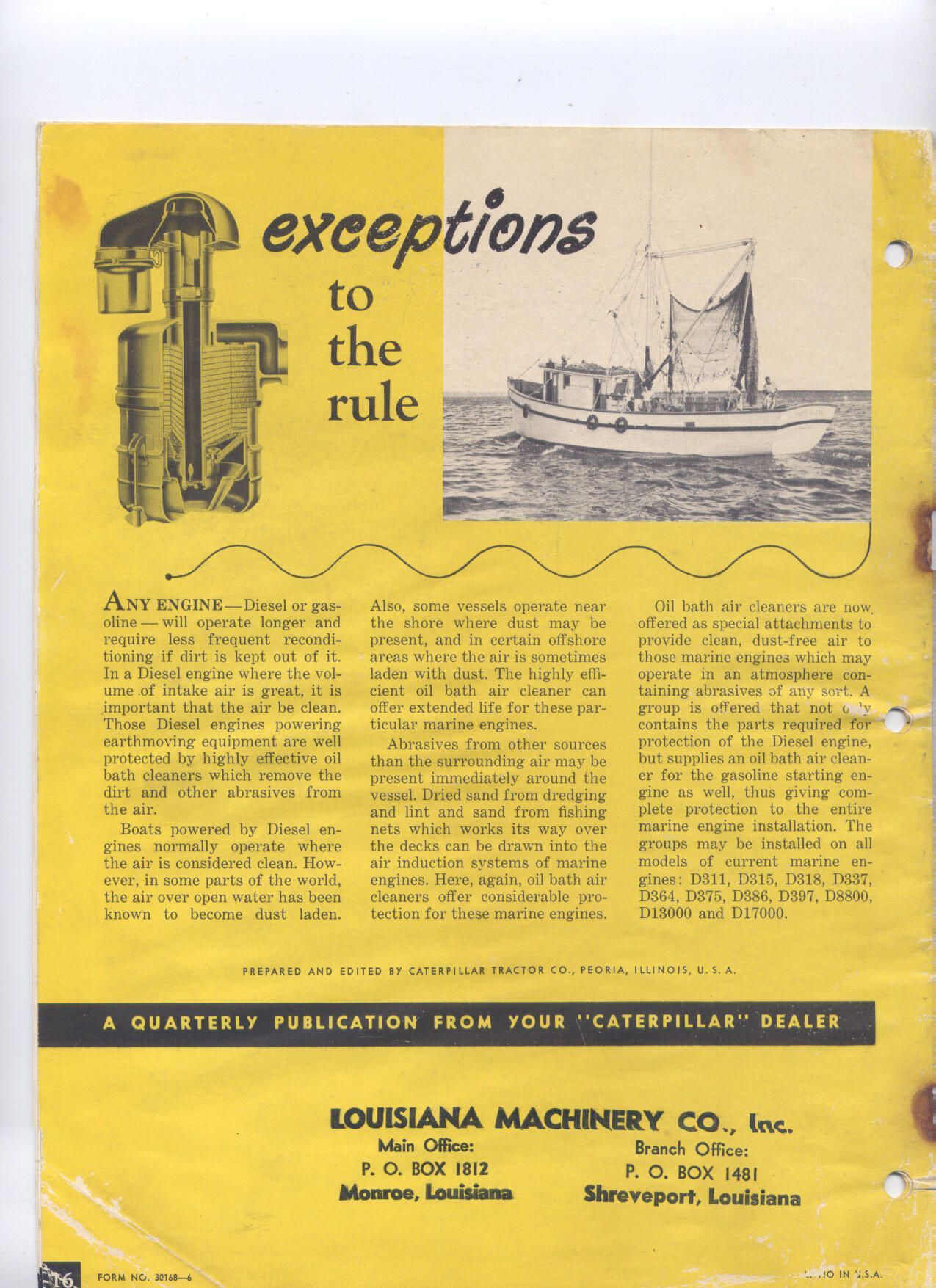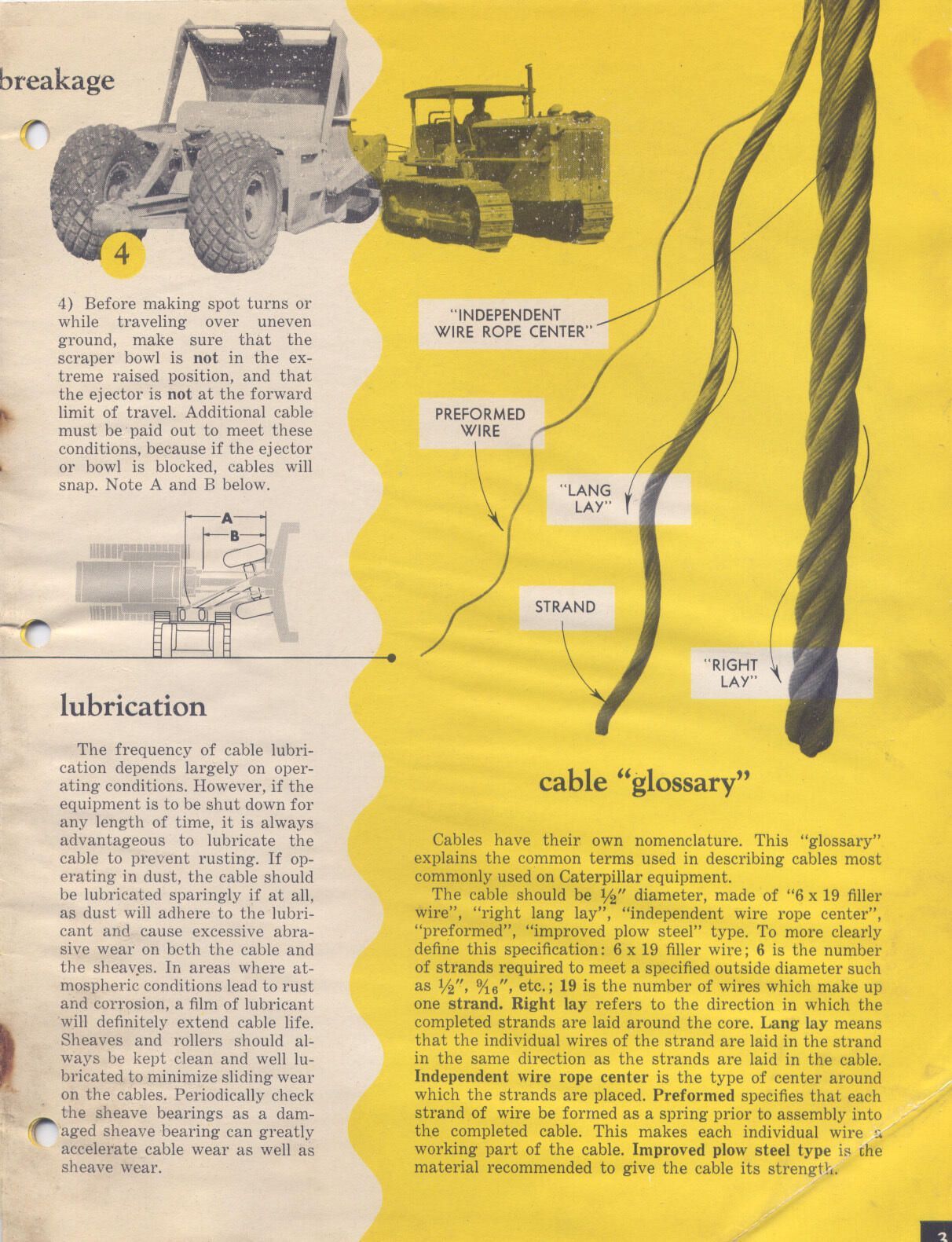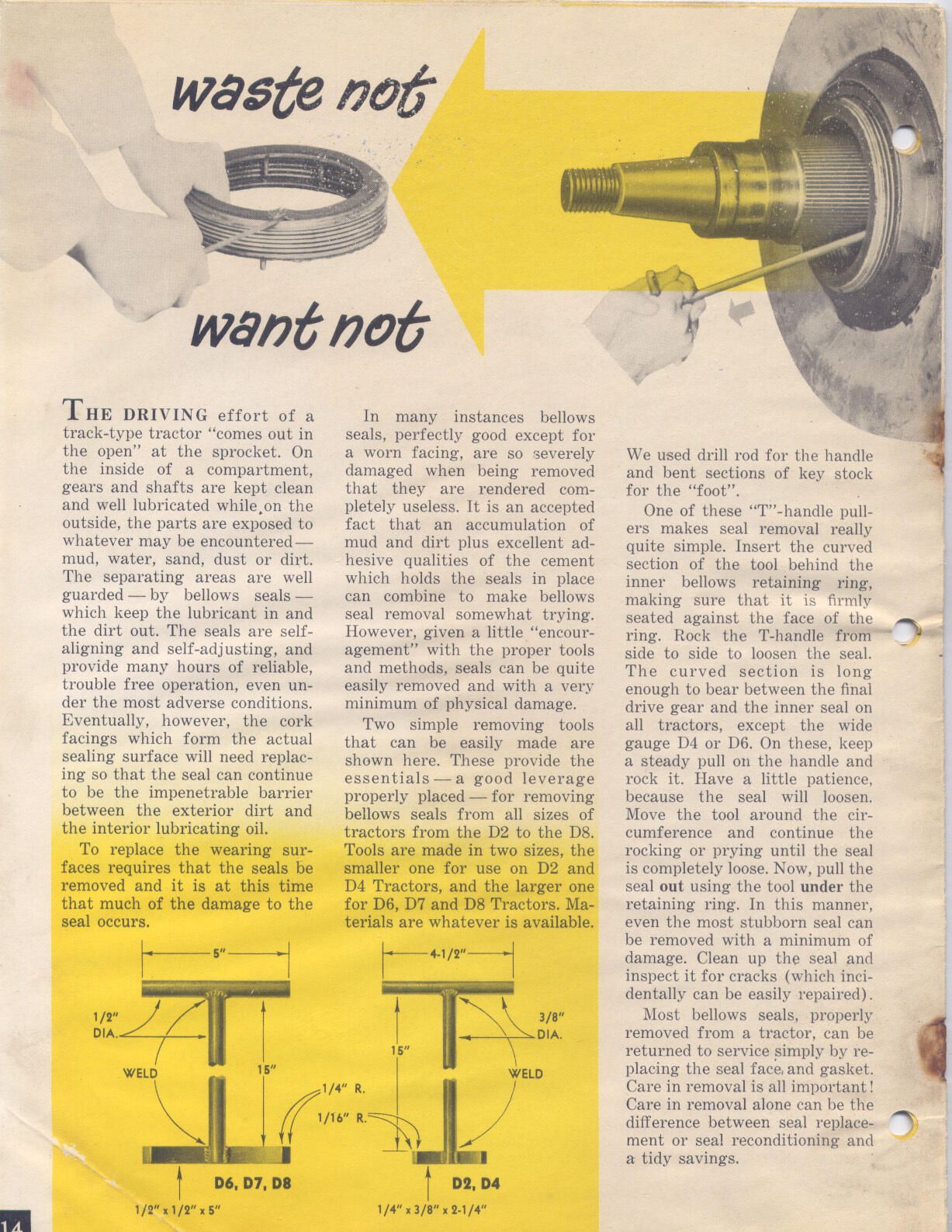 the Caterpillar Service Reporter (Caterpillar Tractor Co. Peoria, Il) features: Scrimshaw, Ropes of steel (steel cables), info on steel cables, Six improvements to the heavy baffles, 10 gallons fuel tank, two-piece transmission, clutch discs, flywheel drive gears and drawbar pull, Cooling systems dos and don'ts, DS tractor parking brake, D8 drive links, and Bellows seals; Conservation methods for salvage or repair of parts and assemblies like: motor graders, tractors, and diesel engines, with exceptionsContext