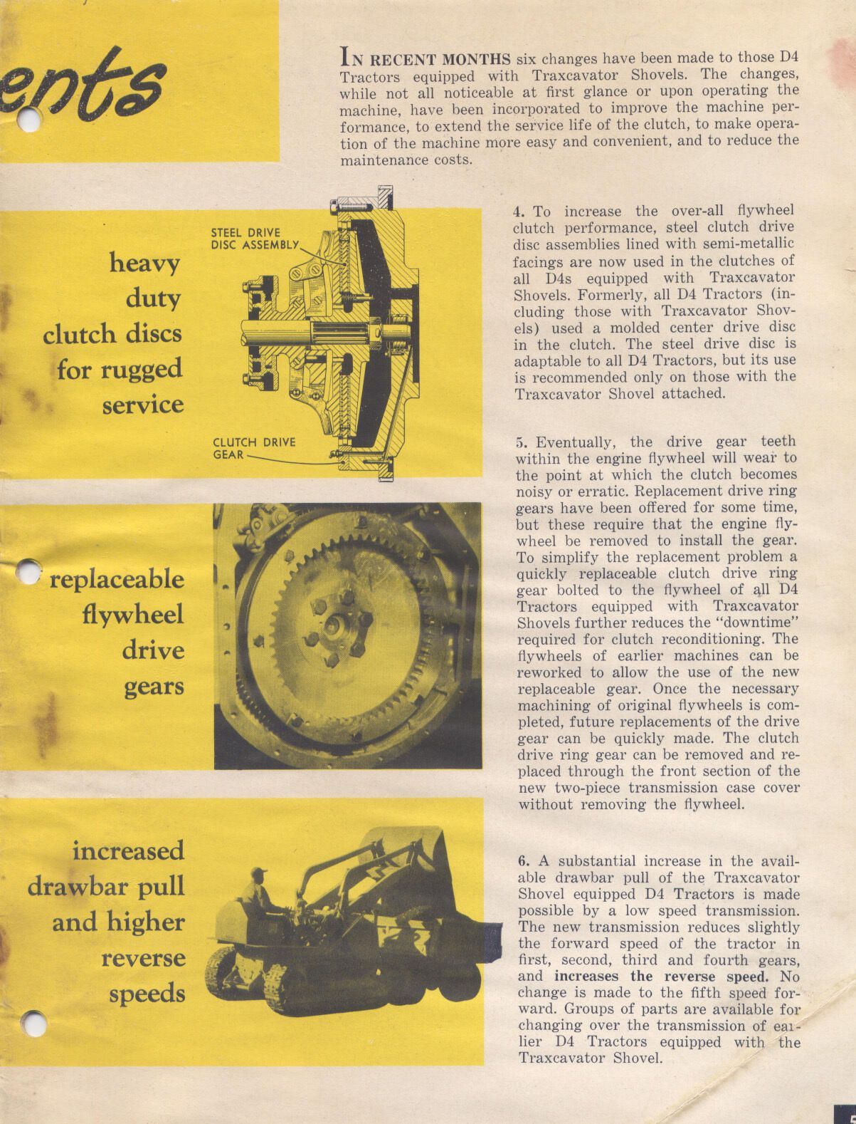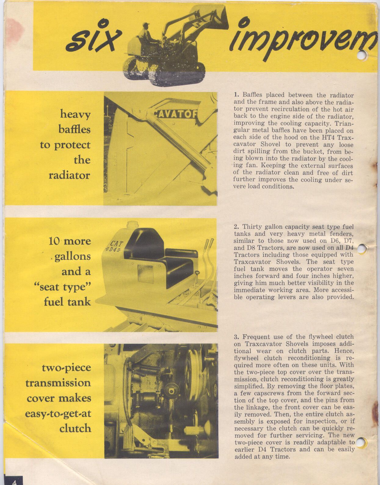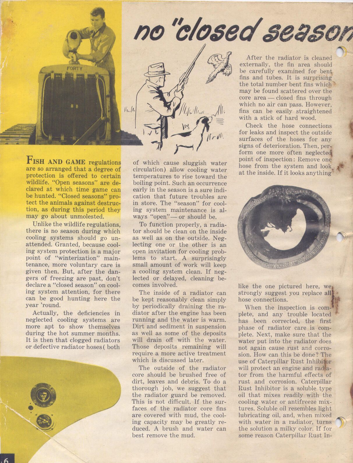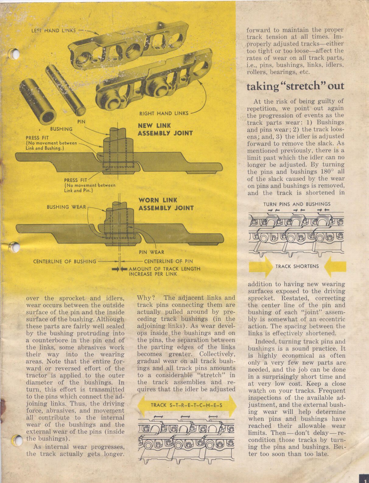 the Caterpillar Service Reporter (Caterpillar Tractor Co. Peoria, Il) features: Scrimshaw, Ropes of steel (steel cables), info on steel cables, Six improvements to the heavy baffles, 10 gallons fuel tank, two-piece transmission, clutch discs, flywheel drive gears and drawbar pull, Cooling systems dos and don'ts, DS tractor parking brake, D8 drive links, and Bellows seals; Conservation methods for salvage or repair of parts and assemblies like: motor graders, tractors, and diesel engines, with exceptionsContext