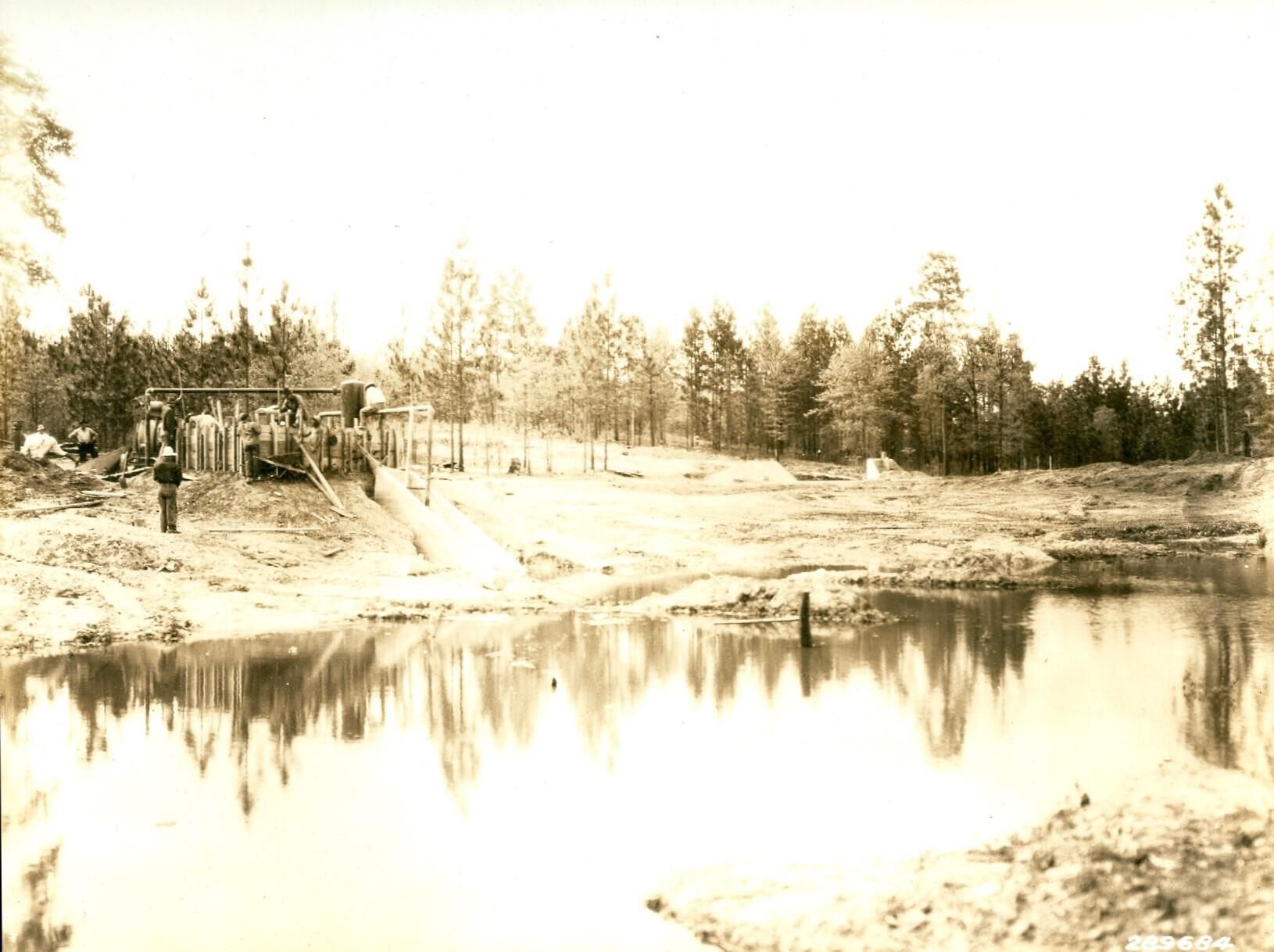 B434-14-1(March 30, 1934 view of the spillway, Catahoula Nursery dam, from inside basin, earthwork of dam not completed - Kisatchie Nat Forest)