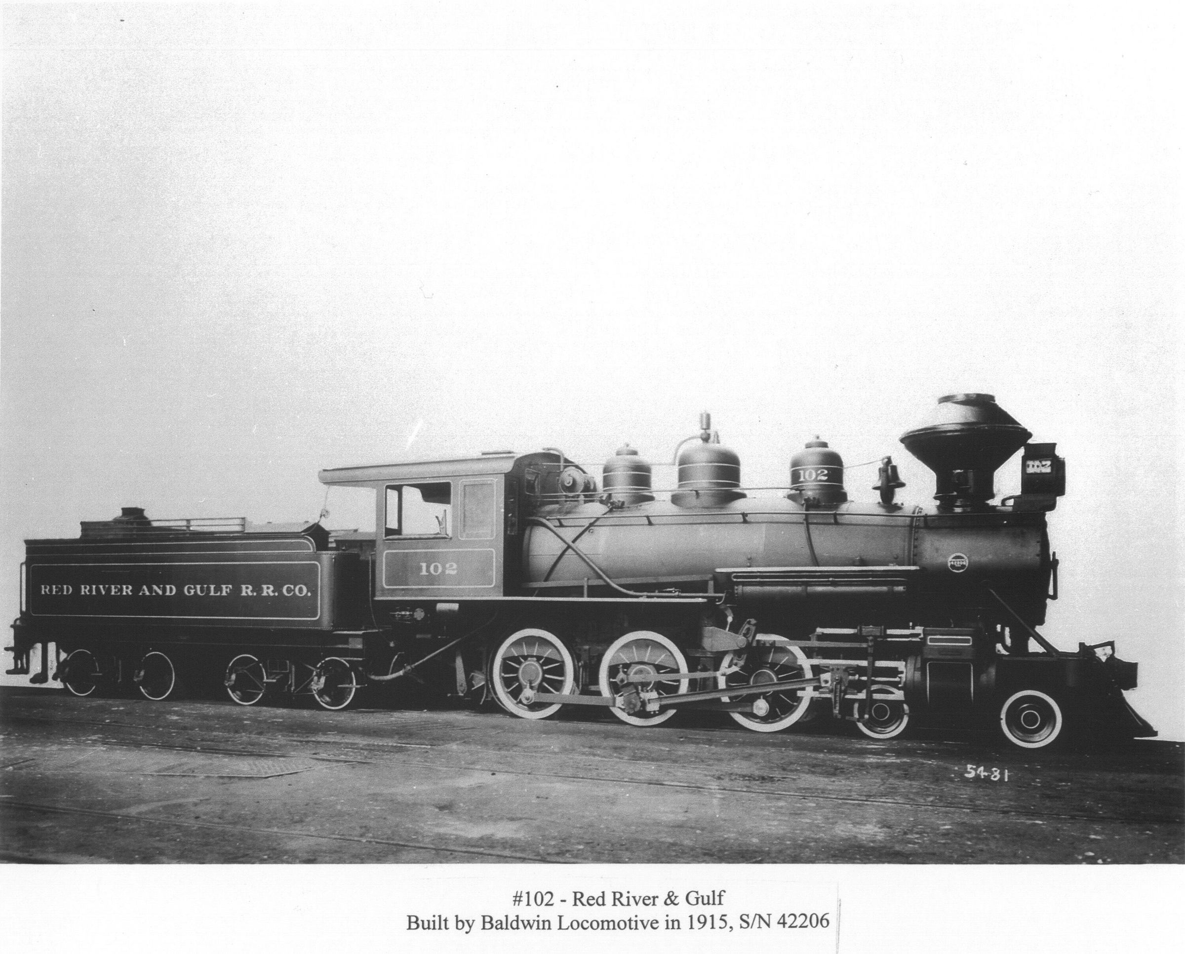 4-6-0 #102 engine; by Baldwin Locomotive; was the second locomotive (in July 1915) of the Red River & Gulf Railroad Co.Photograph Details