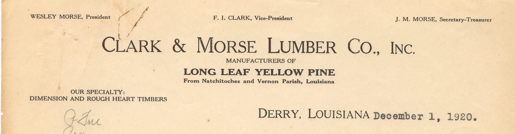 Clark & Morse Lumber Co., Inc. began operations in Derry, Louisiana aiming at extracting yellow pine lumber. However, the company was forced to close down due to local resources drying up.Collection
