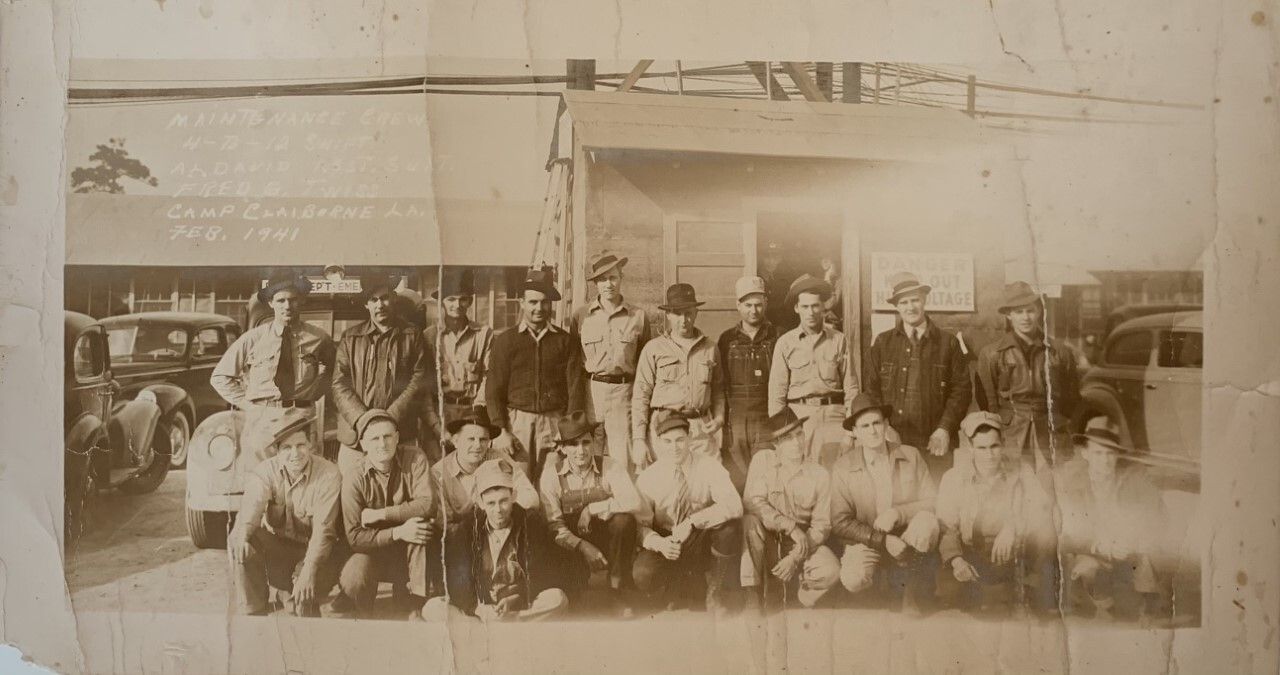 The photograph shows a clear image of the 4-to-12 shift maintenance crew at Camp Claiborne.Collection