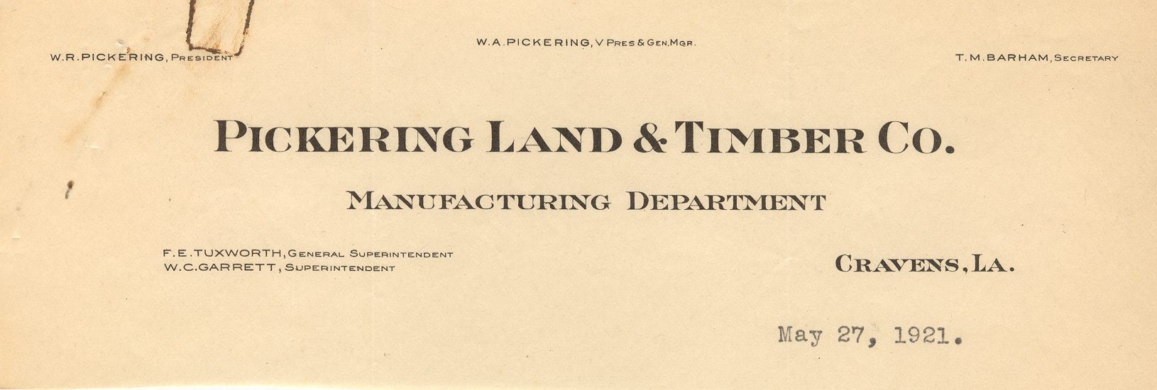 Pickering Land & Timber Co began operations in Cravens, LA during the early years of the Roaring Twenties. The company's focus is around manufacturing development with regarding to the lumber industry. However, the company was forced to close down due to resources drying up in the local area.Collection