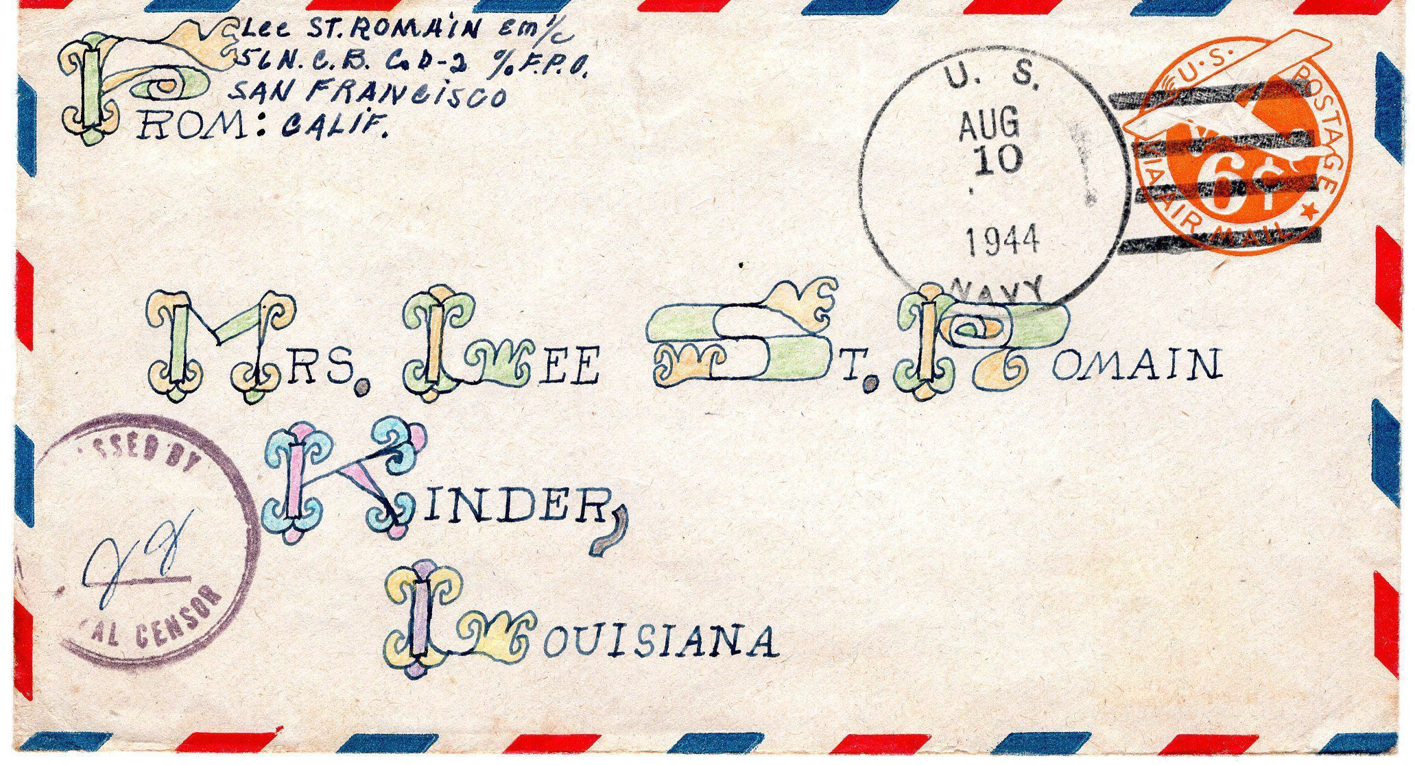 Envelope sent to Mrs. Lee St. Romain in Kinder, LA by Lee St. Romain. The postcard has been decorated with colors and embellished letters. The contents of the envelope were assessed by a postal censor, as was common during wartime, as evidenced by the stamp on the bottom left corner of the envelope.Collection