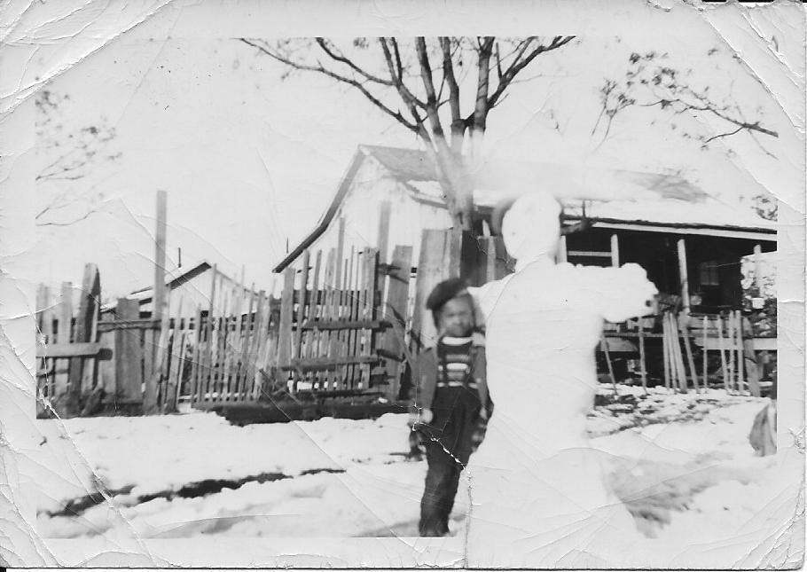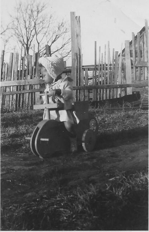 1-2-Connie riding a wooden push bike 3- Connie standing next to a snowman