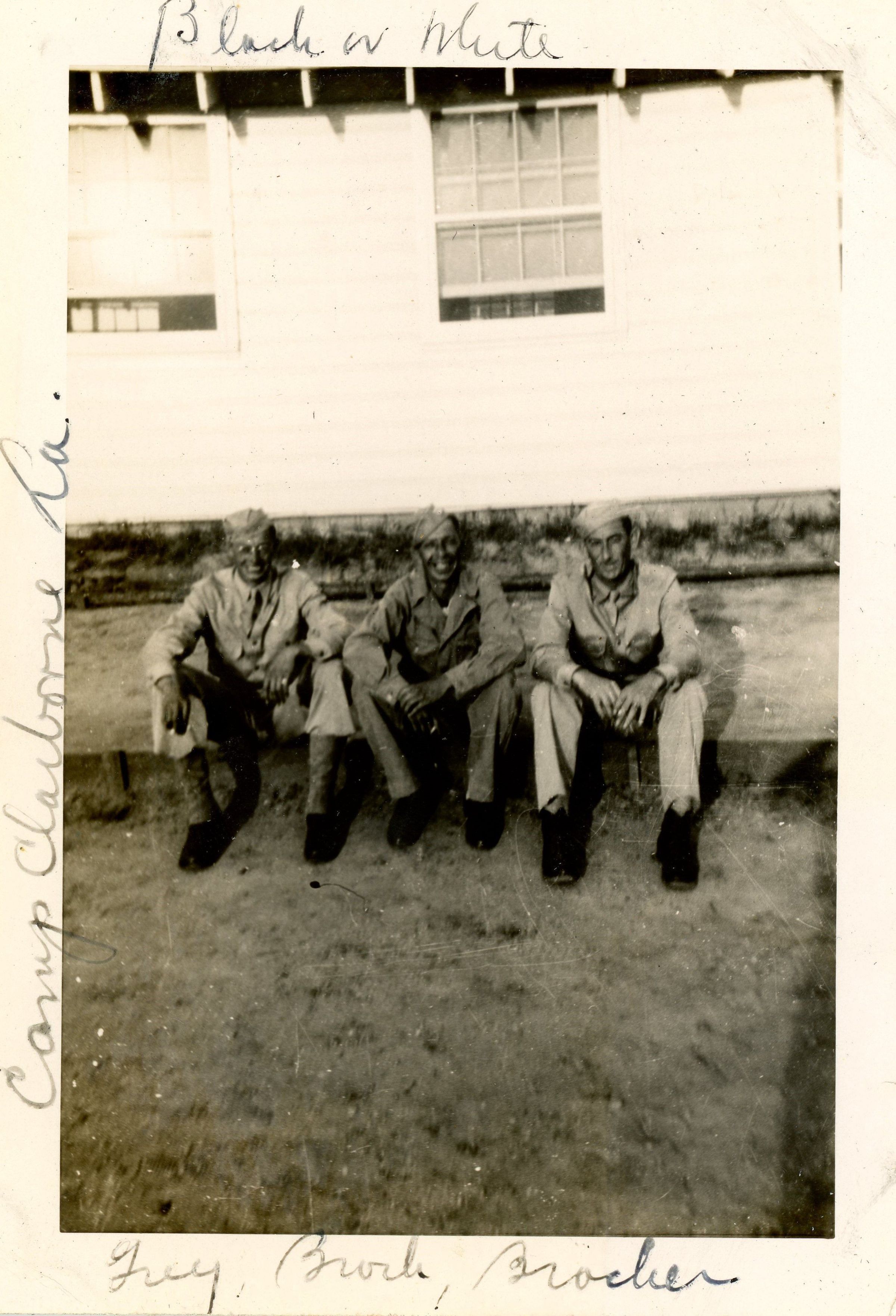Three soldiers smiling for a photo at Camp Claiborne, likely 1943Collection