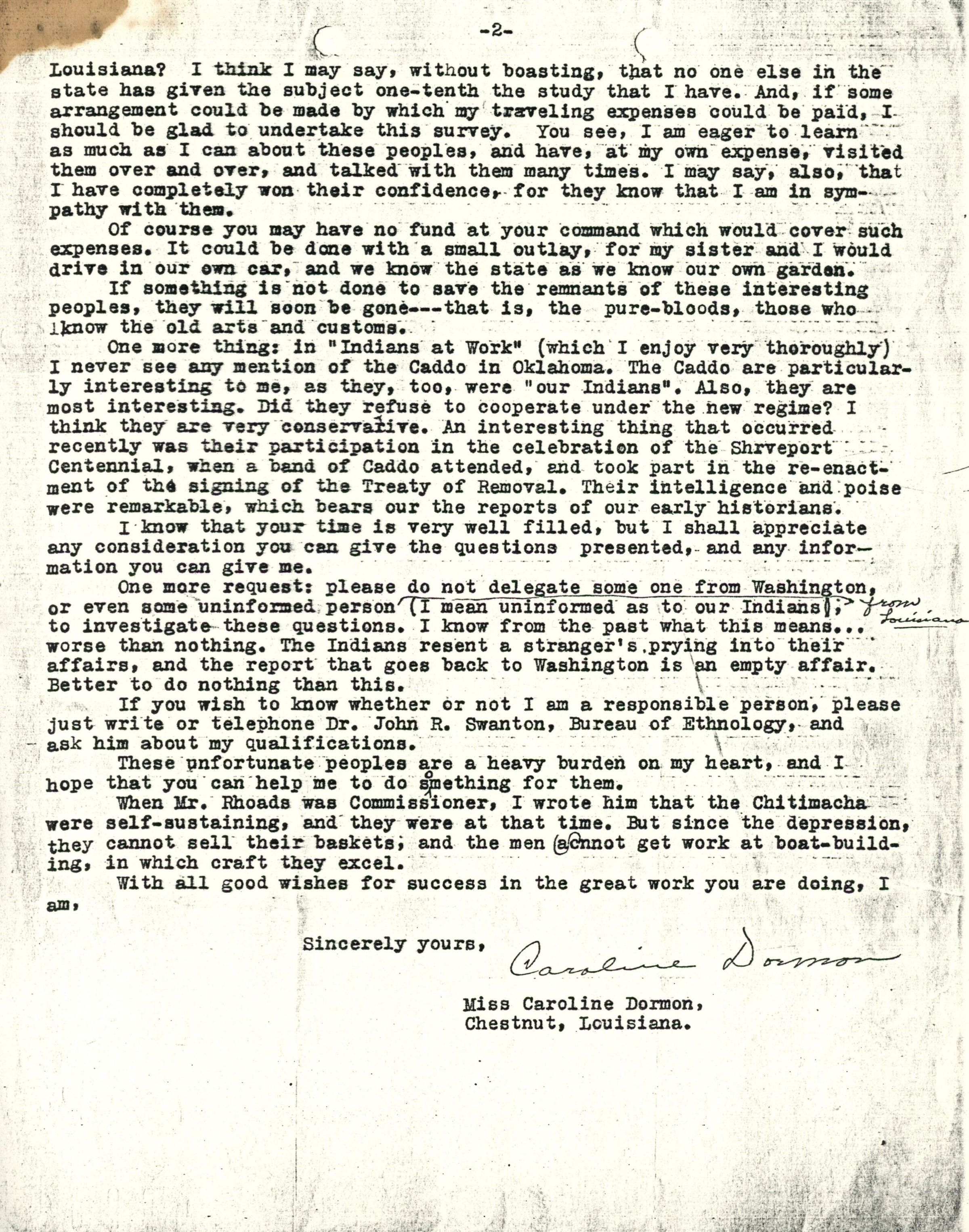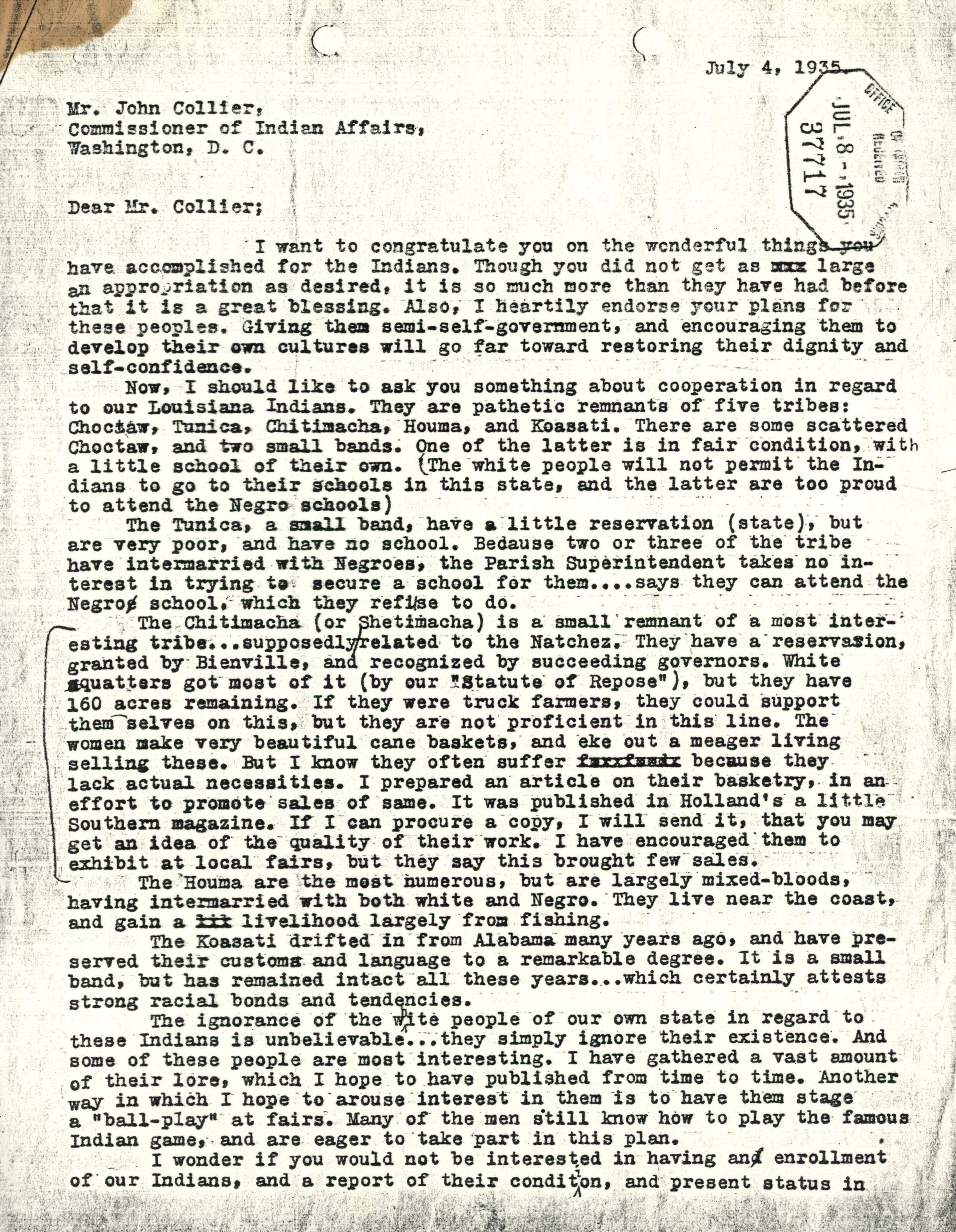 letter to John Collier, the Commissioner of Indian Affairs in D.C. from Caroline Dormon, on Jul 4 1935 and received Jul 8; File no. 37717Collection