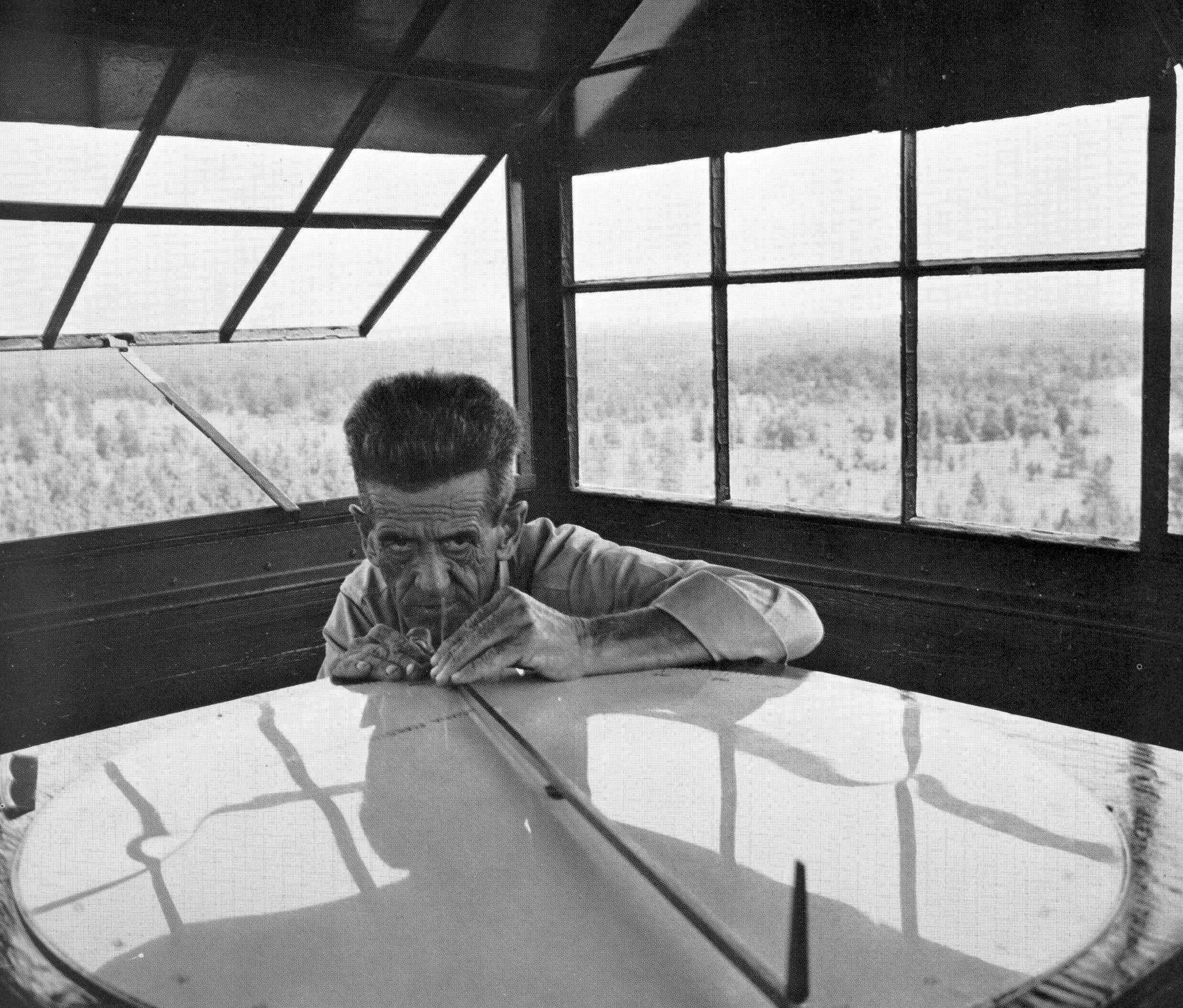 Tower man in a lookout; using an alidade to determine the location of a wildfirePhotograph Details