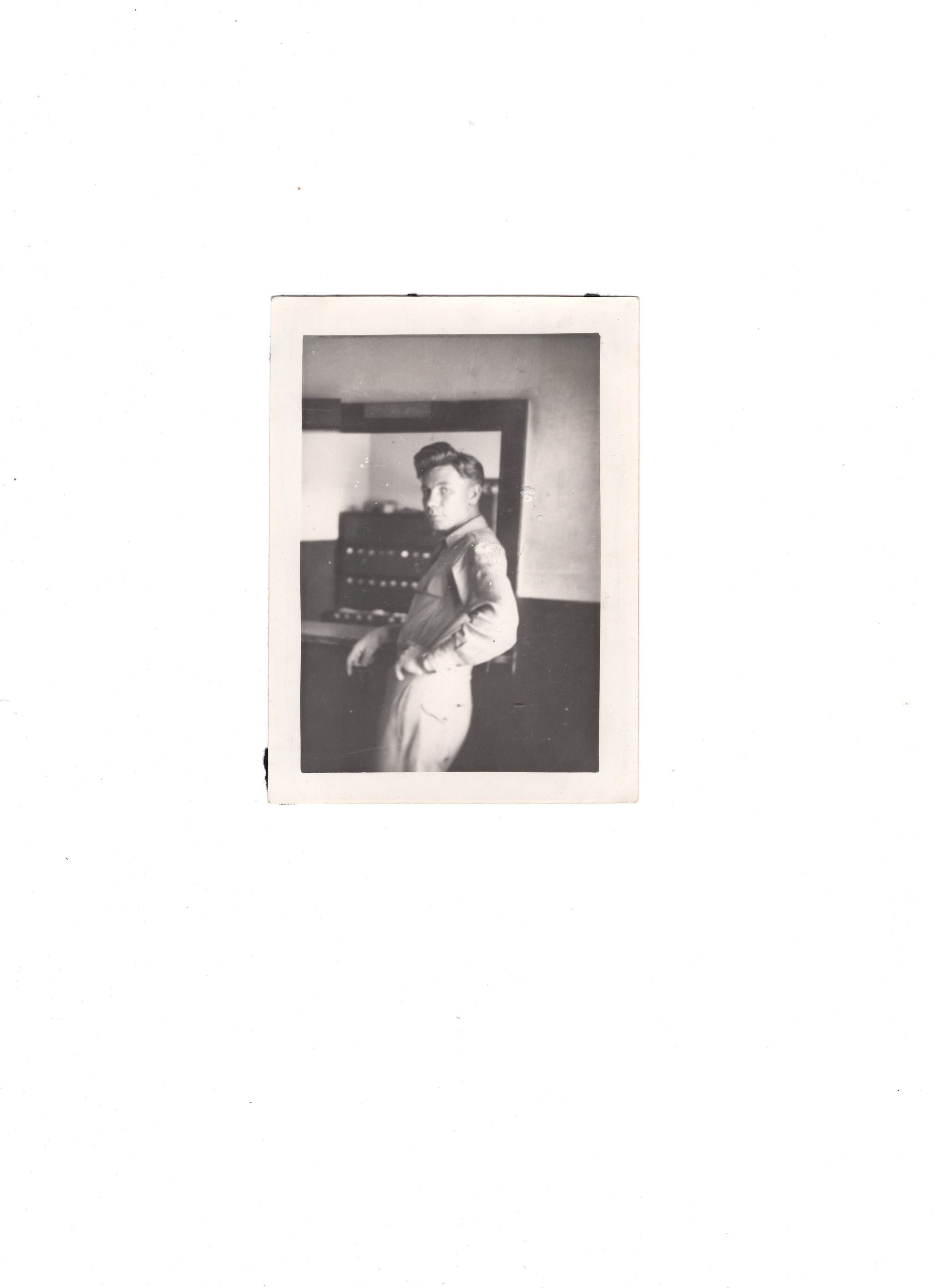 Photo shows a servicemember posed leaning up against a wall/service window. This photo was likely taken at the Camp Claiborne Dental Clinic.Photograph Details