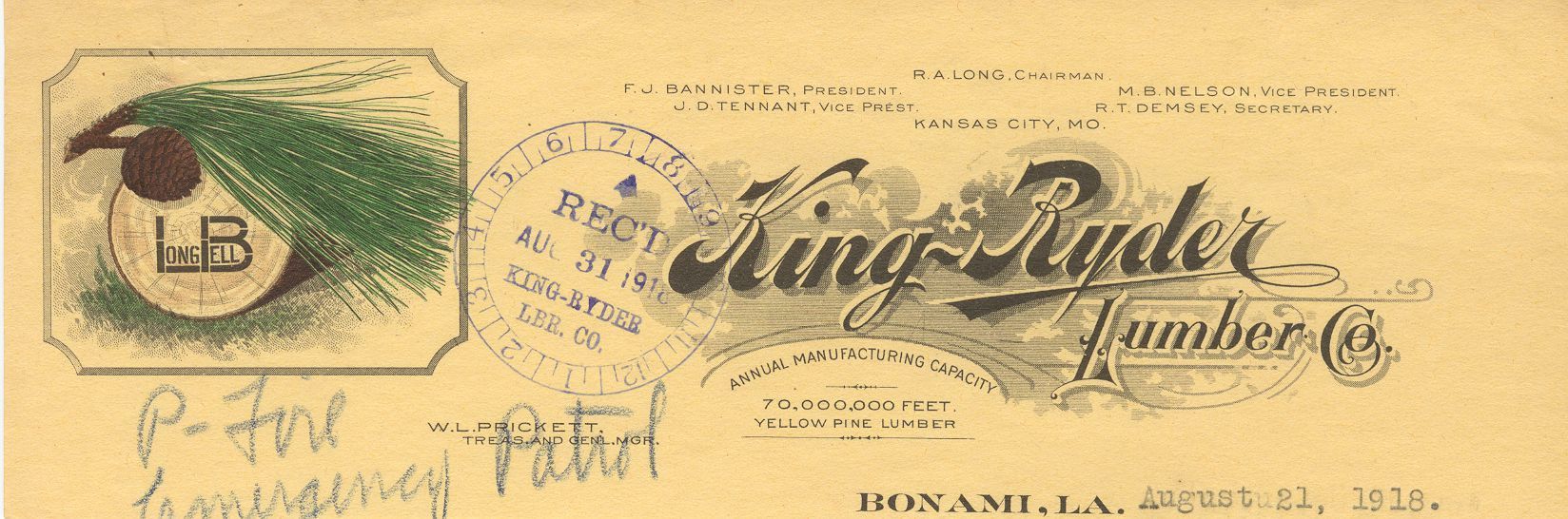 King Ryder Company began operation in Bonami, Louisiana. This lumber company operated during World War I and was part of an overall effort to supply American troops on the front line. Tools and boats were the main items being supplied to the troops from this lumber company.Collection
