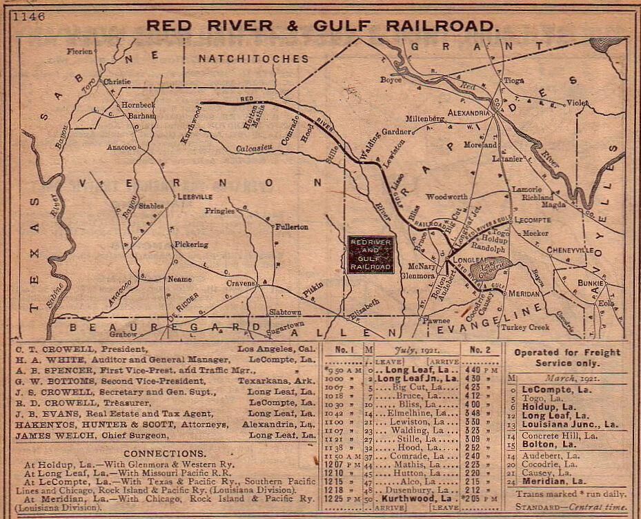 the officials in 1921 were C. T. Crowell president in Los Angeles, H. A. White auditor and general manager in Lecompte, A. B. Spencer first vice president and traffic manger in Lecompte, G. W. Bottoms second vice president in Texarkana, J. S. Crowell secretary and general superintendent in Long Leaf, R. D. Crowell treasurer in Lecompte, J. B. Evans real estate and tax agent in Long Leaf, Hakenyos, Hunter & Scott attorneys in Alexandria, and James Welch chief surgeon in Long Leaf;