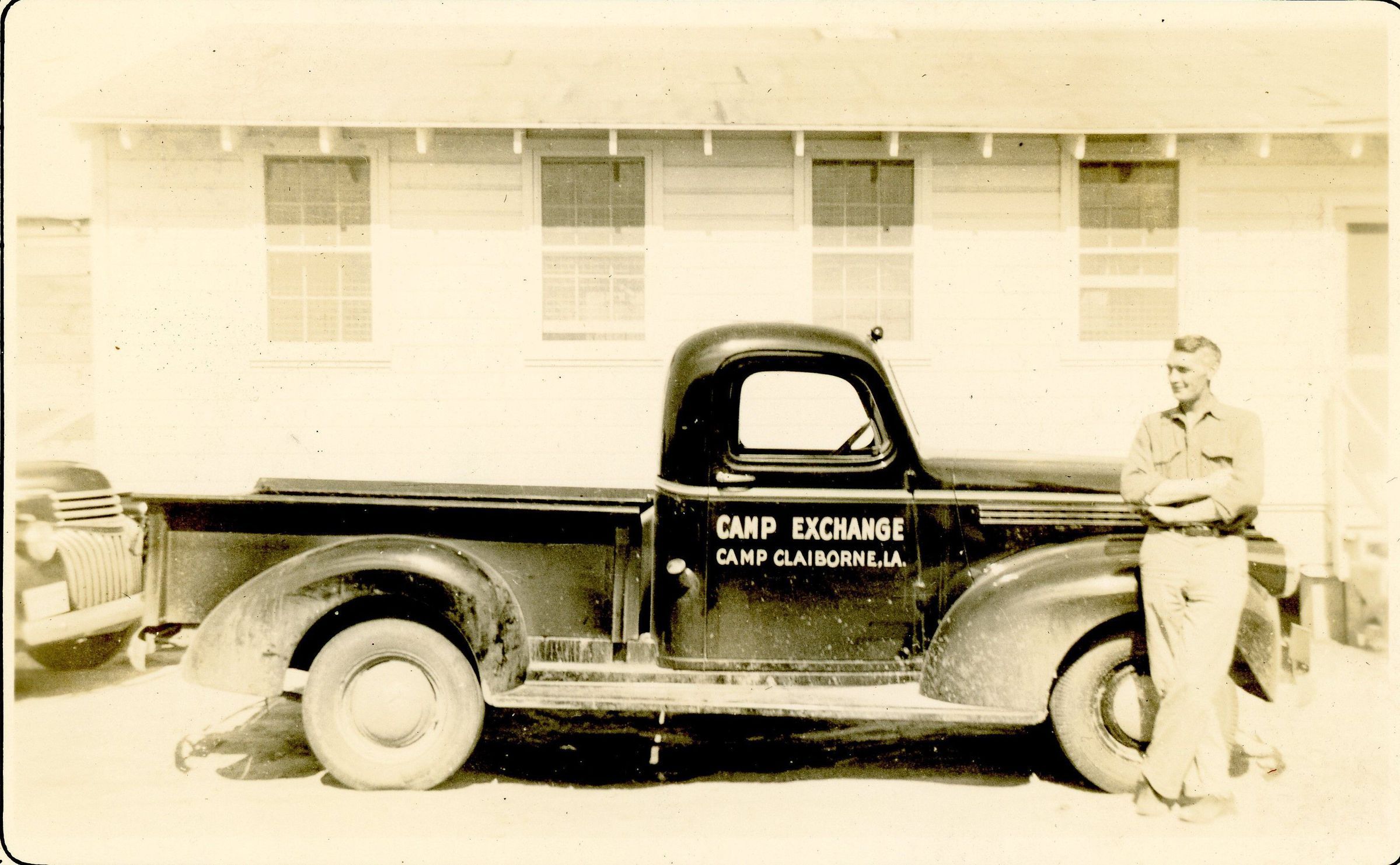 Lew Manders posed in front of camp exchange vehicle.Photograph Details