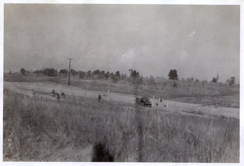 Soldiers run out of a military truck up a hill off the road as part of an exercise.Photograph Details
