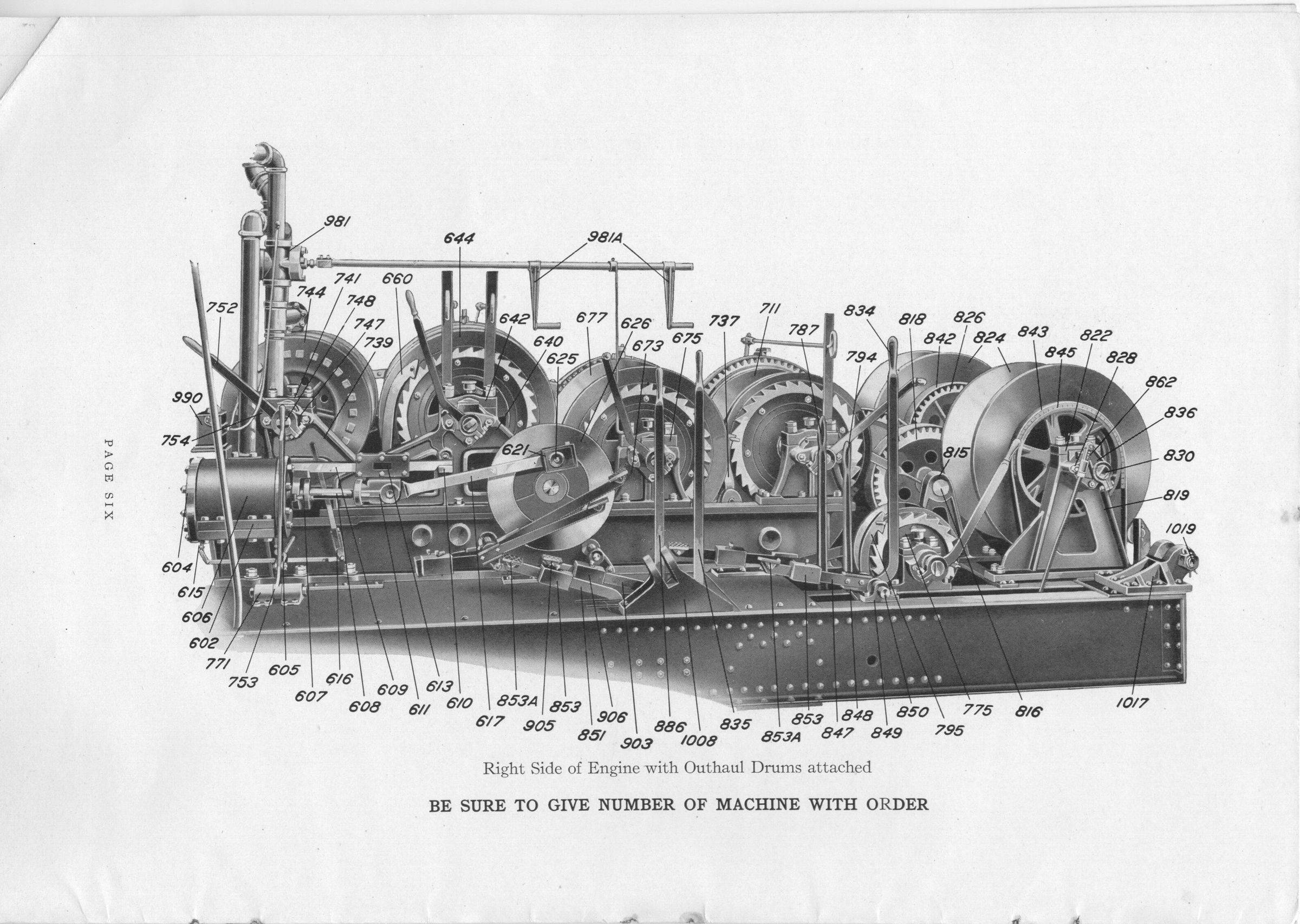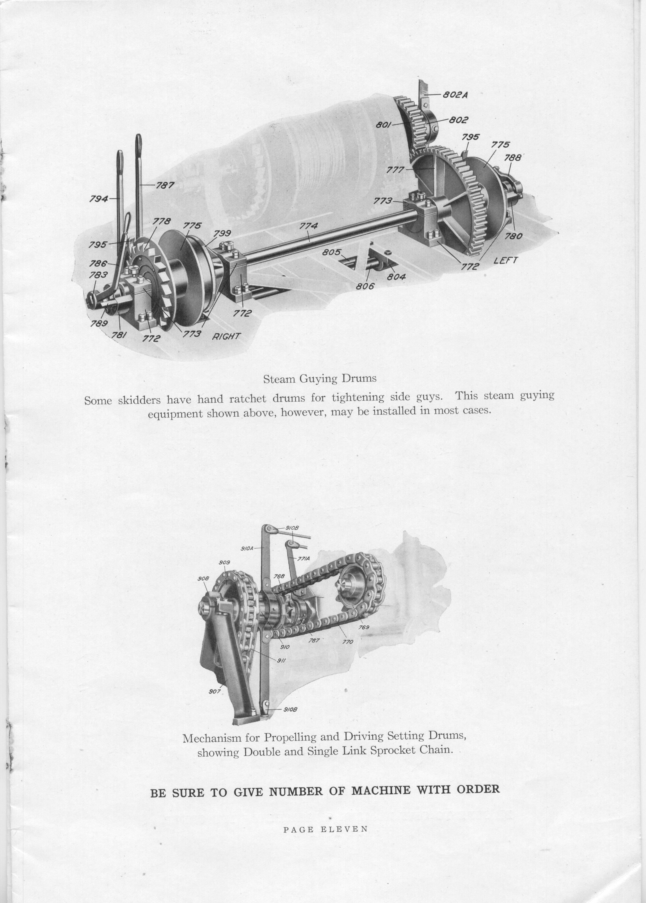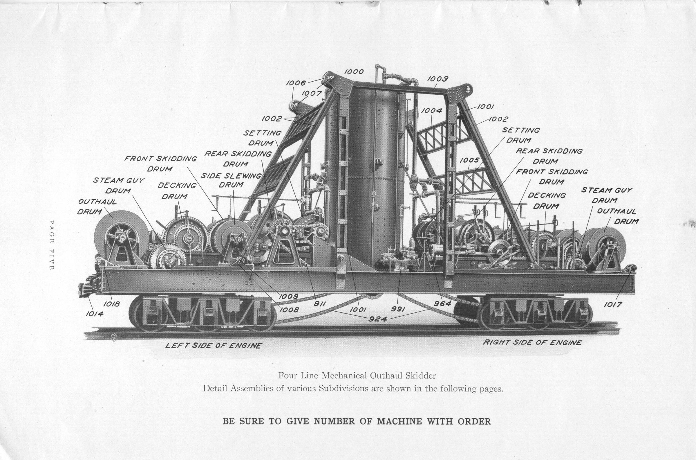 partial, missing pages; features: Four line mechanical outhaul skidder, right side of engine with outhaul drums, Steam guying drums, Mechanism for propelling and driving setting drums with double and single link sprocket chain, Six wheel trucks, Four wheel trucks, Anchor chain, Skidding tongs, Chocker line, Tag line, Skidding blocks, Snatch blocks, Decking block, Outhaul drum parts, Side slewing drum parts, Propelling mechanism parts, and Six wheel trucks partial, missing pages; features: Four line mechanical outhaul skidder, right side of engine with outhaul drums, Steam guying drums, Mechanism for propelling and driving setting drums with double and single link sprocket chain, Six wheel trucks, Four wheel trucks, Anchor chain, Skidding tongs, Chocker line, Tag line, Skidding blocks, Snatch blocks, Decking block, Outhaul drum parts, Side slewing drum parts, Propelling mechanism parts, and Six wheel trucksContext