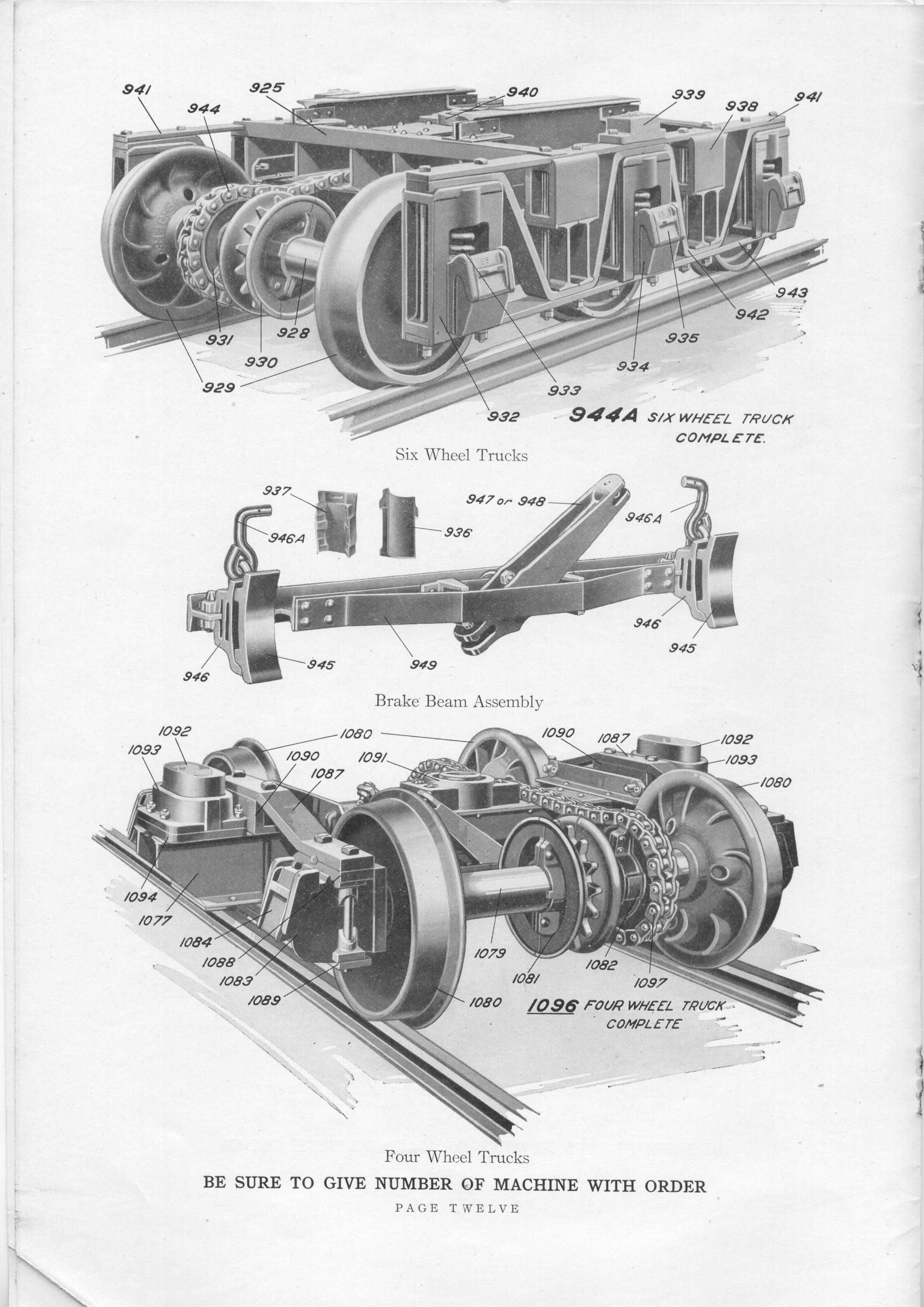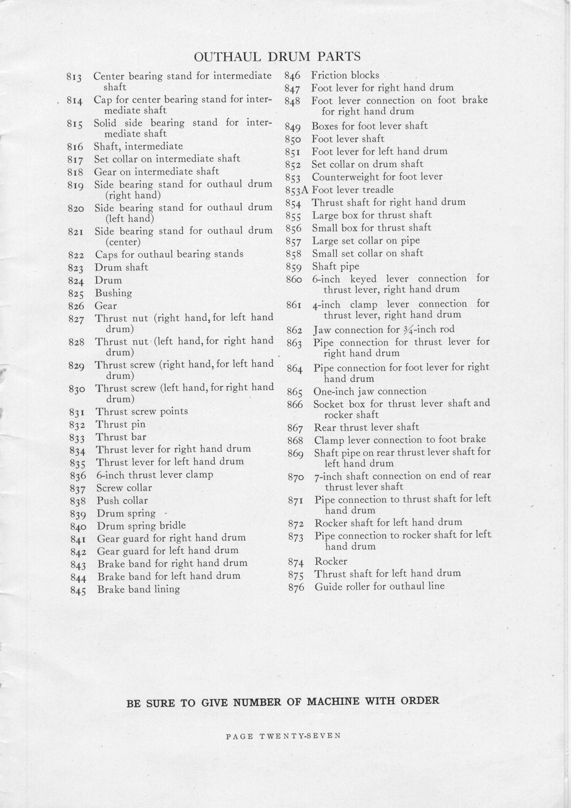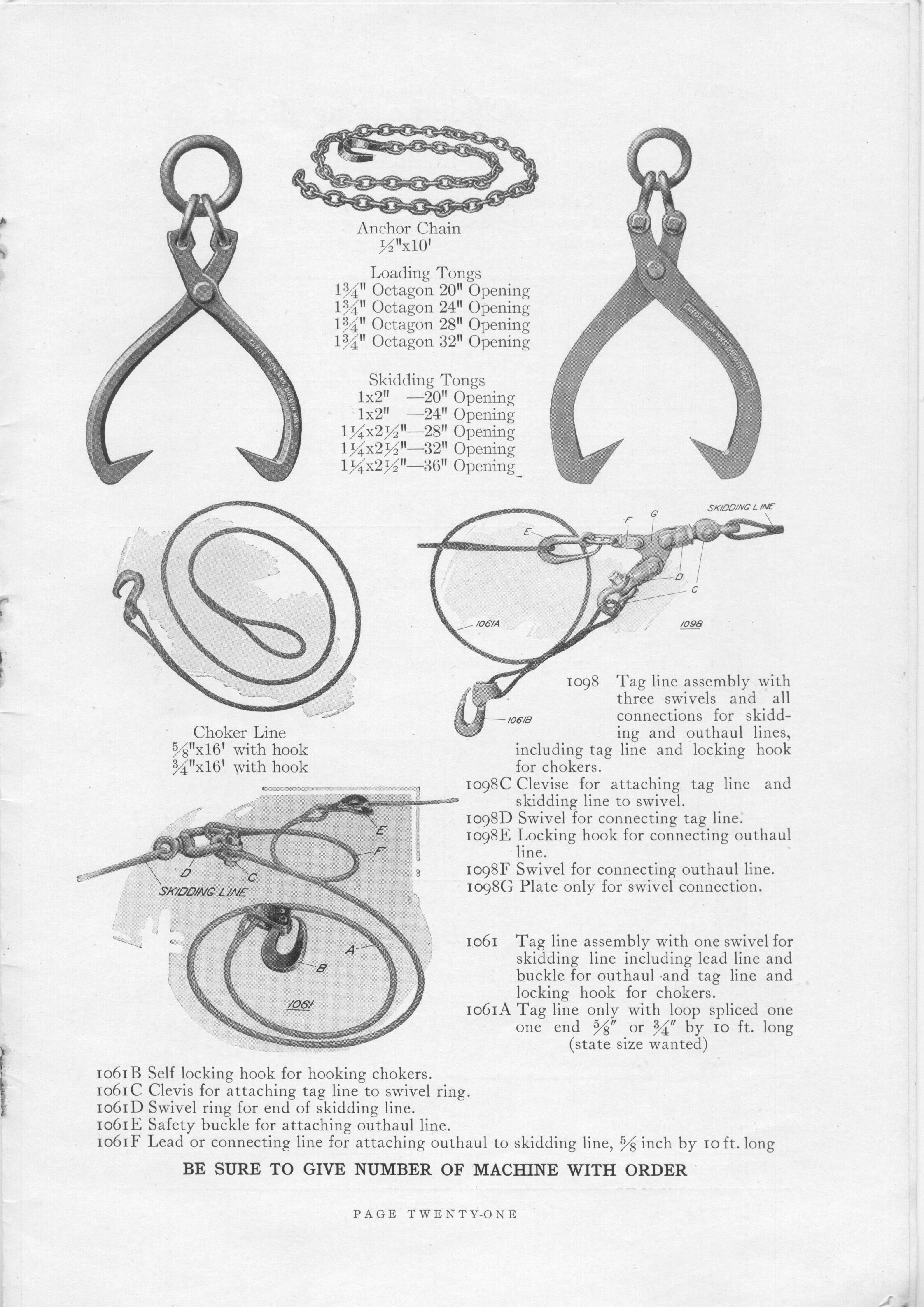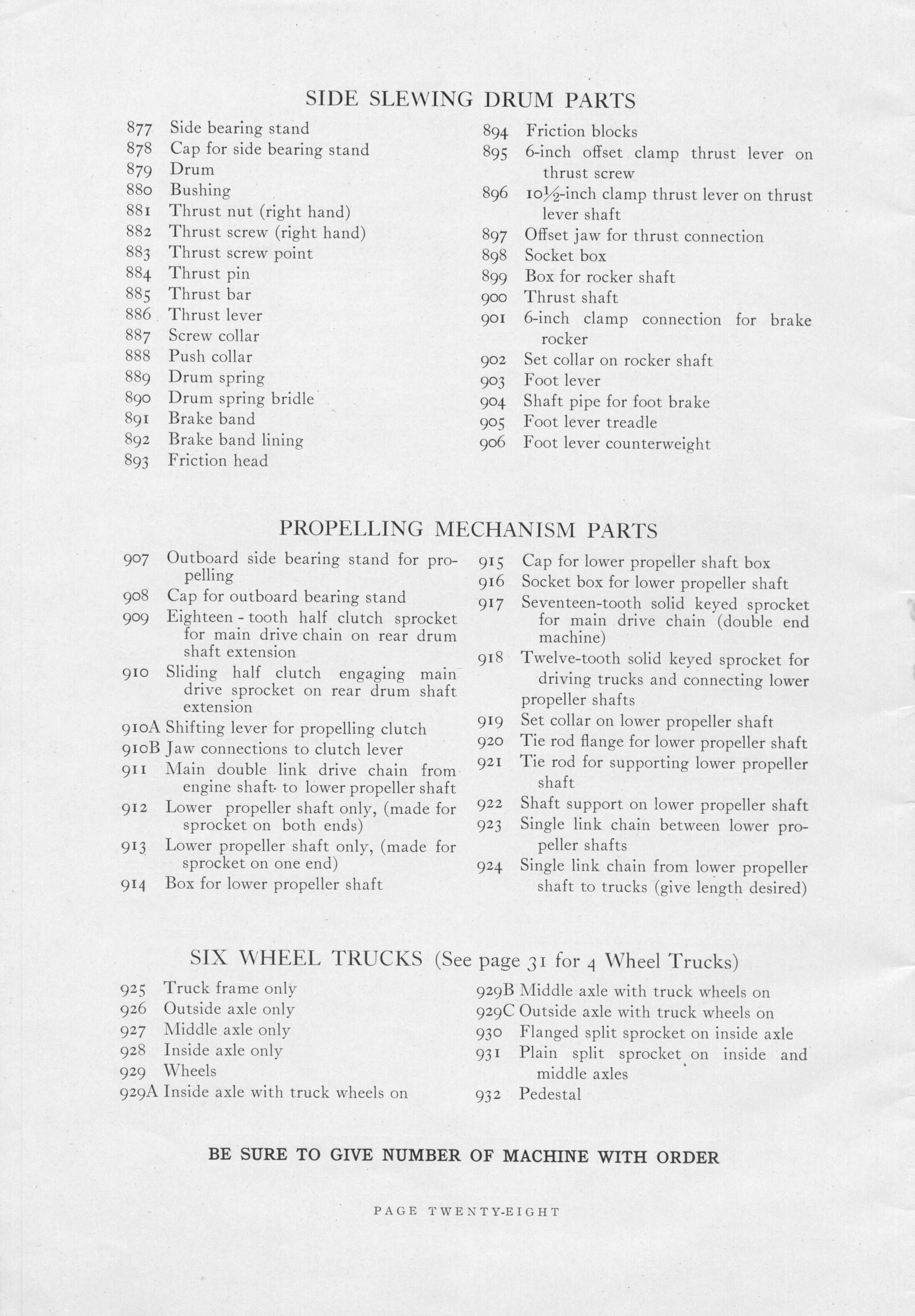 partial, missing pages; features: Four line mechanical outhaul skidder, right side of engine with outhaul drums, Steam guying drums, Mechanism for propelling and driving setting drums with double and single link sprocket chain, Six wheel trucks, Four wheel trucks, Anchor chain, Skidding tongs, Chocker line, Tag line, Skidding blocks, Snatch blocks, Decking block, Outhaul drum parts, Side slewing drum parts, Propelling mechanism parts, and Six wheel trucks partial, missing pages; features: Four line mechanical outhaul skidder, right side of engine with outhaul drums, Steam guying drums, Mechanism for propelling and driving setting drums with double and single link sprocket chain, Six wheel trucks, Four wheel trucks, Anchor chain, Skidding tongs, Chocker line, Tag line, Skidding blocks, Snatch blocks, Decking block, Outhaul drum parts, Side slewing drum parts, Propelling mechanism parts, and Six wheel trucksContext