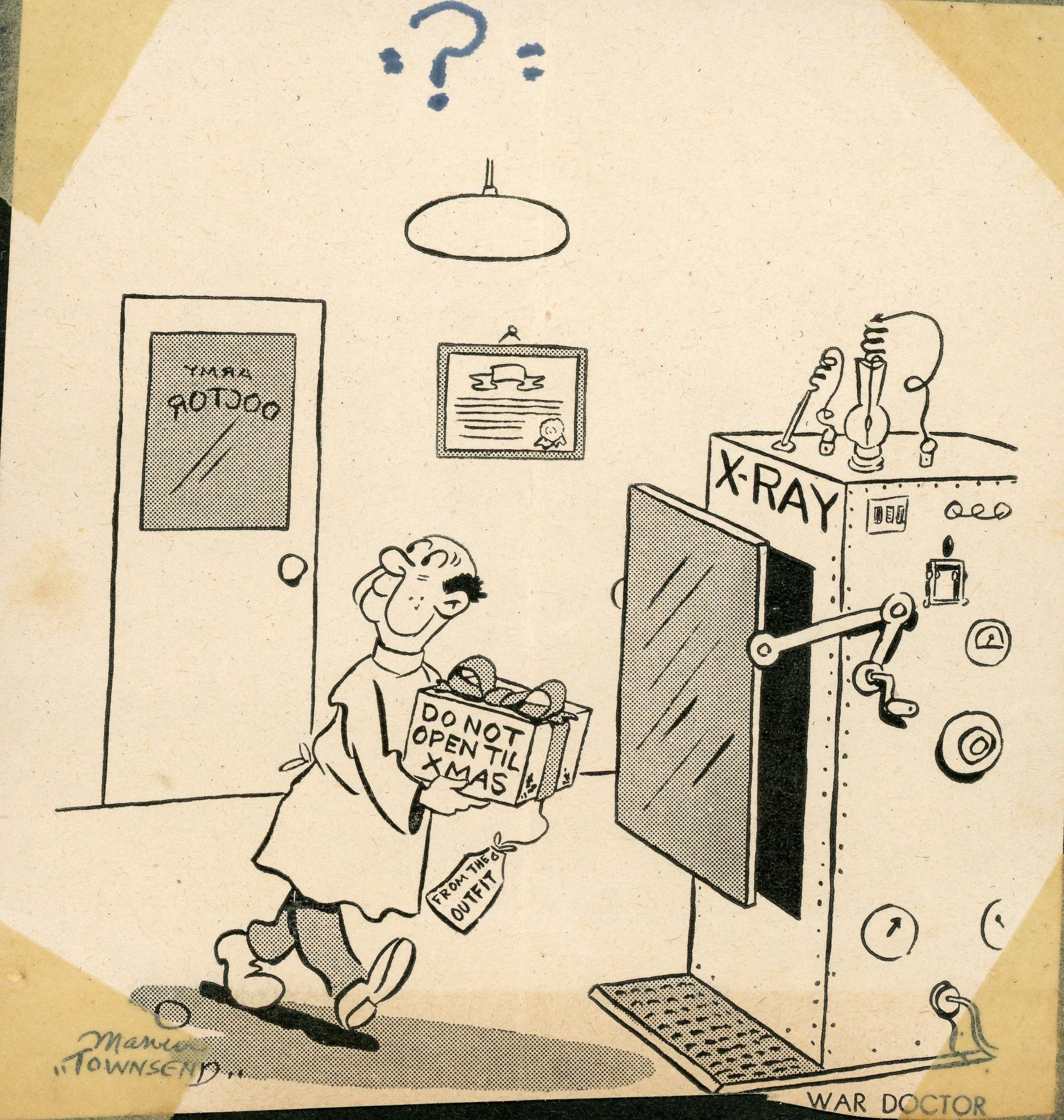 Single Pane Comic Titled "War Doctor" by "Townsend;" depicting a Doctor intending to place a Christmas gift into an X-ray machine as to not disobey the note instructing him "Do Not Open Til XMAS"Context